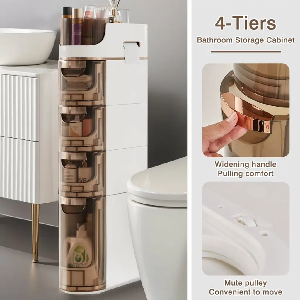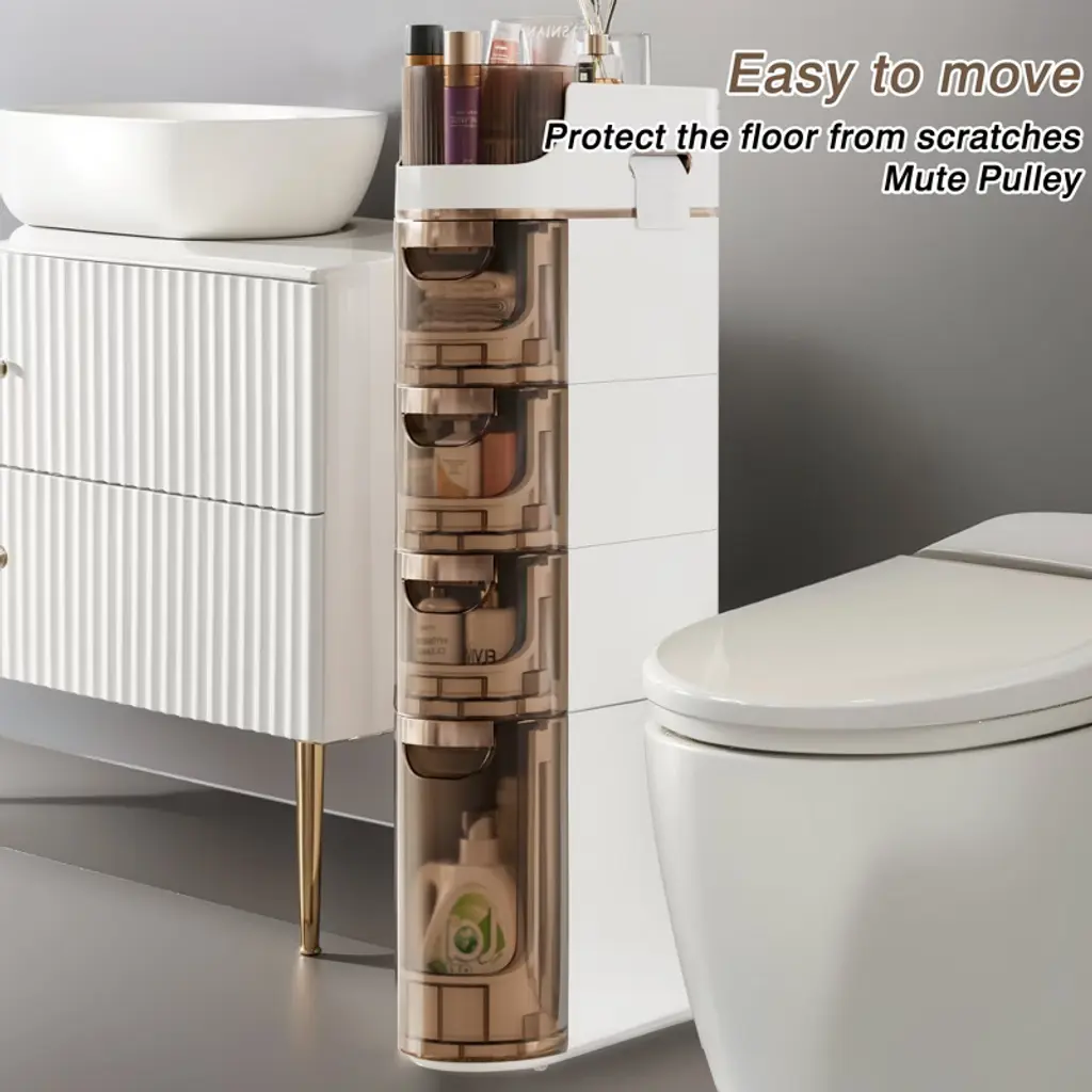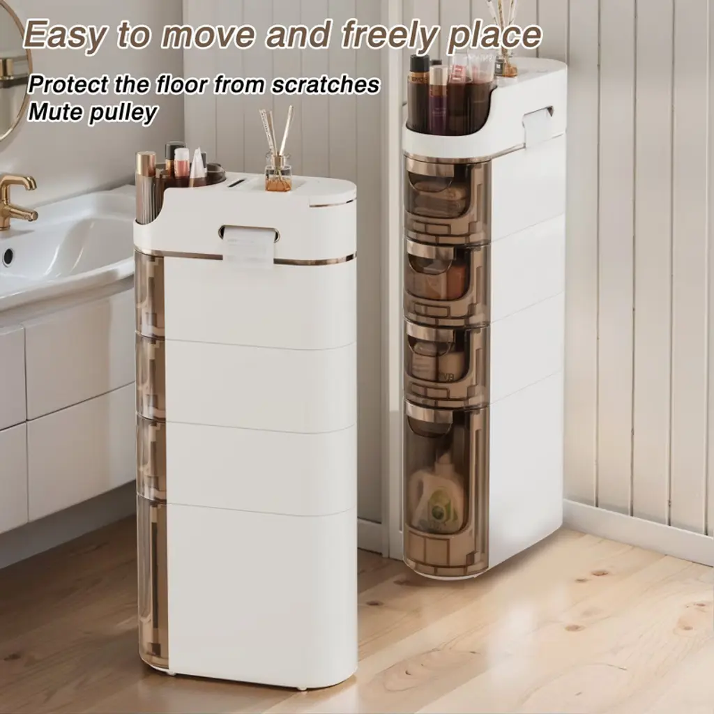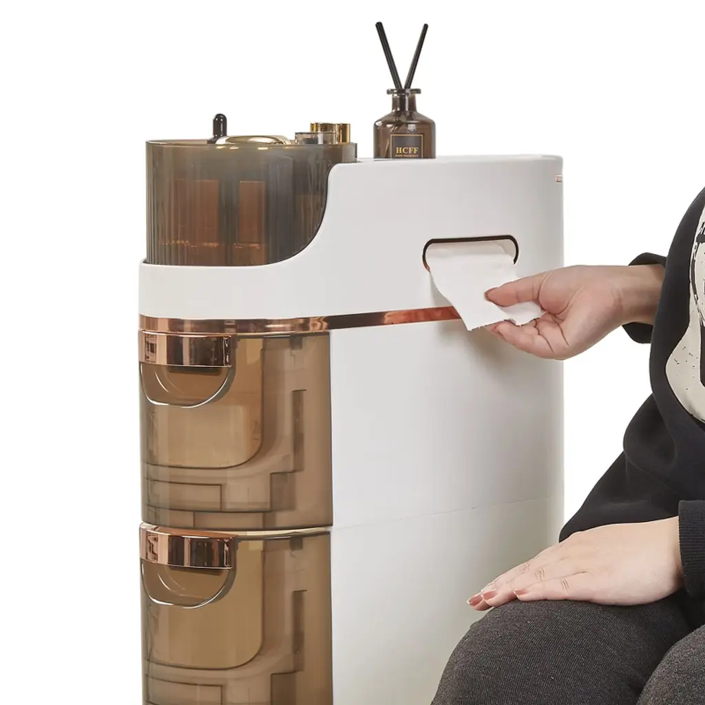 VECELO narrow bathroom storage cabinet is perfect for storing toilet paper and bathroom products and is designed to fit into tight spaces to maximize storage in tight spaces. Made from high quality plastic, this bathroom cabinet is moisture and mould resistant, making it perfect for bathrooms and laundry rooms. With one large and three small drawers, a swivelling, washable tray, double-sided paper towel holder and a top compartment, this slim bathroom cabinet is easy to clean while keeping stored items at a glance. Sleek wheels make it easy to move around without scratching your floors. Ready to use right out of the box, it instantly refreshes your bathroom.