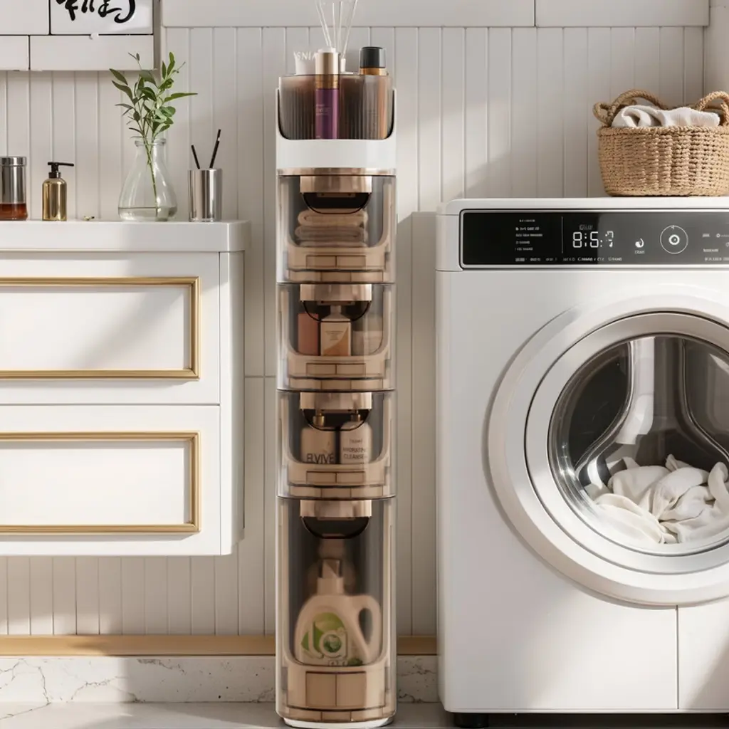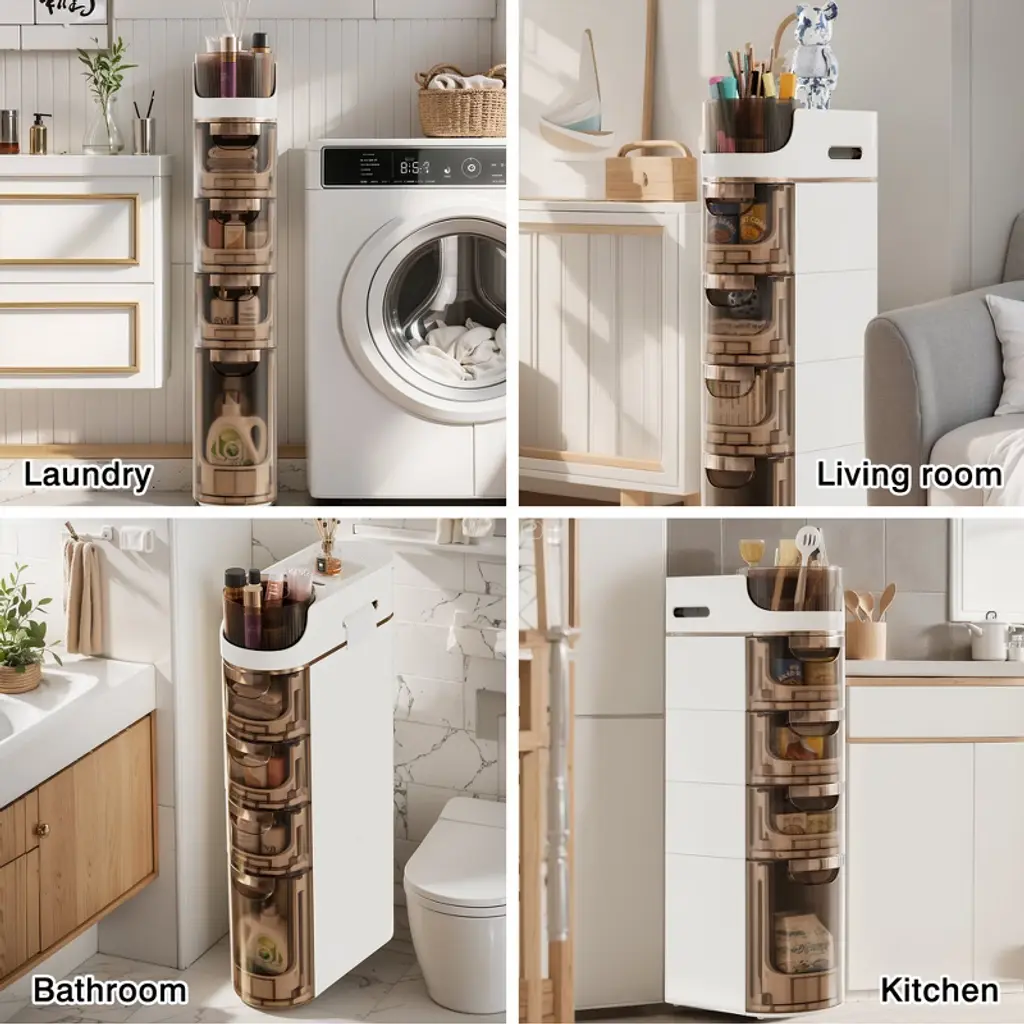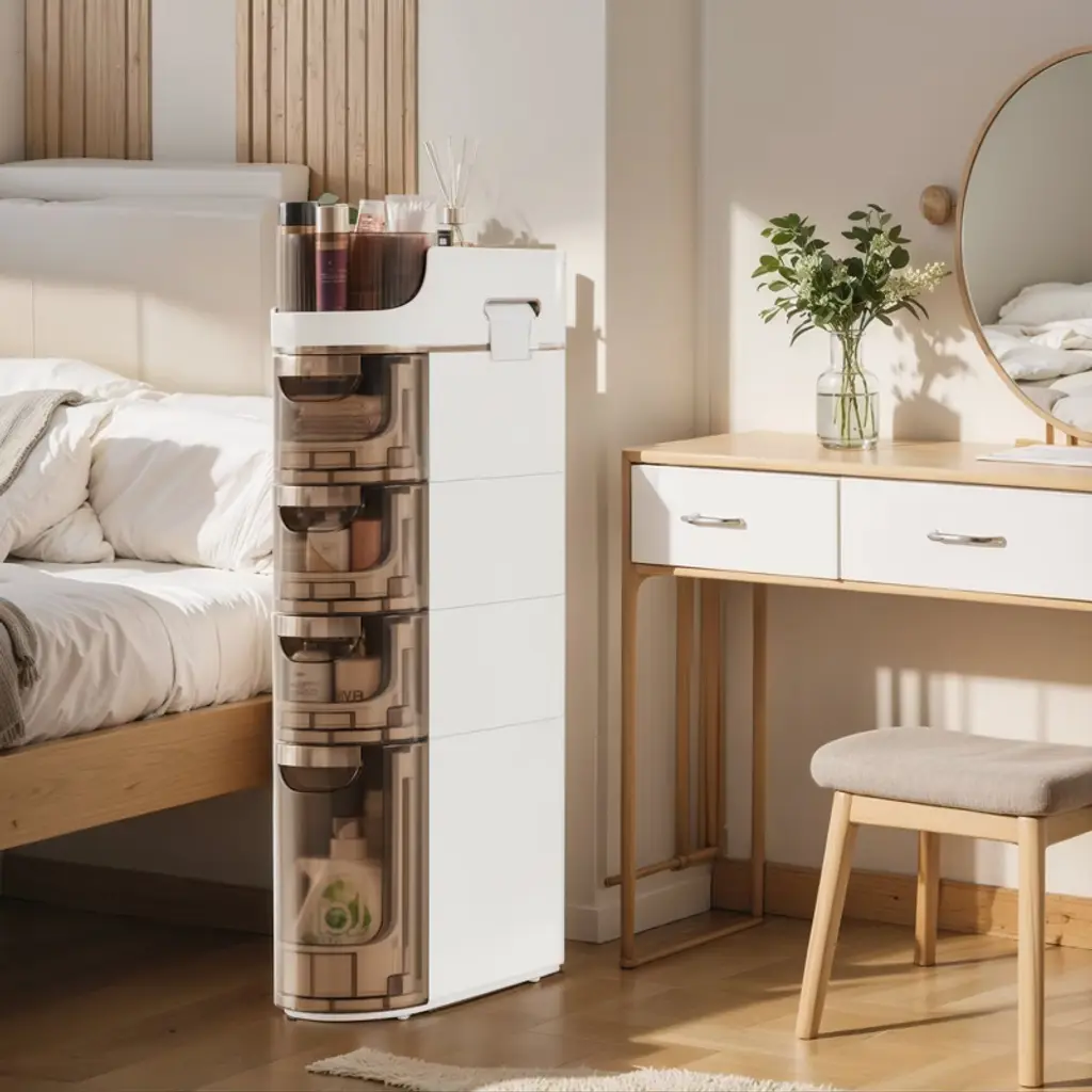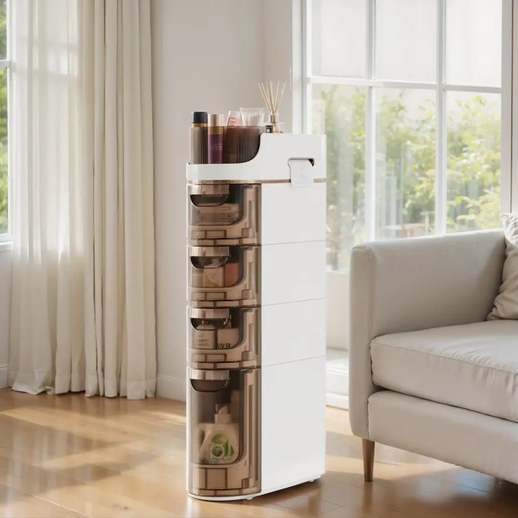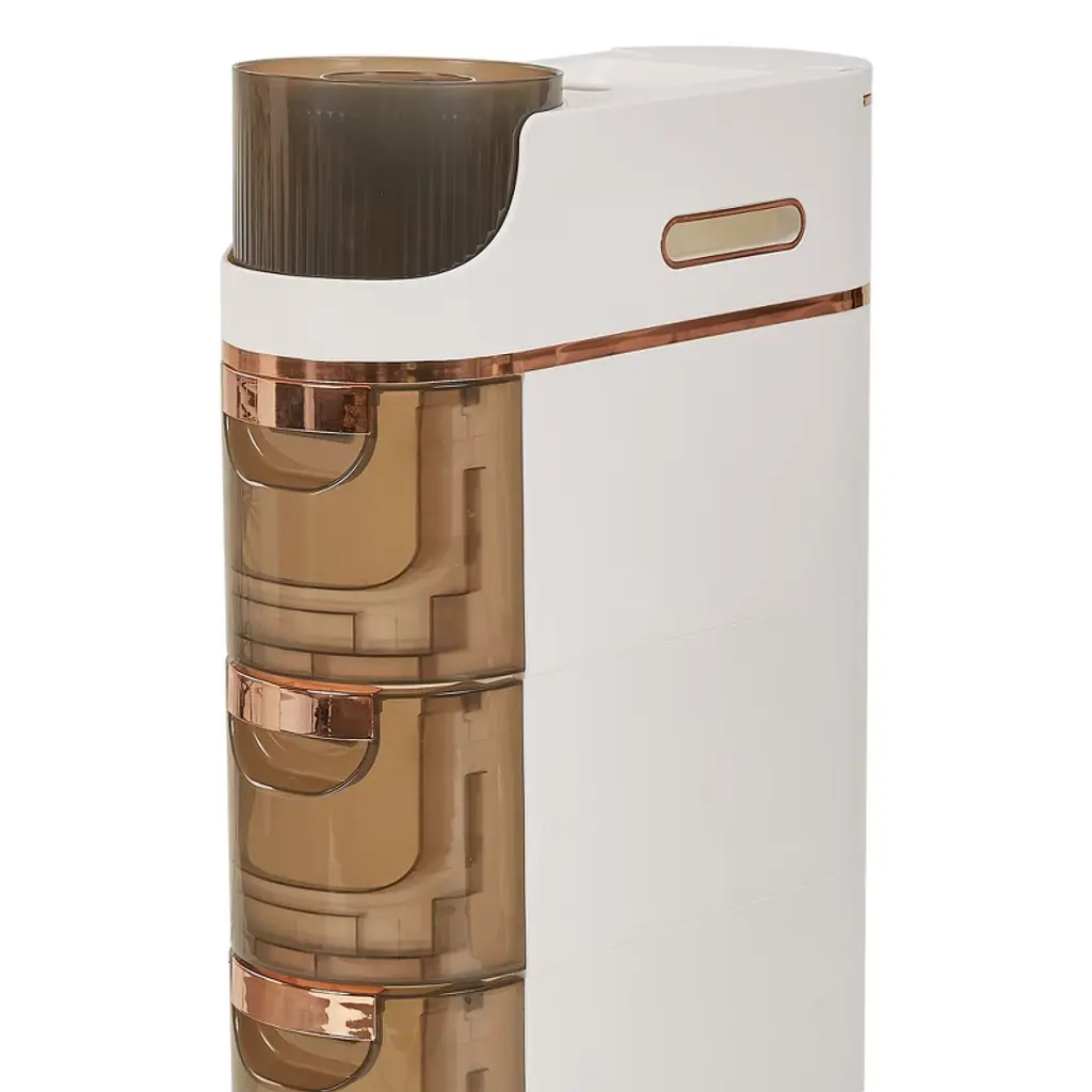 VECELO narrow bathroom storage cabinet is perfect for storing toilet paper and bathroom products and is designed to fit into tight spaces to maximize storage in tight spaces. Made from high quality plastic, this bathroom cabinet is moisture and mould resistant, making it perfect for bathrooms and laundry rooms. With one large and three small drawers, a swivelling, washable tray, double-sided paper towel holder and a top compartment, this slim bathroom cabinet is easy to clean while keeping stored items at a glance. Sleek wheels make it easy to move around without scratching your floors. Ready to use right out of the box, it instantly refreshes your bathroom.