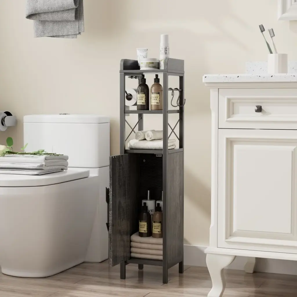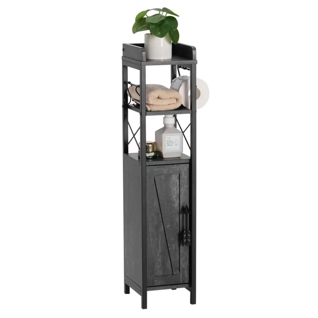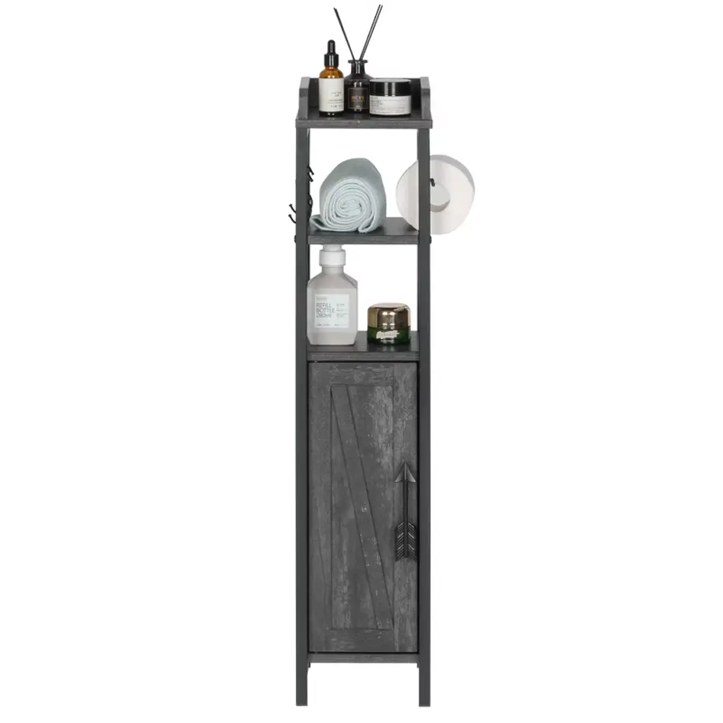Say goodbye to clutter with this slim bathroom cabinet, designed to fit seamlessly into small spaces while providing ample storage! Featuring a fenced top to prevent small items from falling, two open shelves for toiletries, and a hidden cabinet for toilet paper storage, this bathroom organizer keeps everything neatly in place. The waterproof coating makes it perfect for moist environments, while the farmhouse rustic design adds a touch of elegance to your space. Upgrade your bathroom storage solution today! 🚽✨