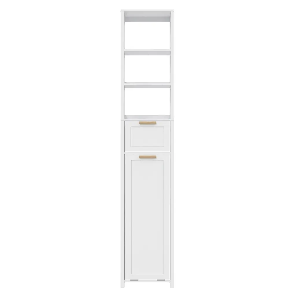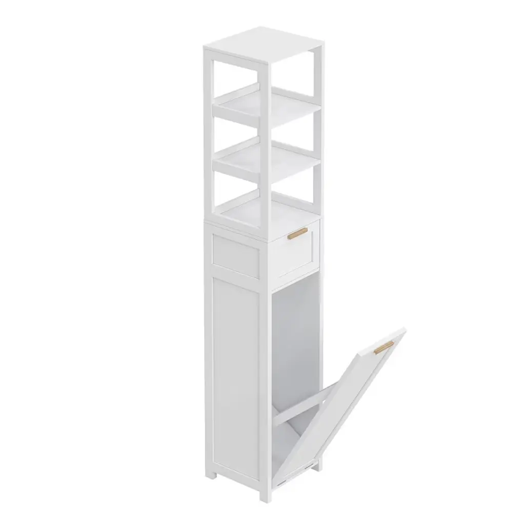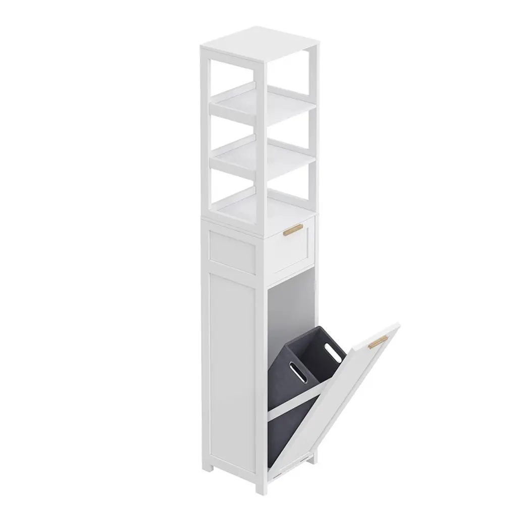 Vecelo Tall Tilt Out Laundry Hamper Cabinet With Removable Laundry Basket, Floor Standing Bathroom Organizer With 1 Drawer & 3 Open Shelves, White