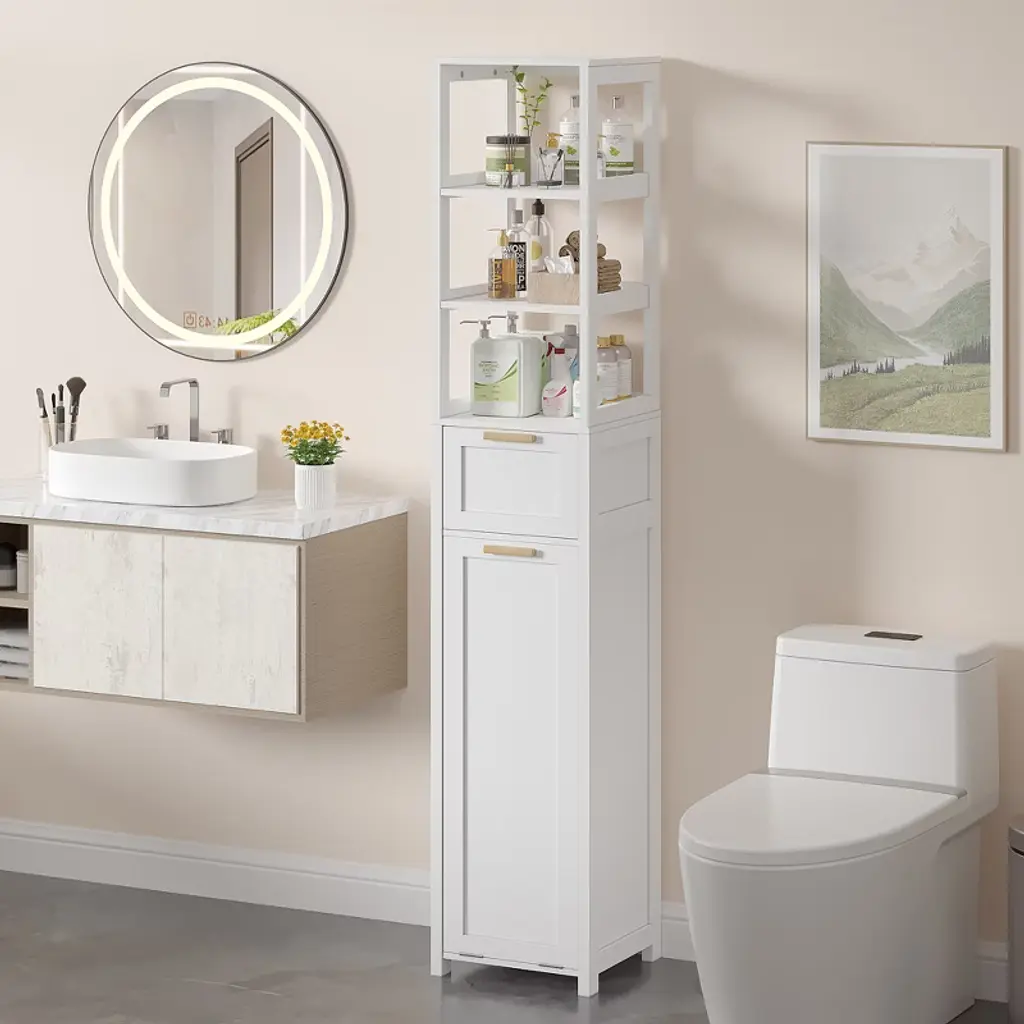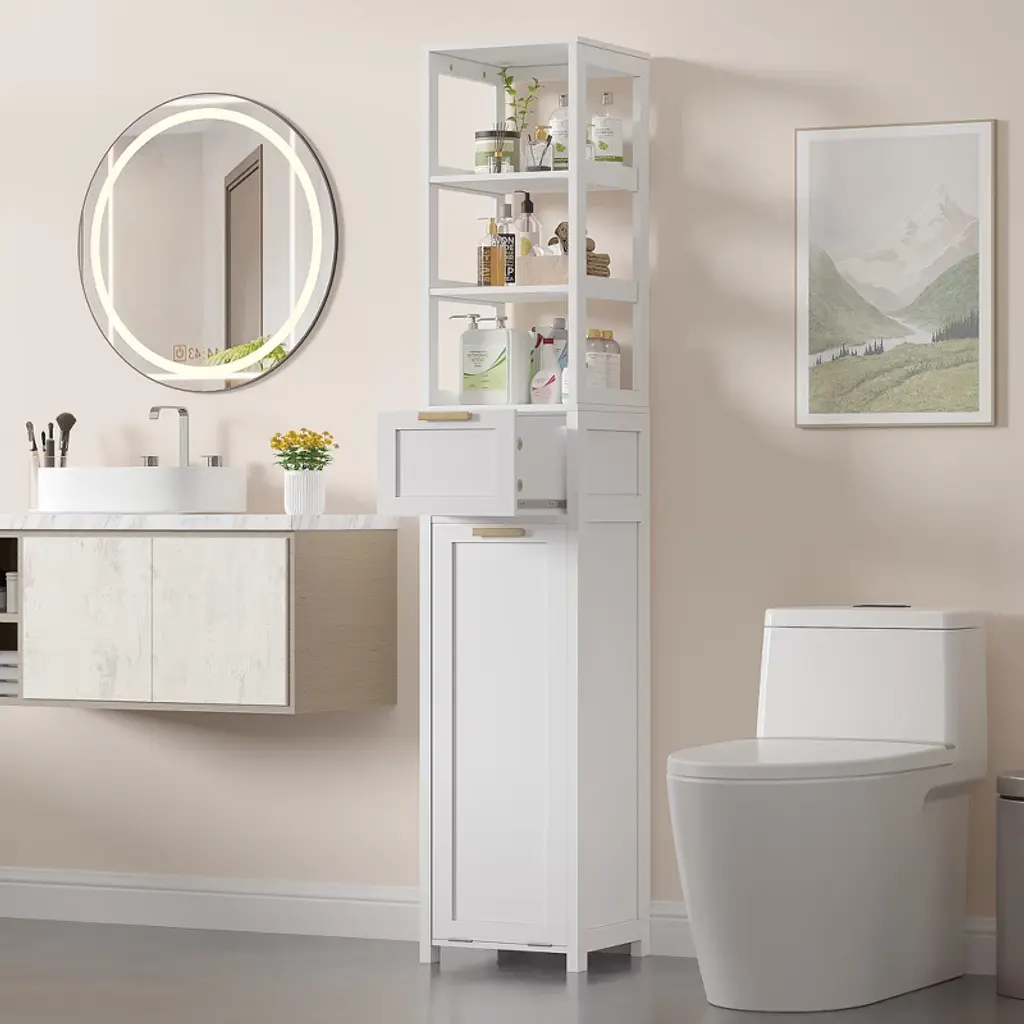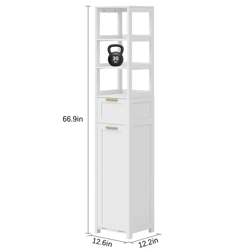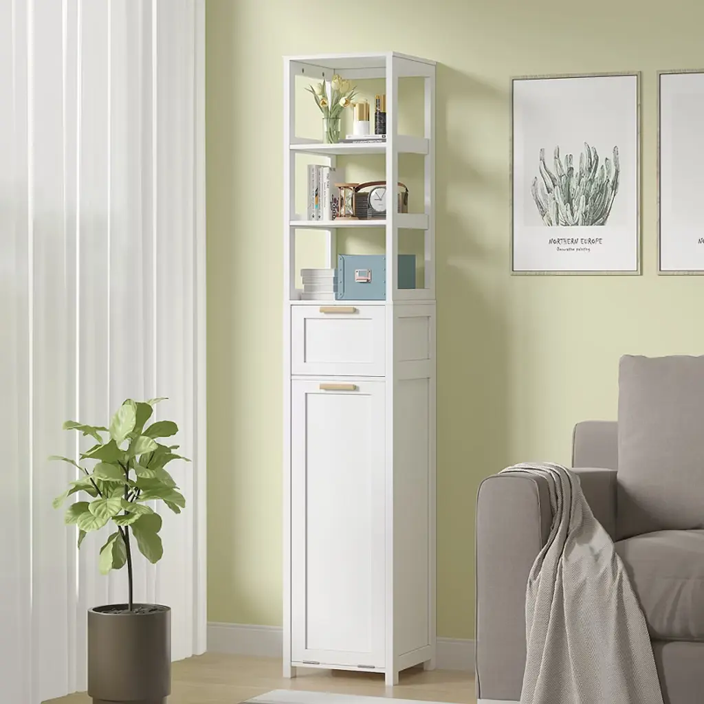 Vecelo Tall Tilt Out Laundry Hamper Cabinet With Removable Laundry Basket, Floor Standing Bathroom Organizer With 1 Drawer & 3 Open Shelves, White