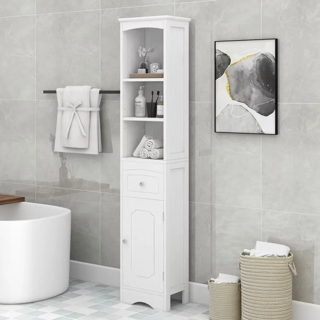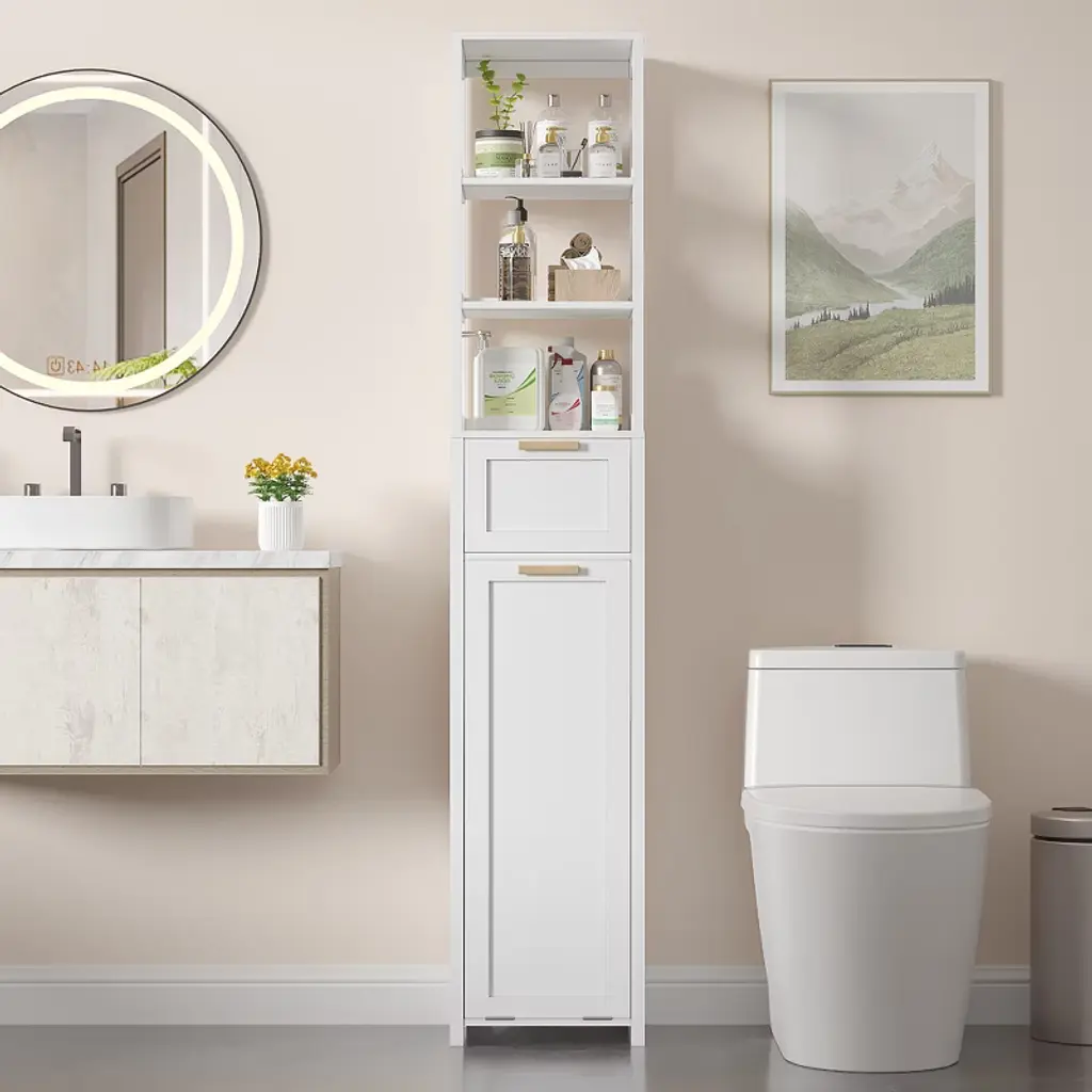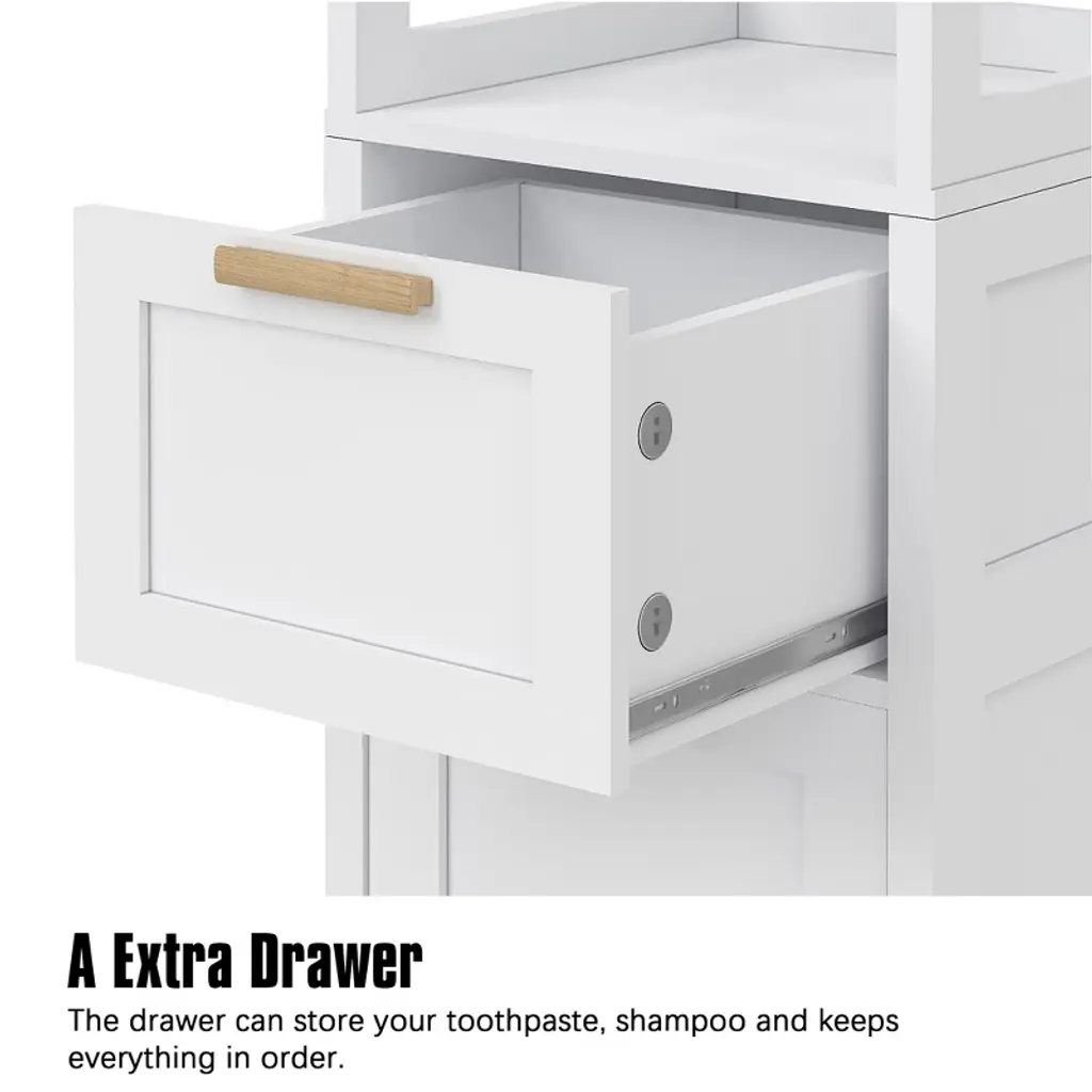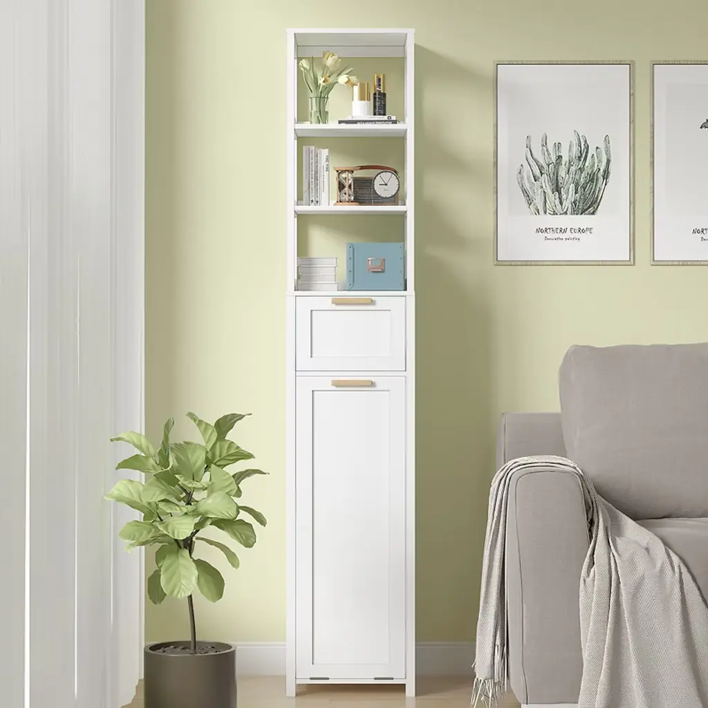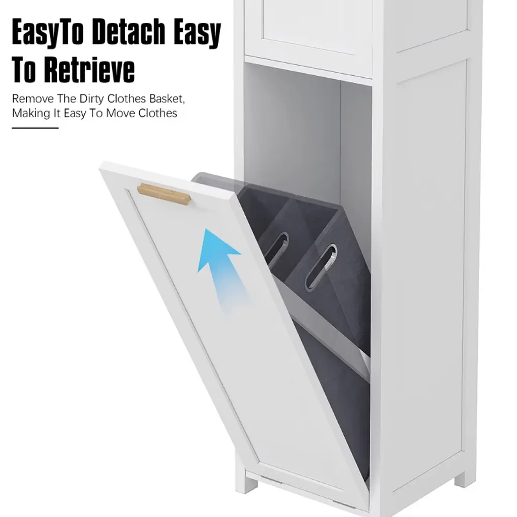 VECELO Tilt Out Laundry Hamper Cabinet features a sleek, modern design that blends seamlessly into any decor. Perfect for smaller spaces, the compact design of the Laundry Basket Cabinet's simple white design with clean lines is perfect for apartments or homes with limited storage space.3 open storage compartments, 1 drawer, and 1 hidden laundry hamper are available for your everyday storage needs. The built-in hidden laundry basket makes it easy to organize your dirty laundry and carry it to the washing machine, combining practicality with aesthetics. The laundry hamper cabinet is made of high quality materials for sturdy construction and durability. Our laundry basket comes with step-by-step instructions for easy assembly. Its versatility makes it ideal for a bathroom or laundry room and enhances the overall texture of the space. 👕🧼