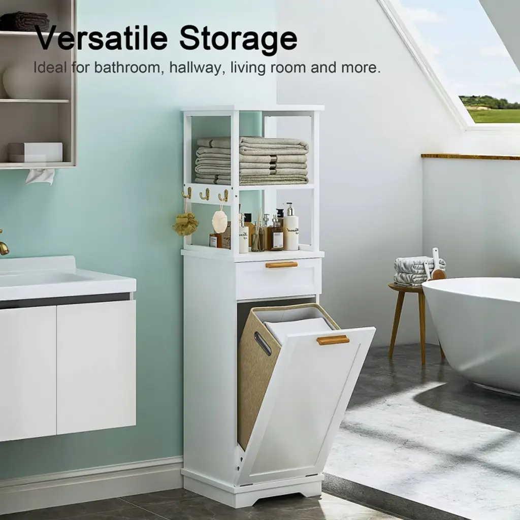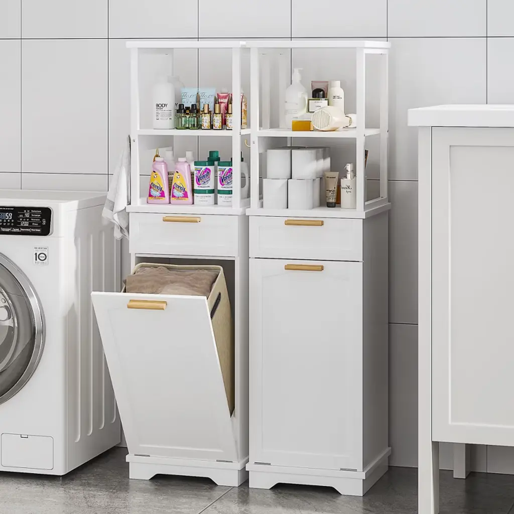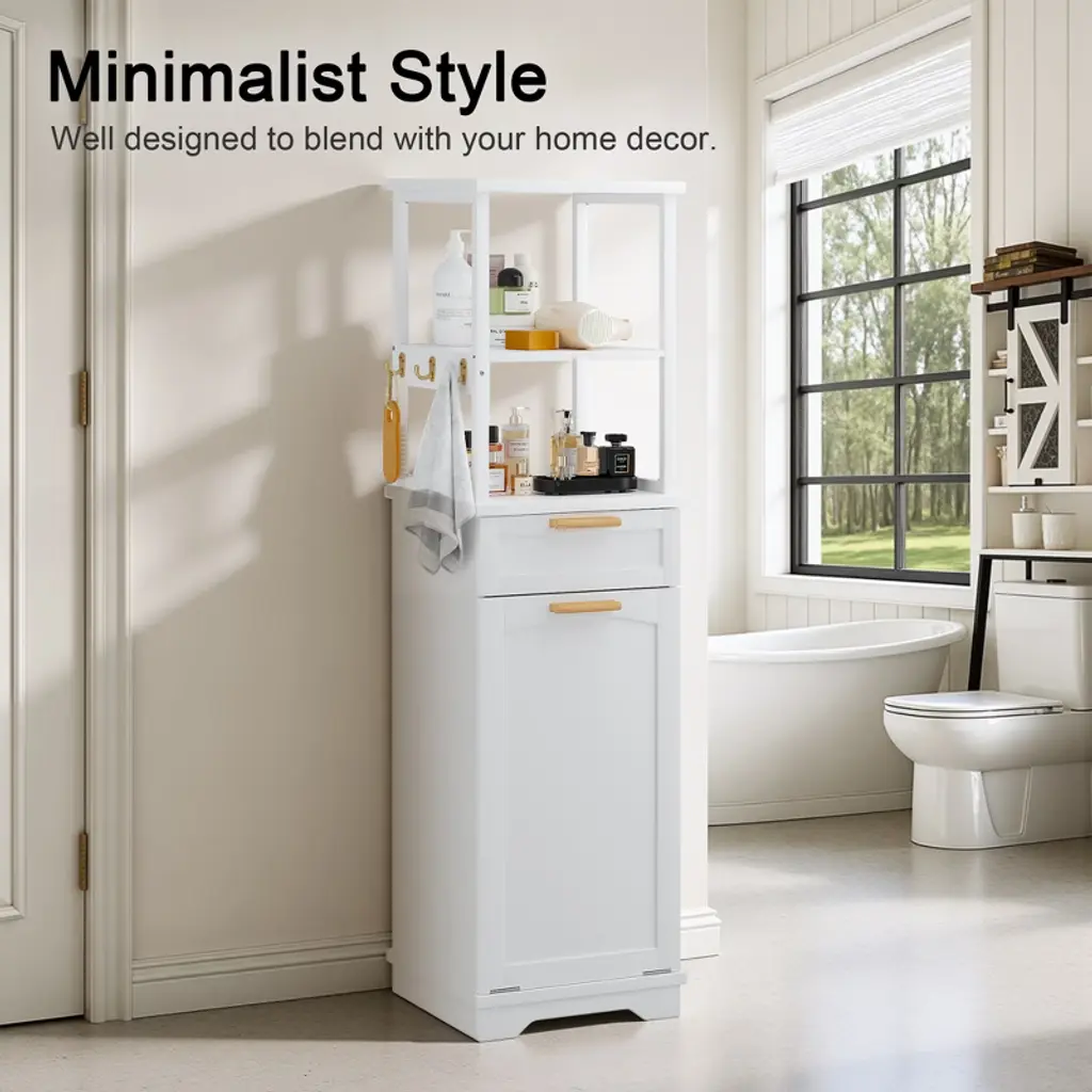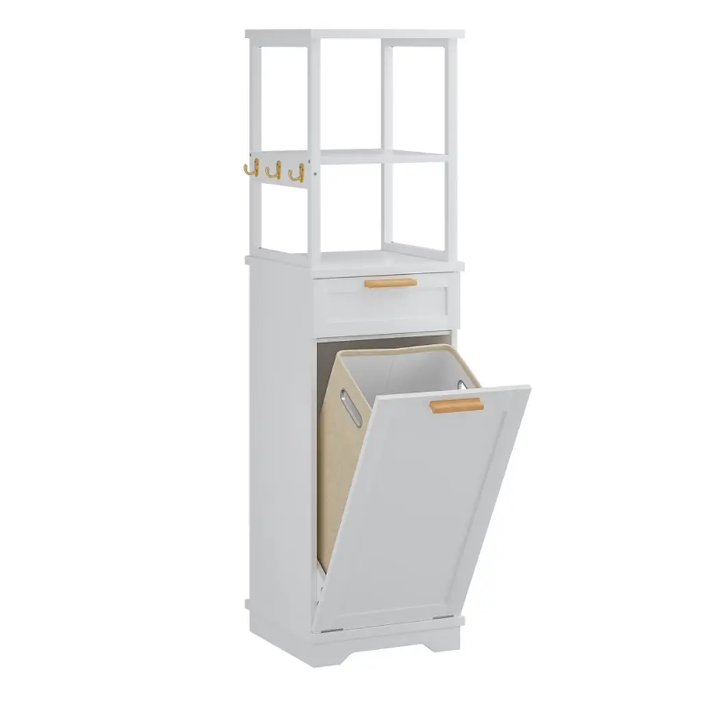 Vecelo Tall Tilt Out Laundry Hamper Cabinet With Removable Laundry Basket, Floor Standing Bathroom Organizer With Drawer & 2 Open Shelves, White