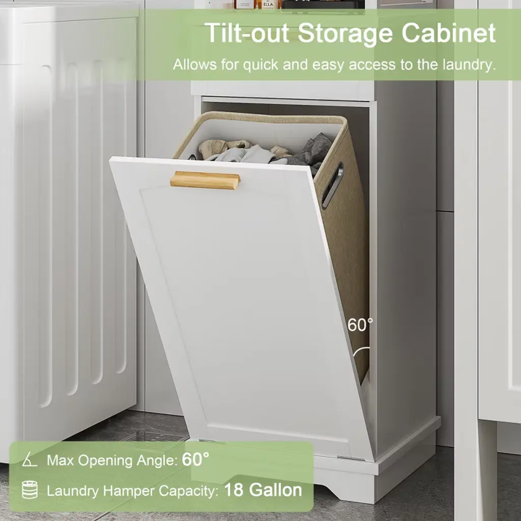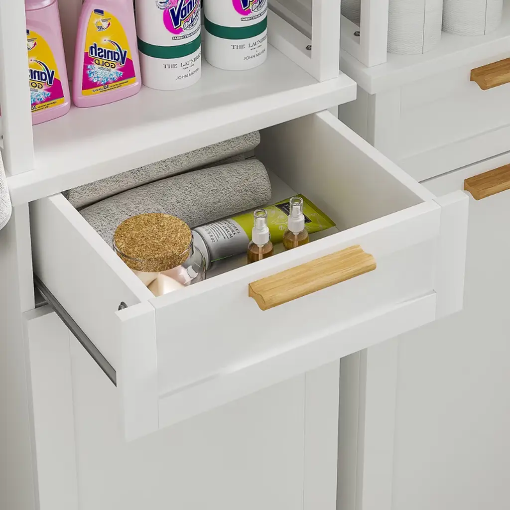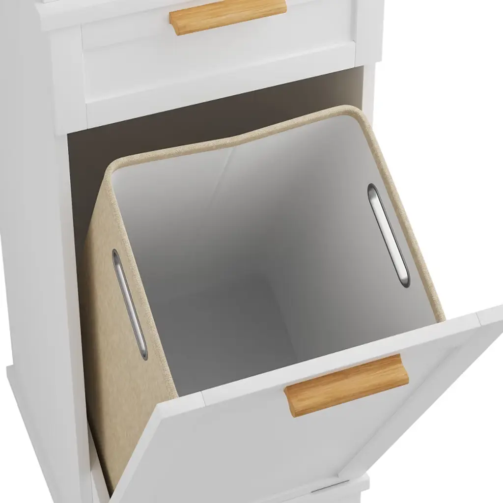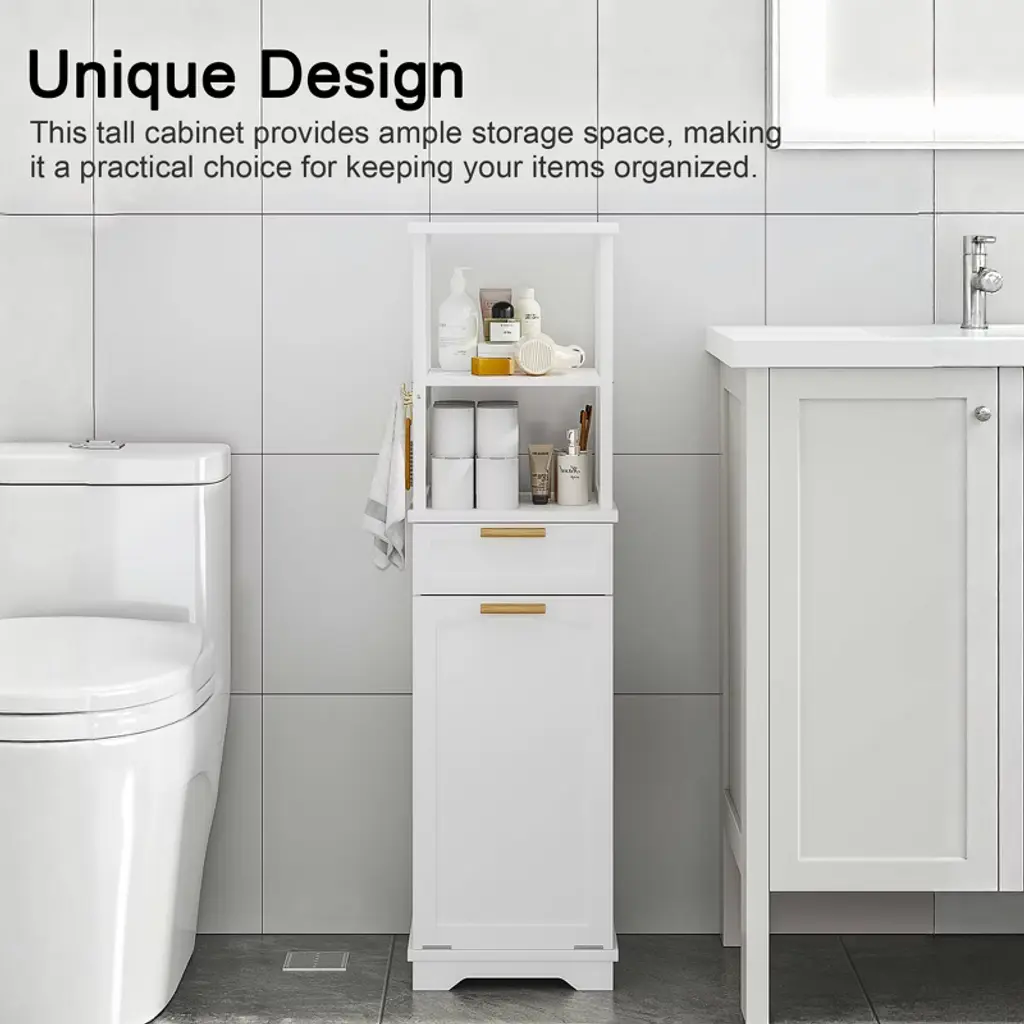 Vecelo Tall Tilt Out Laundry Hamper Cabinet With Removable Laundry Basket, Floor Standing Bathroom Organizer With Drawer & 2 Open Shelves, White