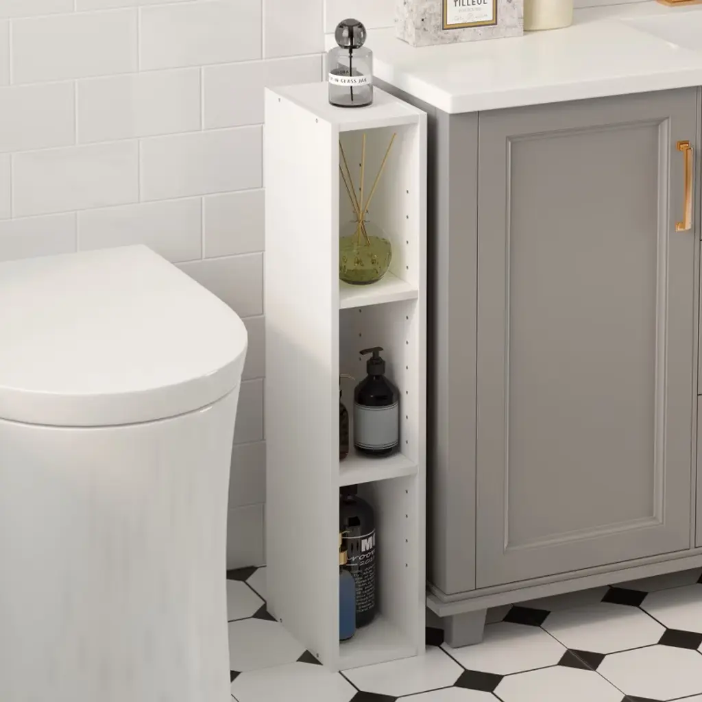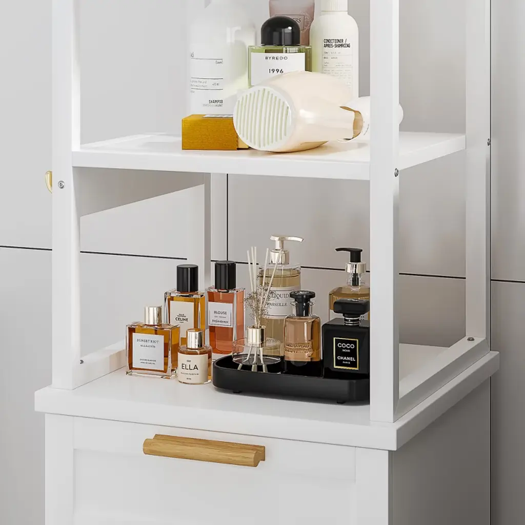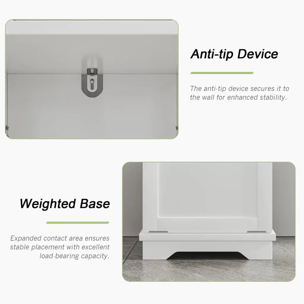 VECELO Tilting Laundry Basket Cabinet features a sleek, modern design with a simple white design with clean lines that will blend seamlessly with any decor. The compact design of the Laundry Basket Cabinet is perfect for smaller spaces and is a great choice for apartments or homes with limited storage space. The laundry hamper comes with ample storage space with 1 drawer, two open shelves, 1 hidden laundry basket and side hooks for your everyday storage needs. The built-in hidden laundry hamper makes it easy to organize your dirty laundry and carry it to the washing machine, combining practicality with aesthetics. The laundry hamper cabinet is made of high quality materials for sturdy construction and durability. Our laundry basket comes with step-by-step instructions for easy assembly. Its versatility makes it ideal for a bathroom or laundry room and enhances the overall texture of the space.