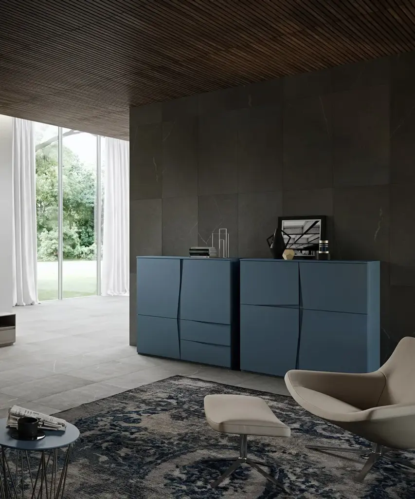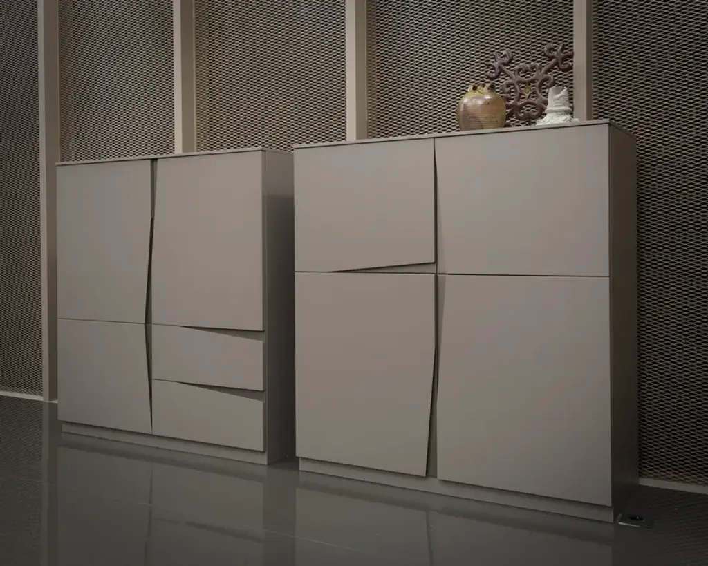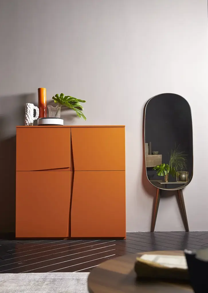 VELA is a collection of sideboards and cupboards. All models are characterised by an oblique cut, which acts as a handle and animates the surface of these furnishing elements, creating an interplay of solids and voids. VELA is available in a matt lacquered finish in all EmmeBi standard colours and the handles can be in a different colour to the structure.