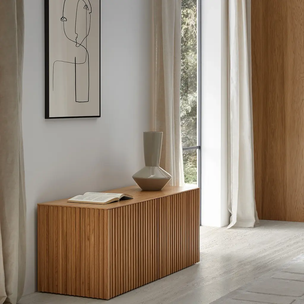 Solid oak vertical slats bring an 3-D architectural flourish to design duo Ludovica & Roberto Palomba’s minimalist Velasca. Emphasizing the warmth of its wood construction, the cabinet is available in a variety of exceptional stained veneer finishes, with its clean-lined proportions owing to push-to-open front doors free of handles and hidden inside hinges.