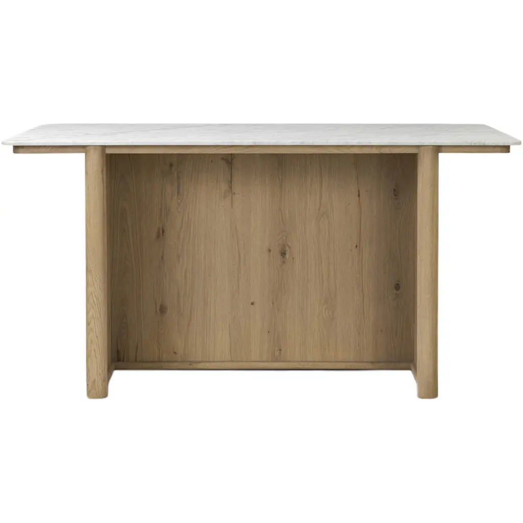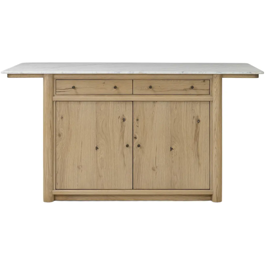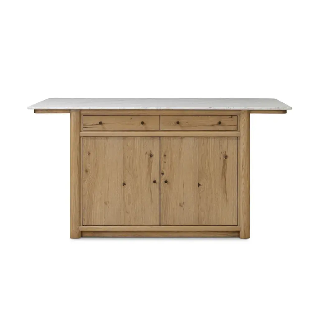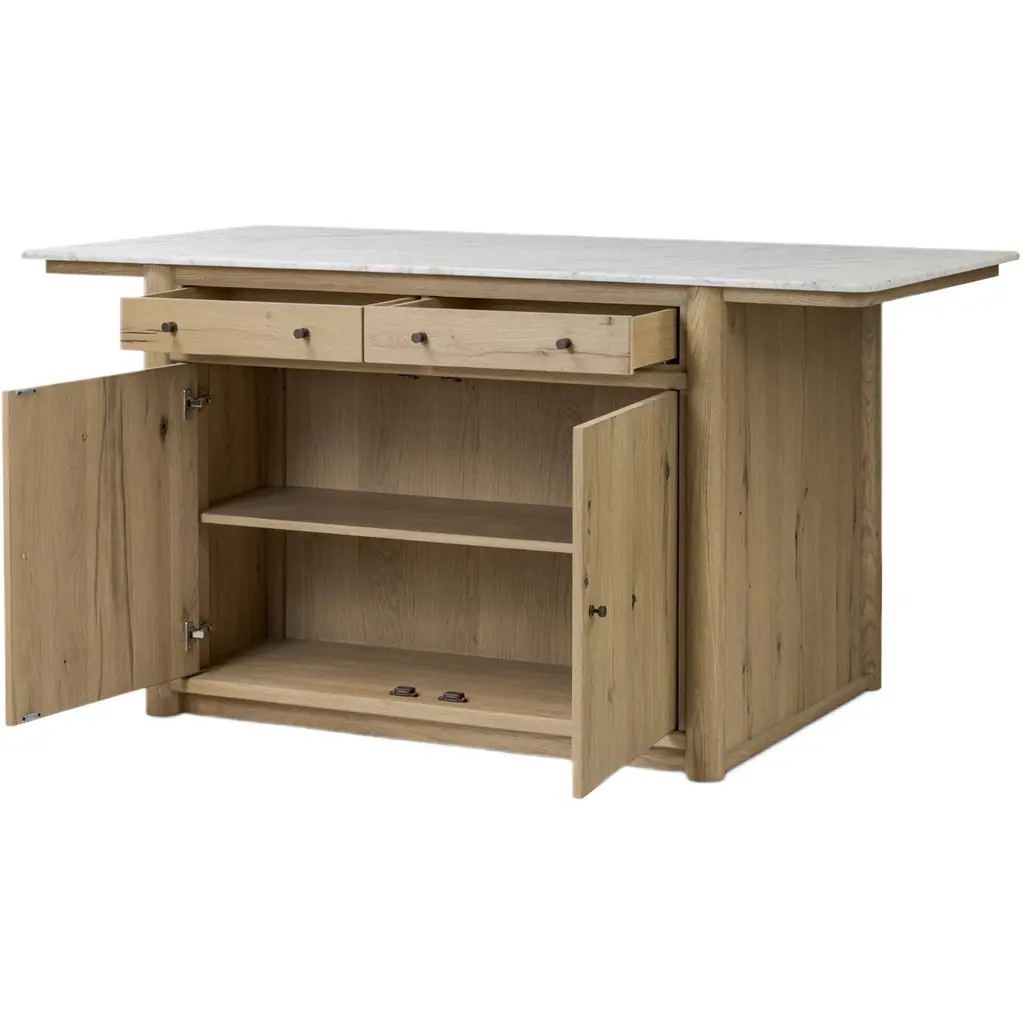 The Velastra Kitchen Island is a stunning addition to any kitchen, offering both style and functionality. Crafted with a sophisticated blend of Carrara marble and aged natural oak, this island provides bonus storage space while enhancing your kitchen's aesthetic. Its closed construction gives the appearance of a built-in piece, seamlessly integrating into your space. The lower cabinetry features shelving and dual drawers, offering endless storage options for your servingware or appliances. This island not only serves as a practical storage solution but also as a natural centerpoint for conversation, making it perfect for cooking or entertaining.