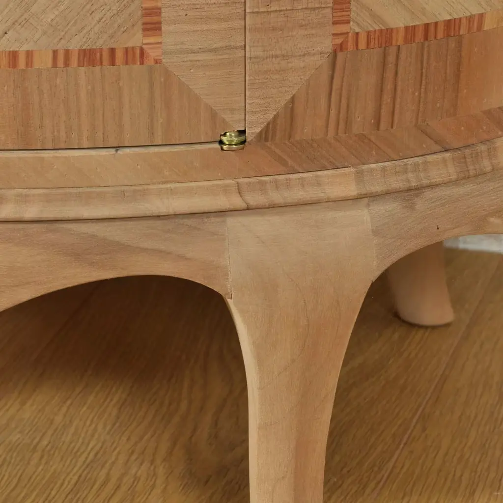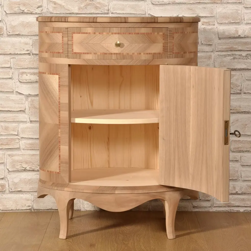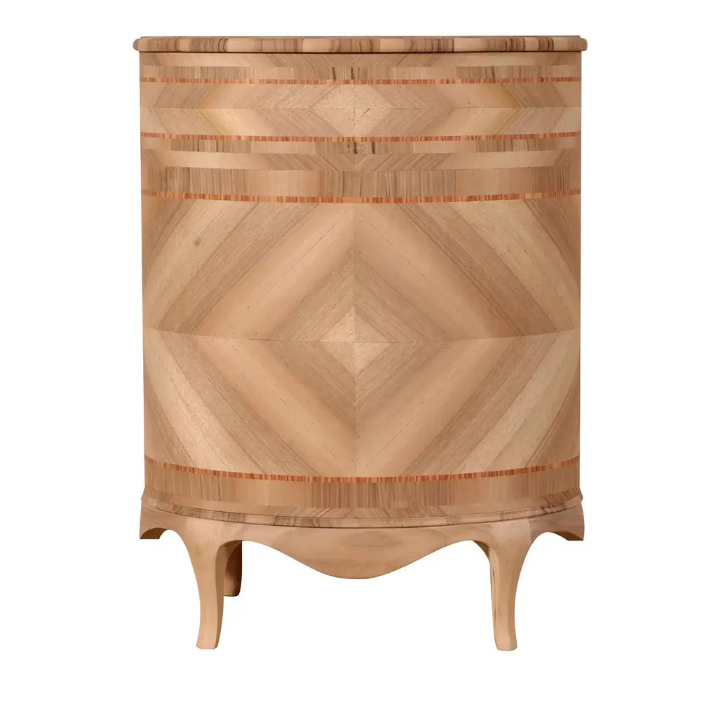 Part of the Venezia '700 Luigi XV Collection, this cabinet is a singular piece capable of hypnotizing with its superb geometric inlays combining prized Bois de Rose and herringbone walnut. Graceful cabriole feet sustain the structure, which sports a harmonious and fresh oval cut that lends the piece a modern twist. Offered in a refined natural finish, it is minutely handcrafted following ancient techniques.