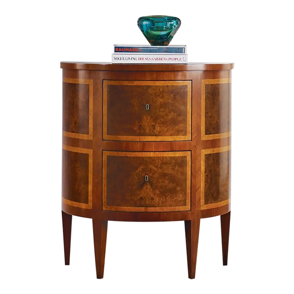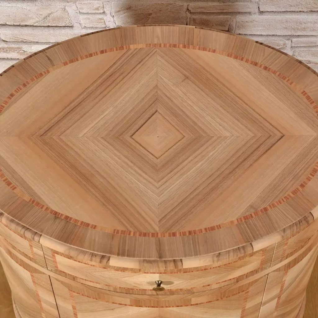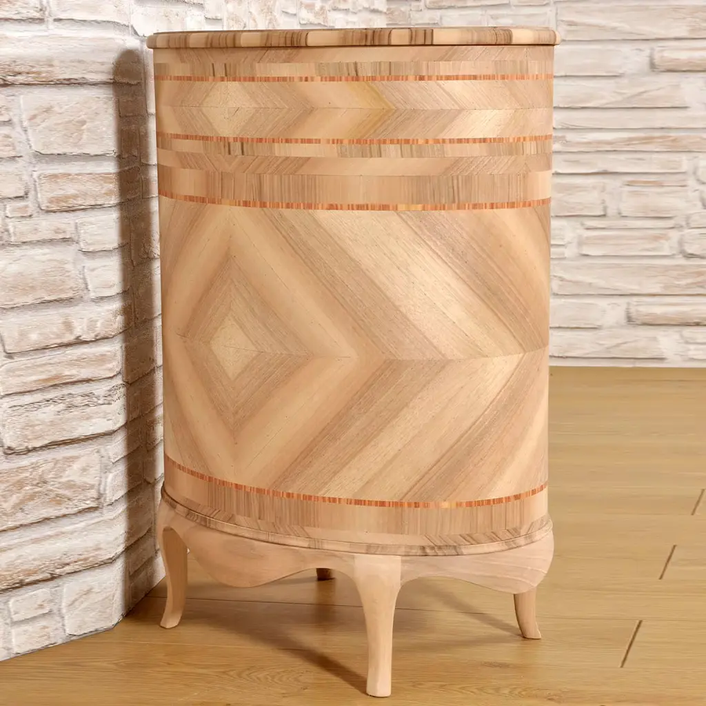 Part of the Venezia '700 Luigi XV Collection, this cabinet is a singular piece capable of hypnotizing with its superb geometric inlays combining prized Bois de Rose and herringbone walnut. Graceful cabriole feet sustain the structure, which sports a harmonious and fresh oval cut that lends the piece a modern twist. Offered in a refined natural finish, it is minutely handcrafted following ancient techniques.