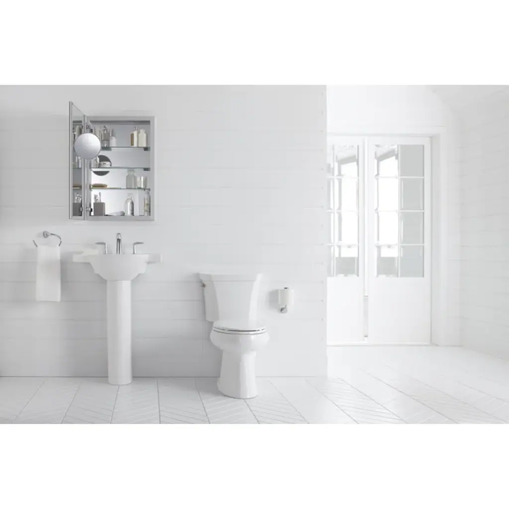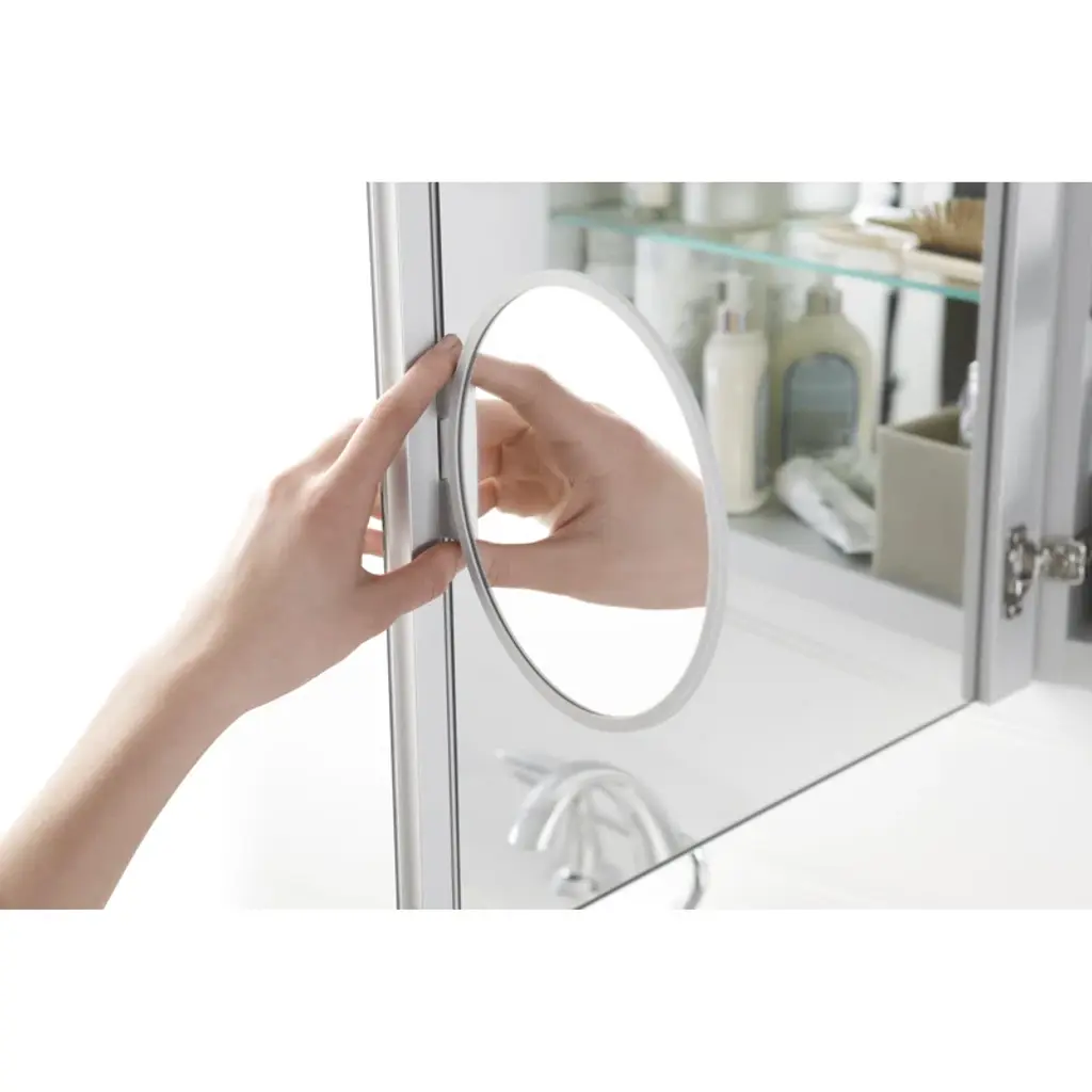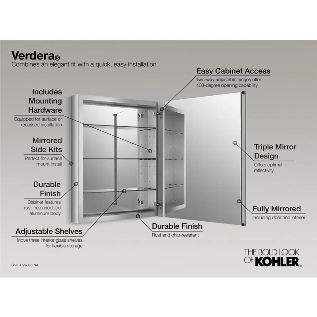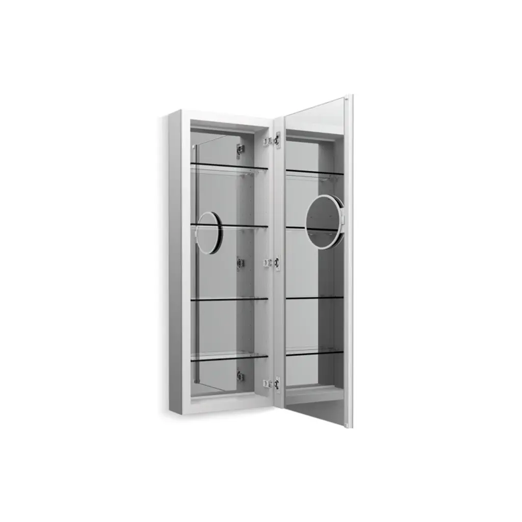 This Verdera framed medicine cabinet combines an elegant fit and finish with quick, easy installation. A built-in magnifying mirror on the inside of the door is vertically adjustable to accommodate users of varying heights. The door and interior are fully mirrored, and four adjustable glass shelves offer flexible storage. The slow-close door creates a quieter bath environment.