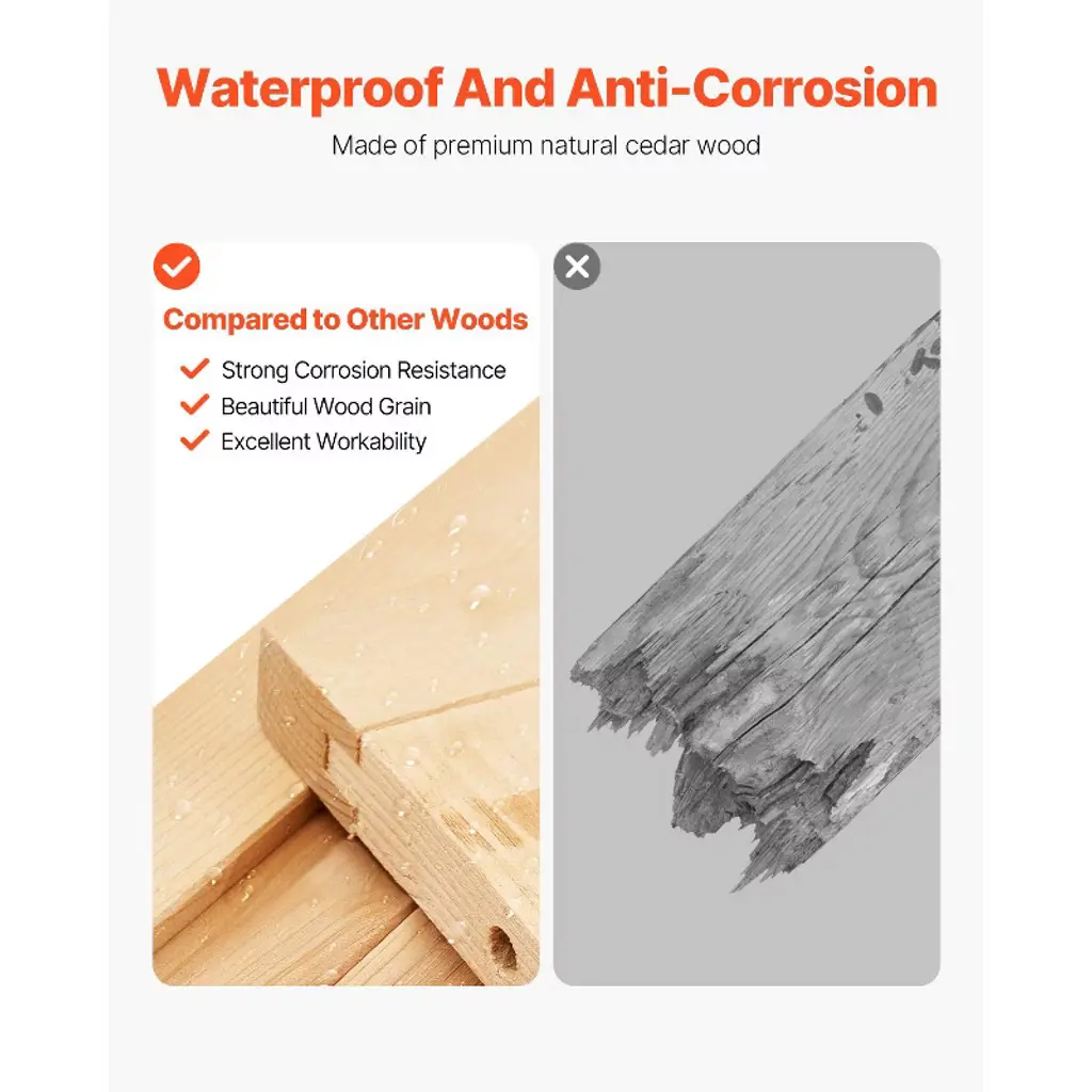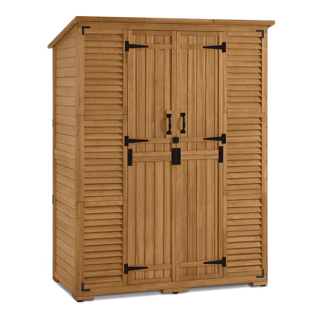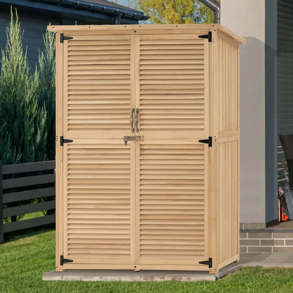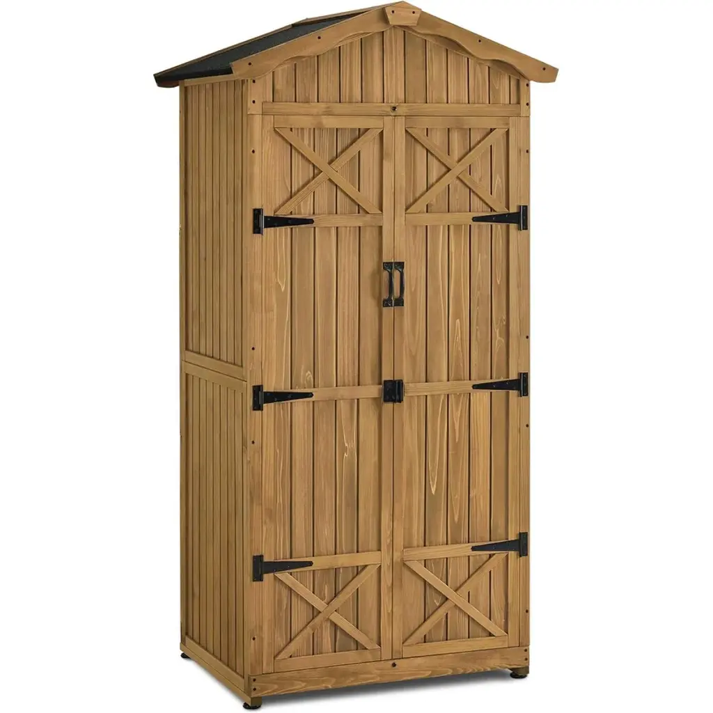 Feature: Sturdy Structure: This outdoor storage shed is made from high-quality natural cedar wood and treated for excellent waterproofing and corrosion resistance. The thoughtful anti-tip design effectively prevents the cabinet from tipping over, ensuring it can withstand various climate conditions for long-term use. Strong Storage Capacity: The spacious interior can accommodate a variety of outdoor items, helping users effectively organize and store, keeping the outdoor environment tidy. Easy Assembly: Equipped with clear assembly instructions and necessary accessories, you can quickly assemble the garden tool shed without the need for re-drilling holes. Additionally, maintaining the wood is simple; regular cleaning and painting can preserve its appearance and performance. Aesthetic and Functional: Our large wooden outdoor storage shed use natural wood grain. It can harmonize with various outdoor environments, enhancing the overall aesthetic and serving as a decorative element in your outdoor space. Weather Resistant: The storage house cabinet's top has an asphalt waterproof sloped roof, effectively preventing water accumulation. Package Content 1 x Outdoor Storage Shed 1 x Manual 1 x Set of Installation Tools