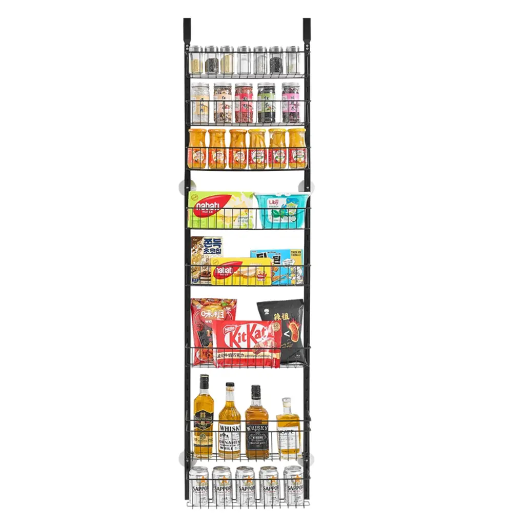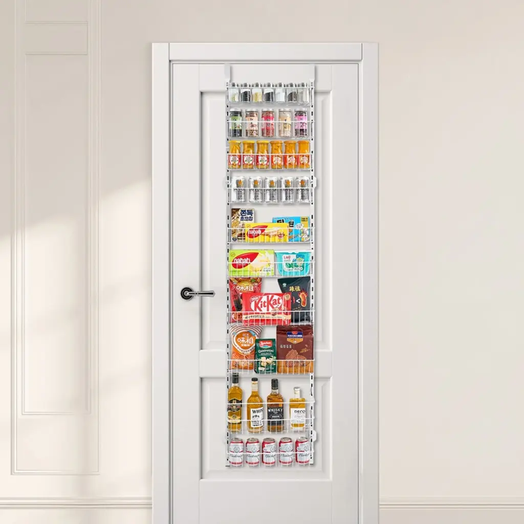 Feature: Fits Most Doors: This over the door pantry organizer is compatible with doors that have a panel thickness of no more than 2 in / 50 mm, and the door gap must be greater than 0.06 in / 1.5mm. There should also be at least 7.1 in / 180mm of clearance between the door and the pantry shelf. Please check your cabinet door dimensions to ensure a proper fit and smooth door closure Adjustable & Easy to Install: This pantry organization and storage rack features adjustable basket spacing to accommodate items of different heights. You can hang it on the door or use the included screws to mount it on the wall, with assembly completed in just a few minutes Stable Design: The hanging spice rack shelf features a heavy-duty Q195 steel square tube frame that is resistant to rust, bending, and cracking. 4 strong adhesive pads prevent wobbling, ensuring stable support for your items. The total weight capacity is up to 33.1 lbs / 15 kg, with each basket holding up to 3.31 lbs / 1.5 kg Extra-Large Storage Space: This laundry room bathroom organization comes with 10 baskets (basket size(LxDxH): 16x4.9x3 in / 406x125x76 mm), ideal for storing spice jars, cans, and other small items Multifunctional Storage: This adjustable cabinet door organizer is perfect for apartments and renters! Whether you need extra storage in the kitchen, pantry, bathroom, living room, or laundry room, it's the ideal solution to meet your needs Package Content: 1 x Over the Door Pantry Organizer 10 x Small Baskets 12 x Square Tubes 1 x Basket Guard 16 x Screws 4 x Adhesive Pads