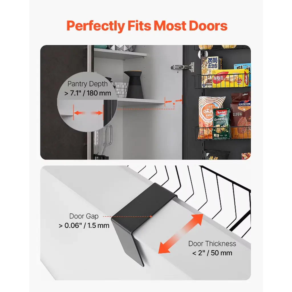 Feature: Fits Most Doors: This over the door pantry organizer is compatible with doors that have a panel thickness of no more than 2 in / 50 mm, and the door gap must be greater than 0.06 in / 1.5mm. There should also be at least 7.1 in / 180mm of clearance between the door and the pantry shelf. Please check your cabinet door dimensions to ensure a proper fit and smooth door closure. Adjustable & Easy to Install: This pantry organization and storage rack features adjustable basket spacing to accommodate items of different heights. You can hang it on the door or use the included screws to mount it on the wall, with assembly completed in just a few minutes. Stable Design: The hanging spice rack shelf features a heavy-duty Q195 steel square tube frame that is resistant to rust, bending, and cracking. 4 strong adhesive pads prevent wobbling, ensuring stable support for your items. The total weight capacity is up to 19.84 lbs / 9 kg, with each basket holding up to 3.31 lbs / 1.5 kg. Extra-Large Storage Space: This laundry room bathroom organization comes with 6 baskets (Basket size(LxDxH): 16x4.9x3 in / 406x125x76 mm), ideal for storing spice jars, cans, and other small items. Multifunctional Storage: This adjustable cabinet door organizer is perfect for apartments and renters! Whether you need extra storage in the kitchen, pantry, bathroom, living room, or laundry room, it's the ideal solution to meet your needs. Package Content: 1 x Over the Door Pantry Organizer 6 x Small Baskets 8 x Square Tubes 12 x Screws 4 x Adhesive Pads