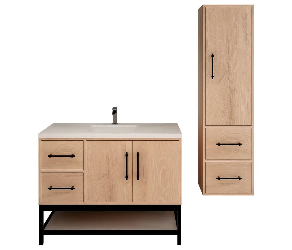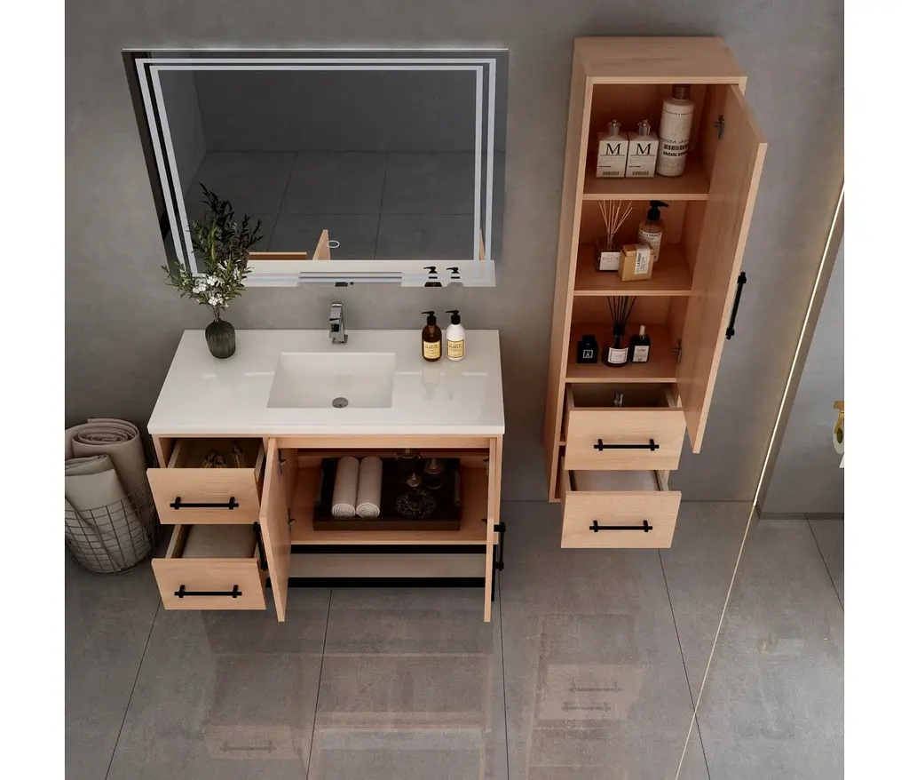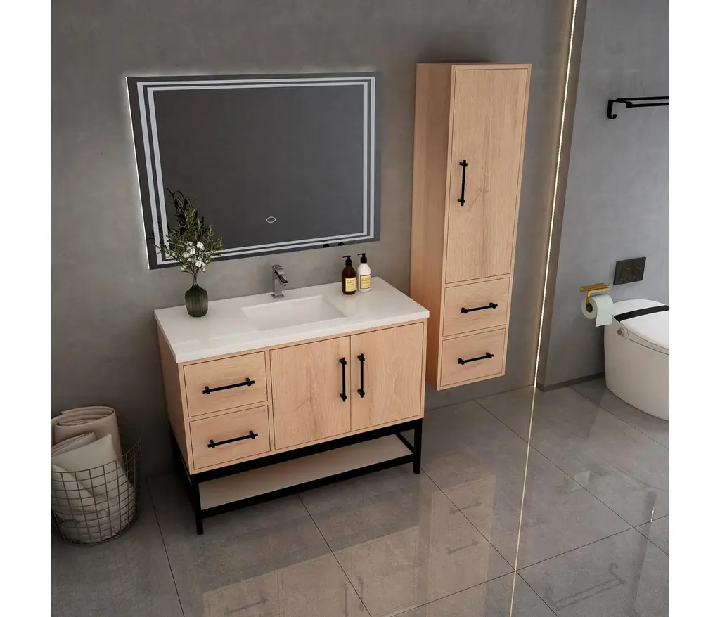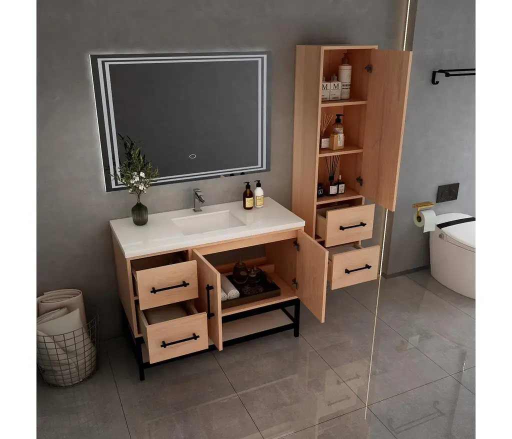 The Victoria Plywood Freestanding Open Shelf Bathroom Vanity epitomizes modern elegance and practical storage.This all-in-one solution combines the sleek, floating design of the Victoria Plywood Vanity with the added convenience of a matching open shelf rack.The freestanding open shelf rack seamlessly integrates with the Victoria Vanity, creating a unified and visually stunning centerpiece for your bathroom.What's Included:Victoria Plywood Floating Vanity BaseMatching Reinforced Acrylic Sink TopVictoria Open Shelf Freestanding Bathroom Vanity RackWhat's Not Included:FaucetsDrainsMirrorVictoria Overhead CabinetVictoria Side Linen Cabinet
