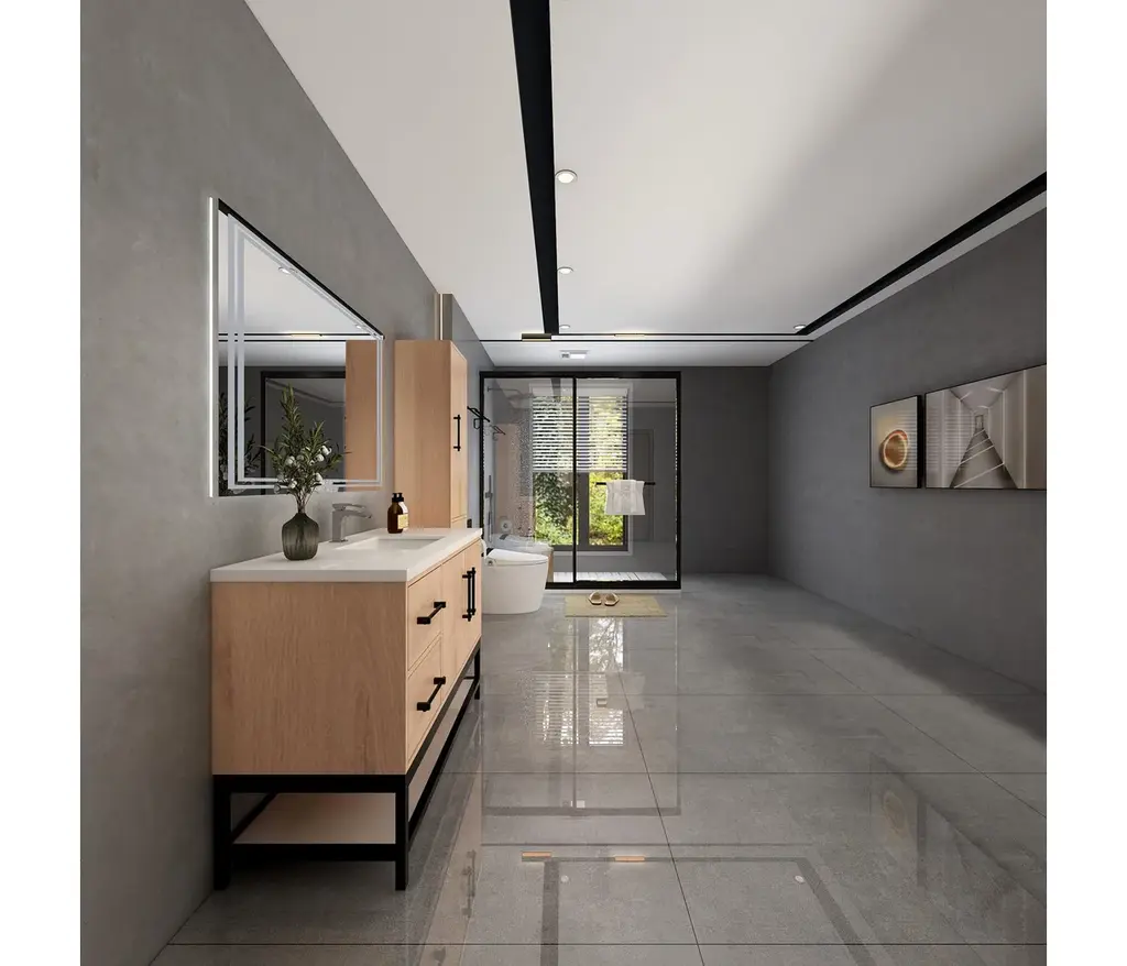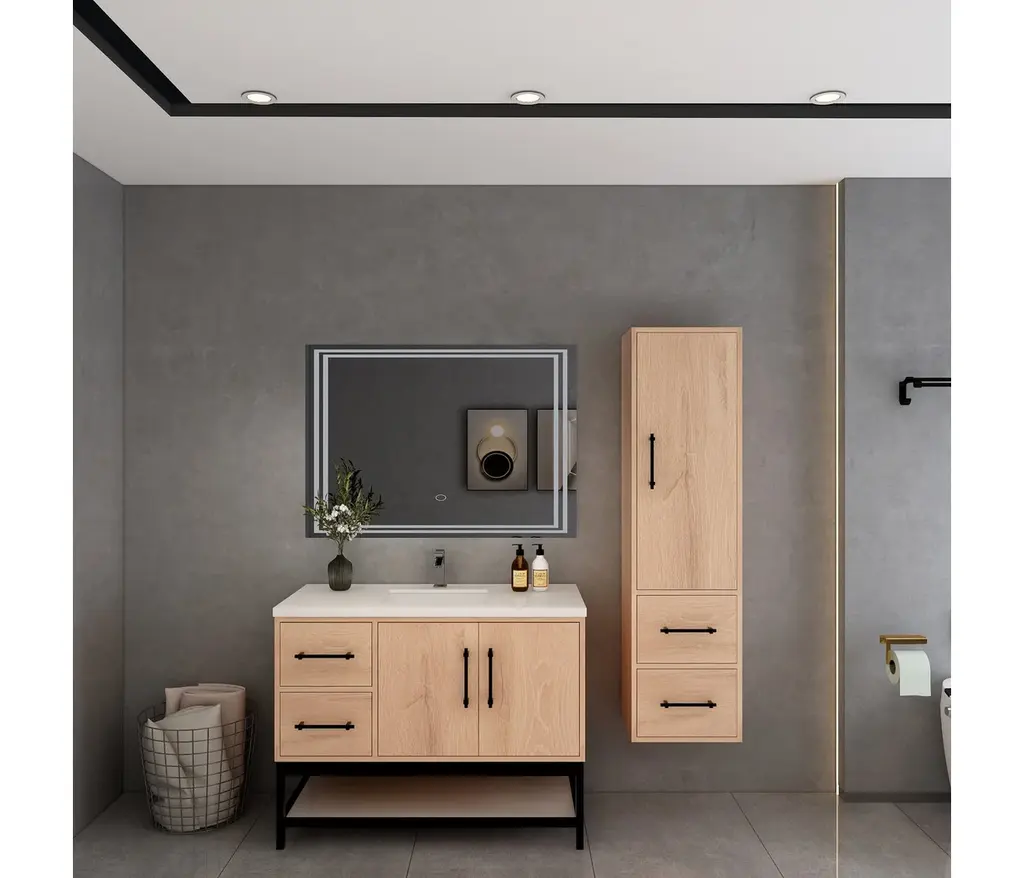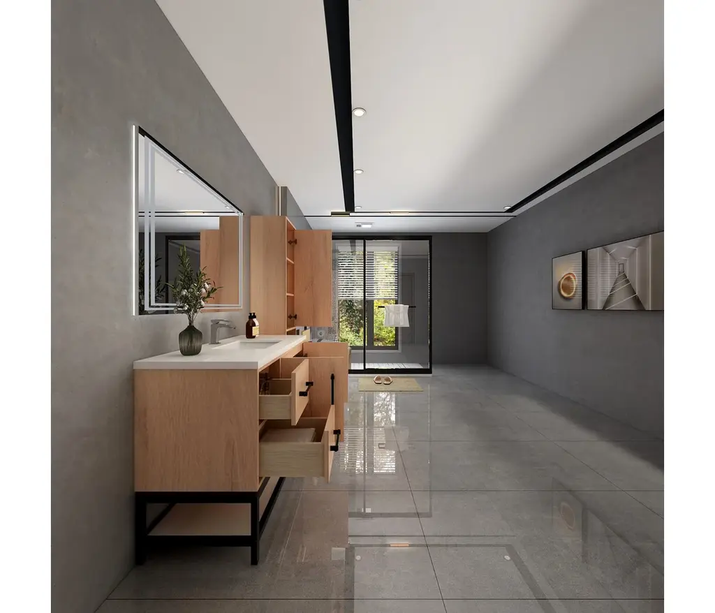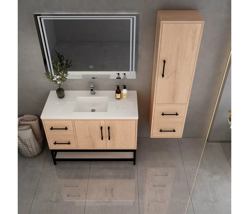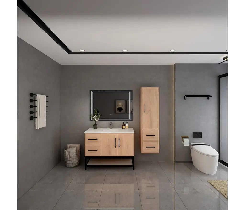 The Victoria Plywood Freestanding Open Shelf Bathroom Vanity epitomizes modern elegance and practical storage.This all-in-one solution combines the sleek, floating design of the Victoria Plywood Vanity with the added convenience of a matching open shelf rack.The freestanding open shelf rack seamlessly integrates with the Victoria Vanity, creating a unified and visually stunning centerpiece for your bathroom.What's Included:Victoria Plywood Floating Vanity BaseMatching Reinforced Acrylic Sink TopVictoria Open Shelf Freestanding Bathroom Vanity RackWhat's Not Included:FaucetsDrainsMirrorVictoria Overhead CabinetVictoria Side Linen Cabinet