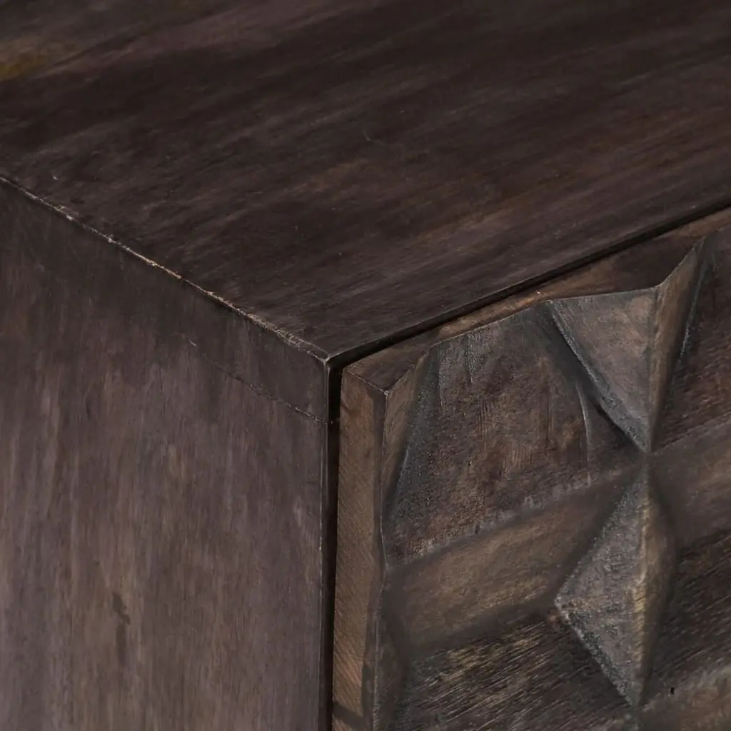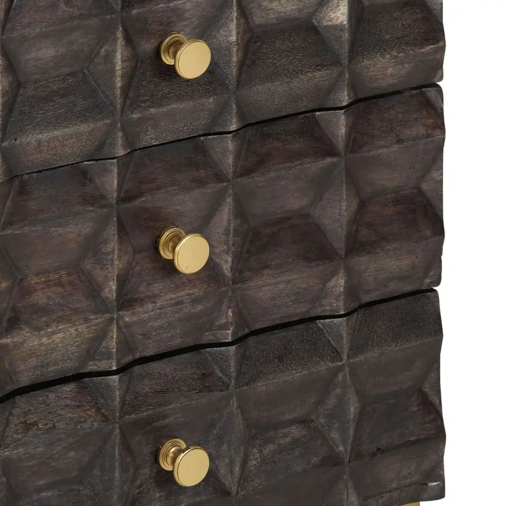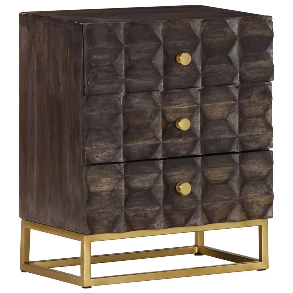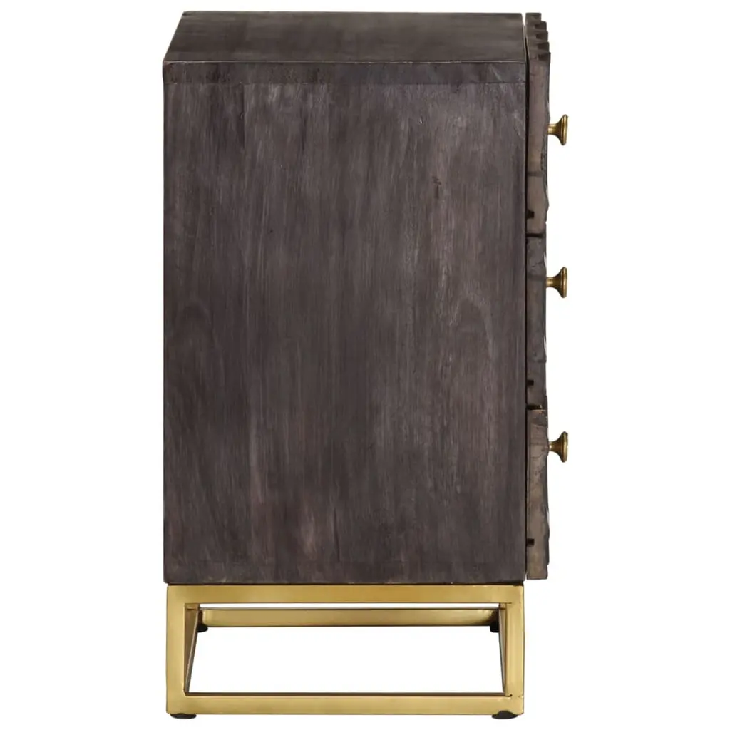 This Industrial Bed Cabinet mixes functionality and style, perfect for modern bedrooms or living areas. With a bold black finish and shiny gold legs, it's not just practical but adds a unique touch to your decor. Stylish Design: The cabinet features a chic industrial aesthetic with decorative inlays that add character, making it a statement piece in any room.Ample Storage: With three drawers, it allows for organized storage, keeping your essentials easy to find and free of clutter.Durable Materials: Made from solid mango wood and sturdy powder-coated steel legs, this cabinet is built to last for everyday use.Versatile Use: Great as a nightstand or side cabinet, it fits well in both bedrooms and living areas.Easy Maintenance: The matte finish is simple to clean and maintain, so your cabinet stays looking sharp over time with minimal fuss.