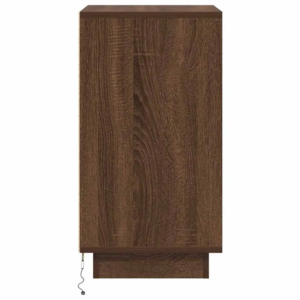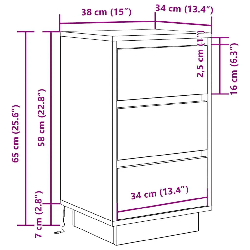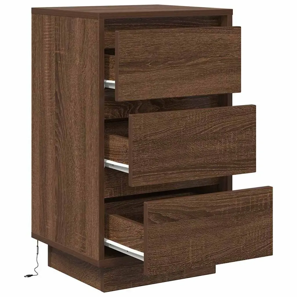This bedside table is the perfect mix of style and function, fitting right in with modern bedroom vibes. It's great for your alarm clock, nighttime reading gear, or decorative bits, transforming your space with its lovely brown oak finish and built-in LED lighting, giving you storage as well as style. Gives you integrated LED lighting that brightens up your space, creating a warm glow that's great for nighttime. This vibrant lighting adds practicality and a bit of style to your bedside.Loads of storage with three roomy drawers, perfect for keeping all your essentials neatly stashed away. Its smooth, moisture-resistant engineered wood ensures your stuff stays safe and easy to grab.The stylish modern design makes it a standout addition to any room. With sleek lines and a classy finish, this bedside table boosts your bedroom's style factor, perfect for anyone who loves refined looks.Built from durable engineered wood, this table is made to last while keeping its good looks. This reliable material not only looks fab but is also super easy to maintain, letting you enjoy your space without stress.With compact dimensions of 14.9 in length, 13.4 in width, and 25.6 in height, this bedside table fits perfectly next to any bed, making it a flexible option for different room layouts.
