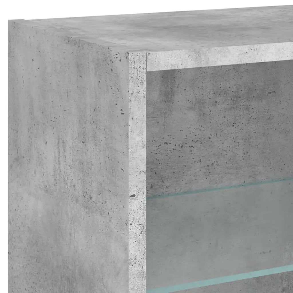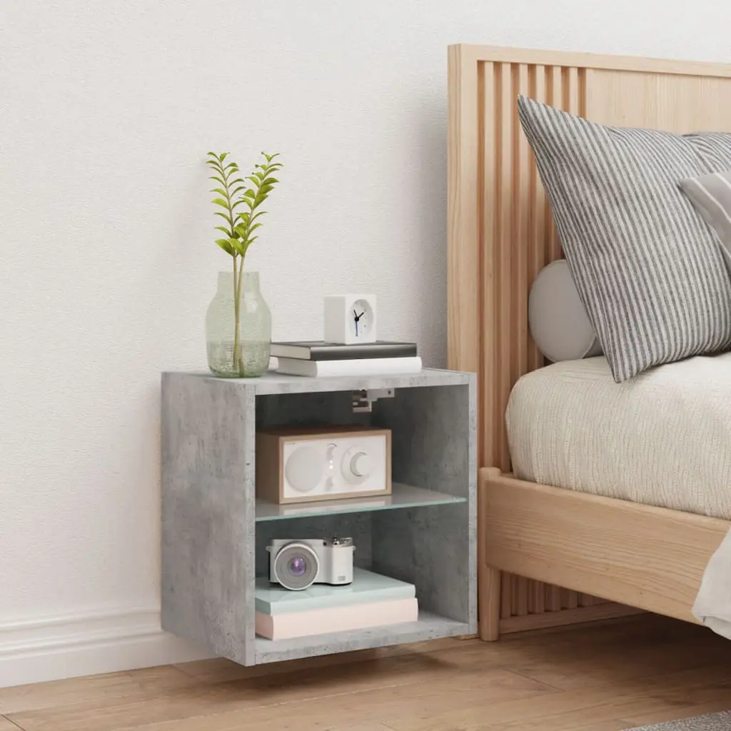This Concrete Grey Floating Bedside Cabinet mixes style and usefulness for modern homes. Ideal for bedrooms, this wall-hung cabinet offers a sleek look while freeing up space for books, decorative bits, or essentials, all while seamlessly fitting into your room's decor with its minimalist style. Stylish Floating Design: This cabinet's floating design saves floor space while adding elegance to your bedroom. Mounted securely on the wall, it creates an illusion of space, making your room feel bigger.Dynamic RGB LED Lighting: With built-in RGB LED lights, you can switch up the mood of your room with custom patterns and colors for a lively and personalized atmosphere.Functional Storage: Boasting generous storage options, this cabinet features a spacious drawer to keep your nighttime essentials within easy reach, ensuring a tidy space.Durable Construction: Built from high-quality engineered wood and glass, this bedside cabinet is made for durability and good looks, ensuring it lasts while enhancing your decor.Easy Assembly: Designed for your convenience, the cabinet is simple to set up. With the right tools, you can quickly and easily mount it on your wall, ready for use.