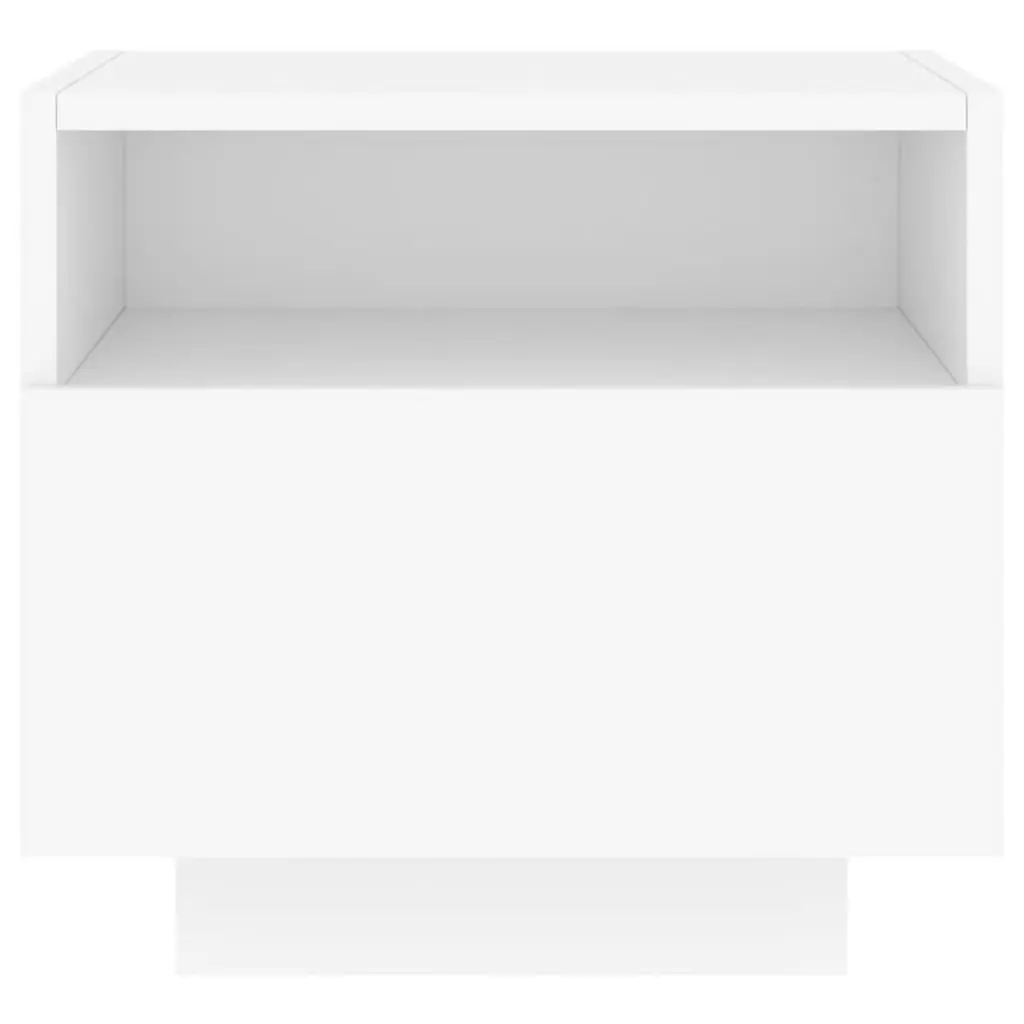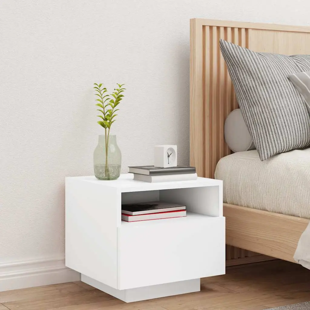 This bedside cabinet is not only practical but also adds a nice touch to your bedroom decor, expertly designed for modern tastes. Its cool white finish and smooth texture lighten up the room while giving you plenty of storage space for your night-time bits and bobs—a classy charm that suits any unisex or guest room. Built-In Lighting: The LED strip lights add a modern flair, making your bedroom cozy without needing bright lights at night.Ample Storage: With a traditional drawer design, you can keep your personal items tucked away, so your bedside stays neat and tidy. There's plenty of room for books and gadgets.Compact Size: At just 15.7x15.4x14.6 in, this cabinet is perfect for smaller rooms, fitting right beside any bed.Modern Design: Its clean lines and minimalist look fit in beautifully with both modern and classic decor, easily matching any color scheme.Durable Build: Made from engineered wood, this bedside cabinet is well-built to resist moisture while looking great, with a matte finish that doesn’t require much upkeep. The product comes with a USB connector, but you won't find the certified 5V USB power source in the box.