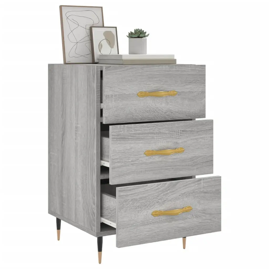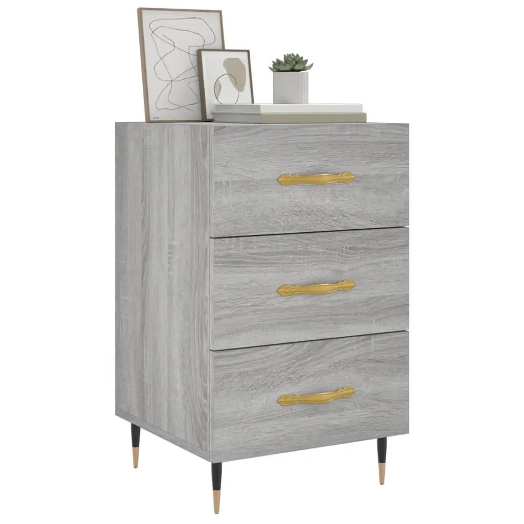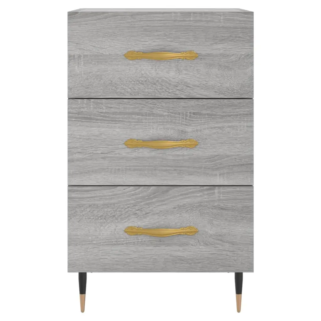 This bedside cabinet is a great mix of style and practicality, designed to lift your bedroom's vibe. With its sleek grey sonoma finish and modern look, it works perfectly as a nightstand while adding a cool touch to your living space. Ample Storage: The bedside cabinet has three spacious drawers, perfect for keeping all your personal stuff, from books to bedtime essentials. The drawers slide in and out easily, thanks to their smooth runners, letting you grab whatever you need in a jiffy.Contemporary Design: This cabinet's modern style shines through its clean lines and minimalist look, making it a versatile piece that fits into all kinds of interior styles, whether chic or quirky.Durable Construction: Built from engineered wood and tough iron, this cabinet can handle daily use, ensuring it sticks around in your home for ages without losing quality.Elegant Touch: With polished brass drop handles, the cabinet adds a touch of class to your decor, sprucing up the overall look of your bedroom or living space.Easy Maintenance: The matte finish not only looks stylish but is also easy to clean – just a soft cloth will keep it looking as good as new.