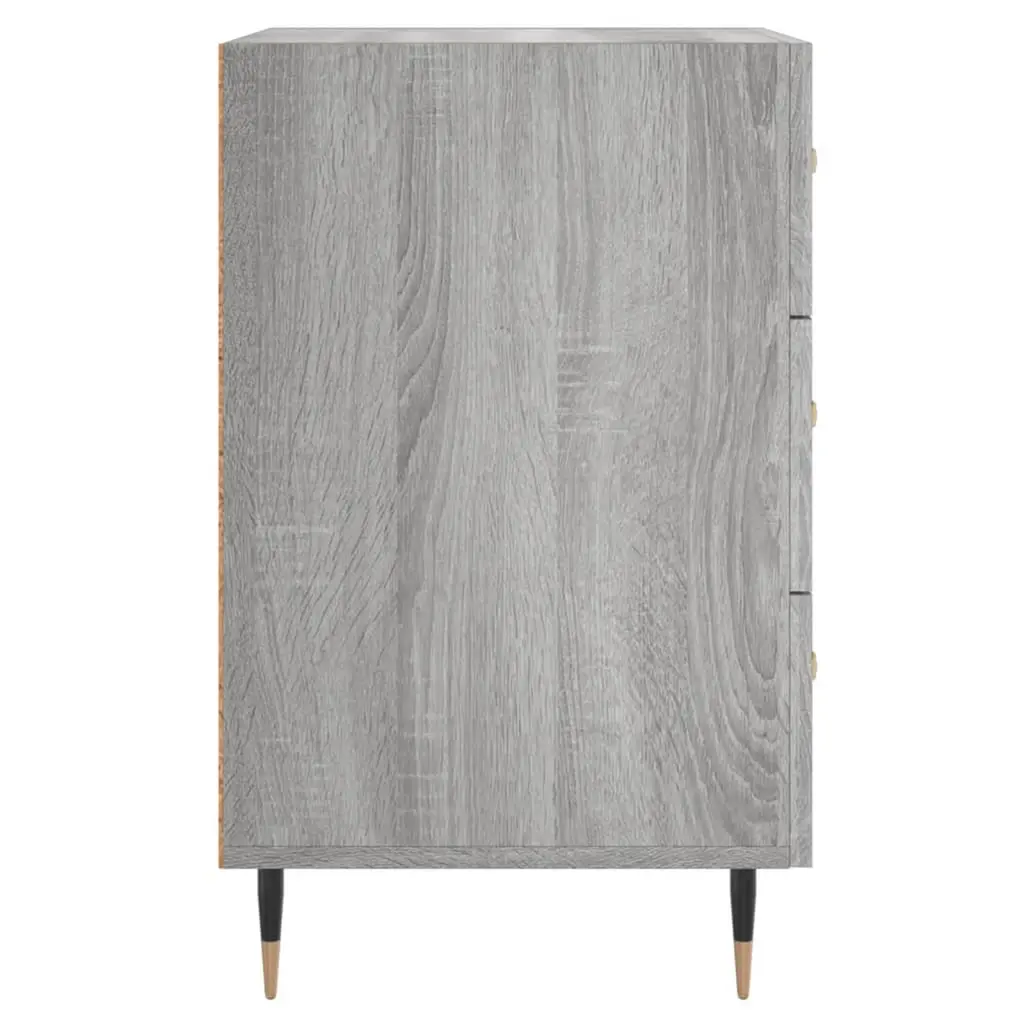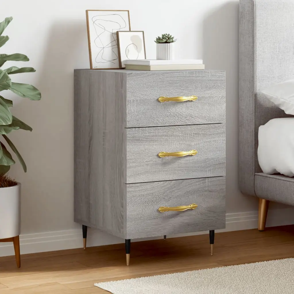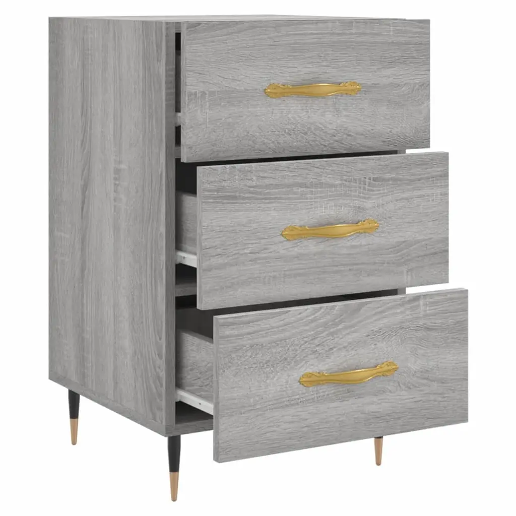 This bedside cabinet is a great mix of style and practicality, designed to lift your bedroom's vibe. With its sleek grey sonoma finish and modern look, it works perfectly as a nightstand while adding a cool touch to your living space. Ample Storage: The bedside cabinet has three spacious drawers, perfect for keeping all your personal stuff, from books to bedtime essentials. The drawers slide in and out easily, thanks to their smooth runners, letting you grab whatever you need in a jiffy.Contemporary Design: This cabinet's modern style shines through its clean lines and minimalist look, making it a versatile piece that fits into all kinds of interior styles, whether chic or quirky.Durable Construction: Built from engineered wood and tough iron, this cabinet can handle daily use, ensuring it sticks around in your home for ages without losing quality.Elegant Touch: With polished brass drop handles, the cabinet adds a touch of class to your decor, sprucing up the overall look of your bedroom or living space.Easy Maintenance: The matte finish not only looks stylish but is also easy to clean – just a soft cloth will keep it looking as good as new.