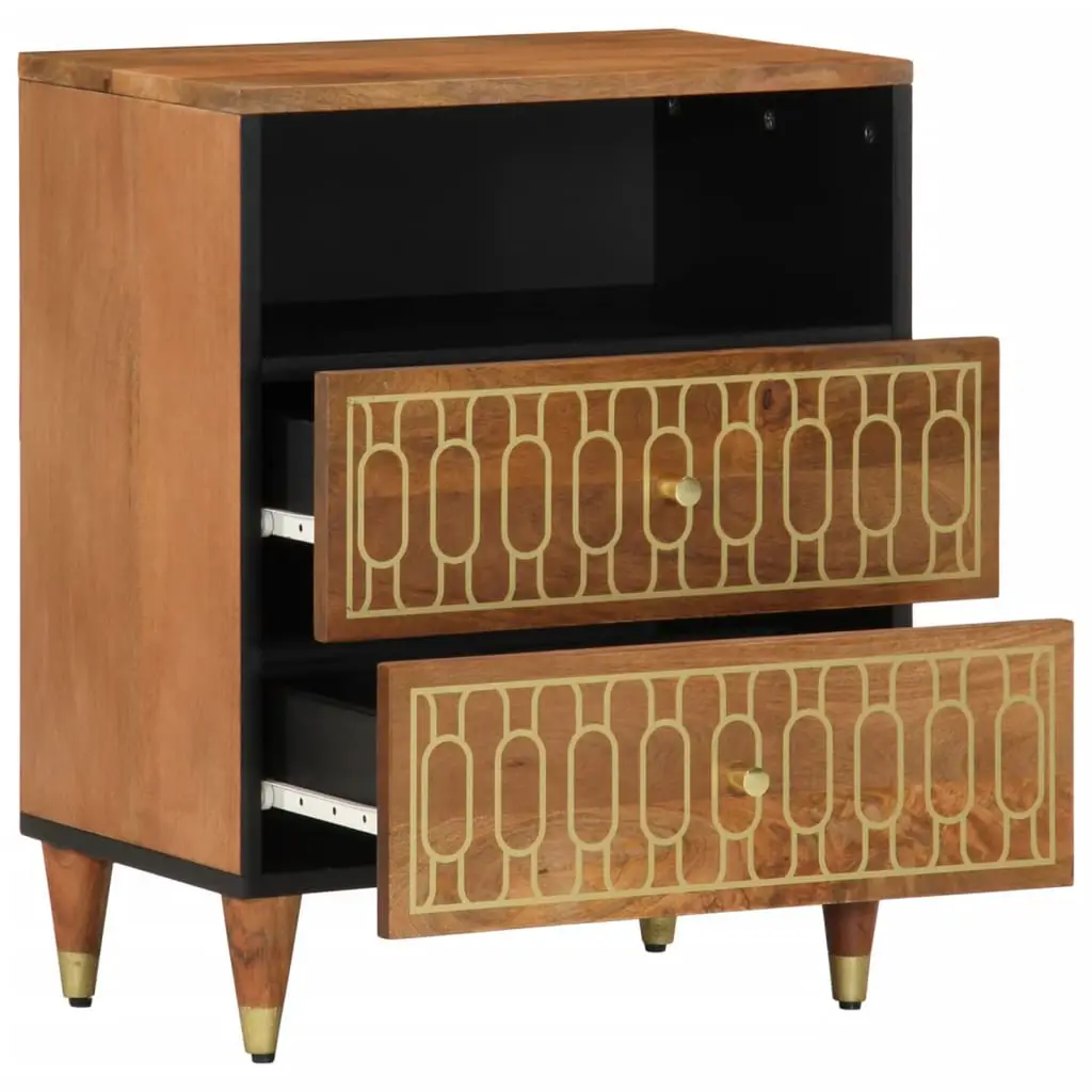 This Retro Solid Mango Wood Bedside Cabinet isn't just furniture; it brings the charm of mid-century design with a smart touch. It's got a smooth surface and a rich honey brown finish, making it a perfect spot next to your bed for lamps, books, or decorative bits, all while giving your bedroom that lovely vibe. The cabinet features two traditional drawers made from solid mango wood. They give you plenty of space for your bedtime essentials, helping you keep everything organized and neat.Each drawer has lovely polished iron knobs, making them easy to open while looking great too.This piece boasts intricate hand-carved floral designs that add a classy touch to your room, making it a real standout.The retro design shows off a tapered leg structure that adds a bit of elegance, suiting various decorating styles.At 24.4 in high, 19.7 in long, and 13.0 in wide, this cabinet is surprisingly roomy while easily fitting next to your bed or sofa.