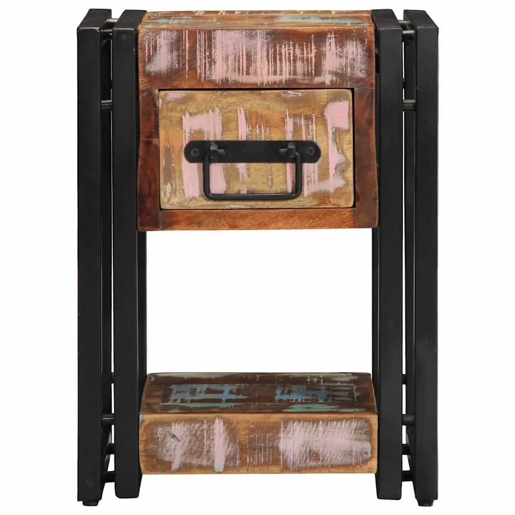 Perfect for rustic lovers, this Wooden Bedside Cabinet has a sturdy build and textured finish, making it a fab addition to any home decor. It’s ideal for the bedroom and adds that charming touch. It’s a neat way to store your essentials, keeping your personal space tidy. Textured Finish: With its rustic design, this bedside cabinet showcases a textured finish that highlights the natural grain pattern, adding a cozy vibe to your bedroom. It brings character and fits right into a country-style setup, giving a vintage feel.Steel Construction: Built with a solid steel frame, this cabinet's made to last. The powder-coated finish helps it withstand wear and tear, keeping it strong and looking good, even with daily use. This sturdy build means you can count on it.Functional Storage: It comes with shelves and compartments, keeping your nighttime essentials close at hand. Whether you’ve got bedside lamps, books, or gadgets, these adaptable shelves fit all your storage needs easily.Elegant Handles: The ring pulls add a touch of class and make it easy to get to your things. These handles blend perfectly with the cabinet’s rustic style, making it a breeze to open and close the drawers.Simple Maintenance: Keeping this cabinet looking good is a snap—just give it a wipe with a dry cloth. This quick care maintains its timeless charm and practicality with hardly any effort.