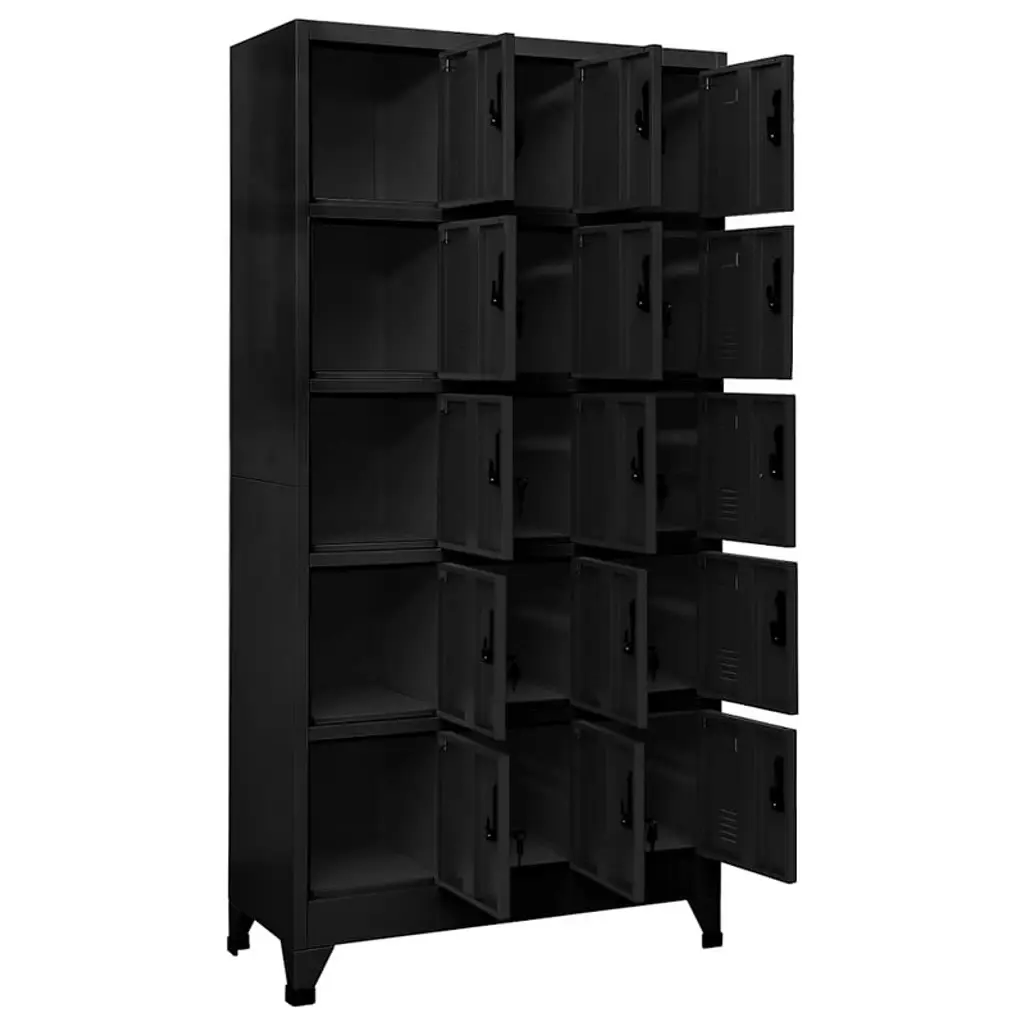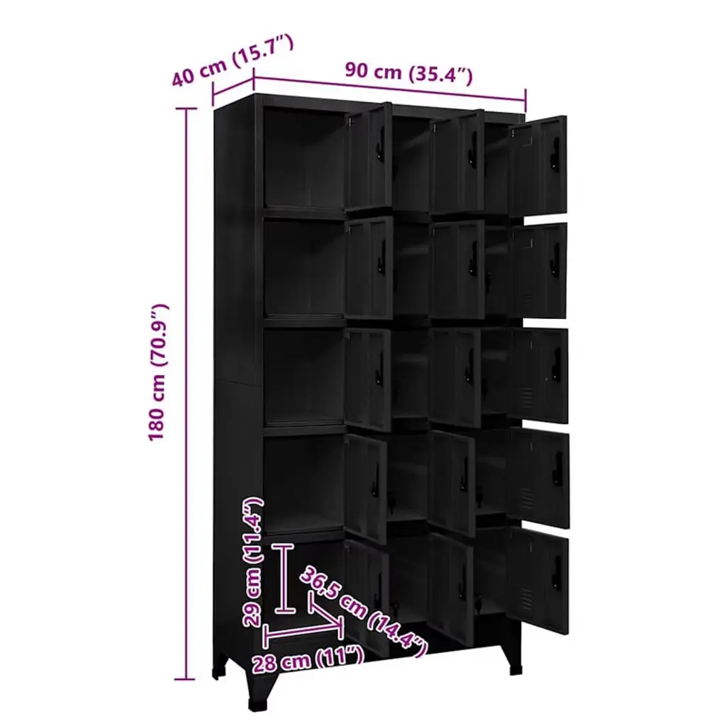 This Modern Black Steel Locker Cabinet is the perfect blend of function and style, great for both work and school settings. With its sleek look and smooth matte finish, it provides plenty of storage while looking fab in any room. Specifications:Color: BlackMaterial: Metal SteelFinish: MatteIndoor/Outdoor: Indoor OnlyNumber of Doors: 15Cover Included: NoRoom: OfficeCapacity: 15 compartments, each holds 22 poundsMaximum Weight: 330 poundsDimensions: 15.7 x 35.4 x 70.9 in (W x L x H)Leg Height: 3.9 inWeight: 97 poundsLadder: NoBrand: vidaXLDelivery Contains: Locker cabinet, keysAssembly Required: YesSKU: 339822EAN: 8720290000000.000000000