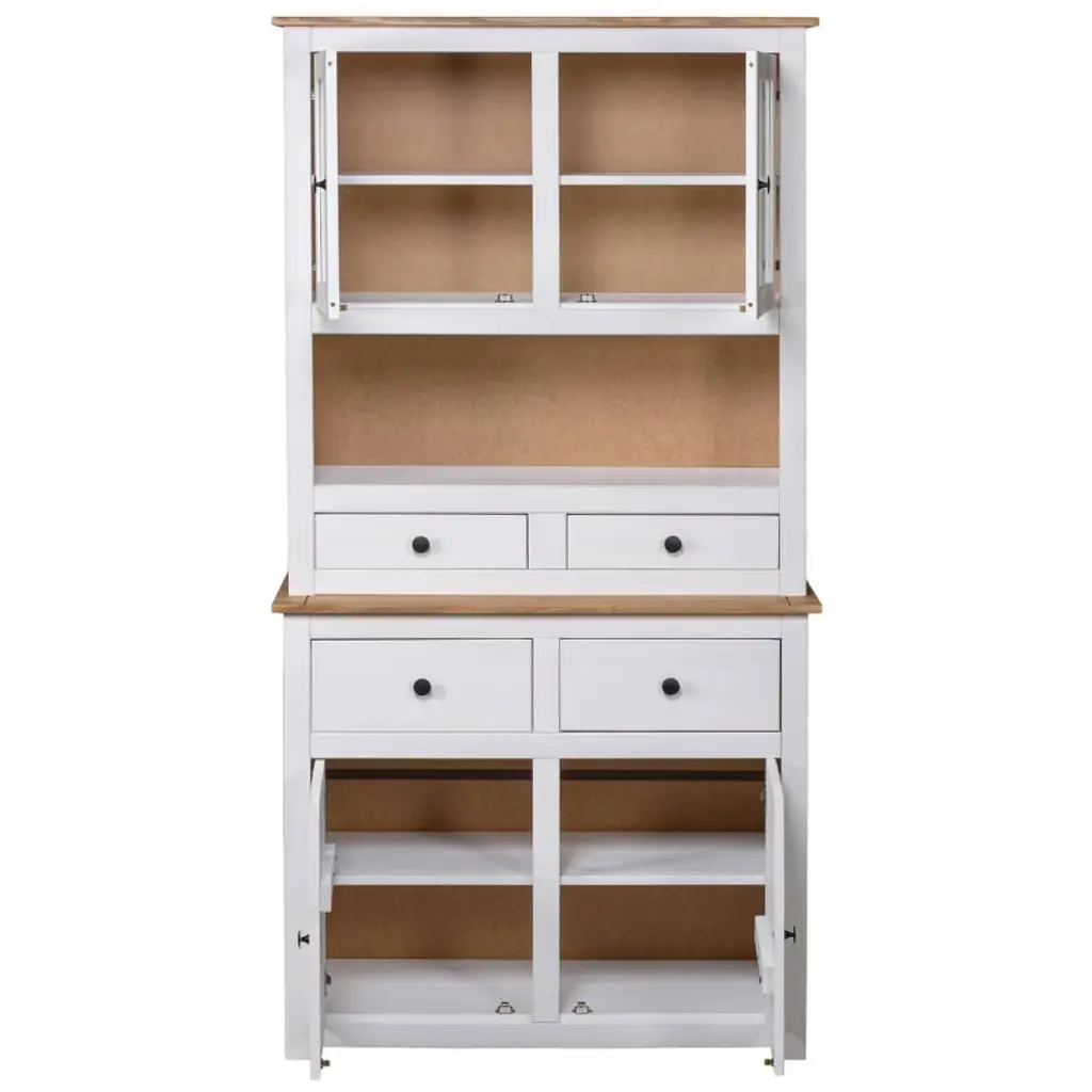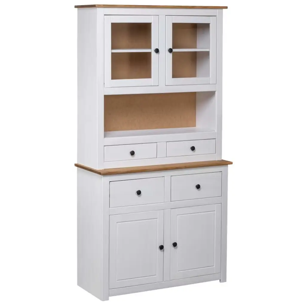 Classic Display and Storage Cabinet This elegant wooden cabinet from the Panama Range is designed to offer both display and storage solutions for your home. Crafted from solid pine and engineered wood, it features a timeless two-tone finish with a natural wood top and is available in both gray and white color options to suit your décor. Display Features • Upper section includes two glass-fronted doors with shelves, perfect for showcasing decorative items, glassware, or collectibles. • Open shelf space below the glass doors provides easy access for frequently used items or stylish display. Ample Storage Space • Two small drawers with round black knobs for organizing smaller essentials. • Two larger drawers and two cabinet doors in the lower section offer generous storage for tableware, linens, or other household items. Design and Versatility • Classic and functional design complements a variety of interior styles, from traditional to modern farmhouse. • Sturdy construction ensures long-lasting durability and reliable use. • Available in Gray and White color options to match your personal style. Enhance your living room, dining area, or kitchen with this versatile cabinet that combines stylish display with practical storage, making it a valuable addition to any home.