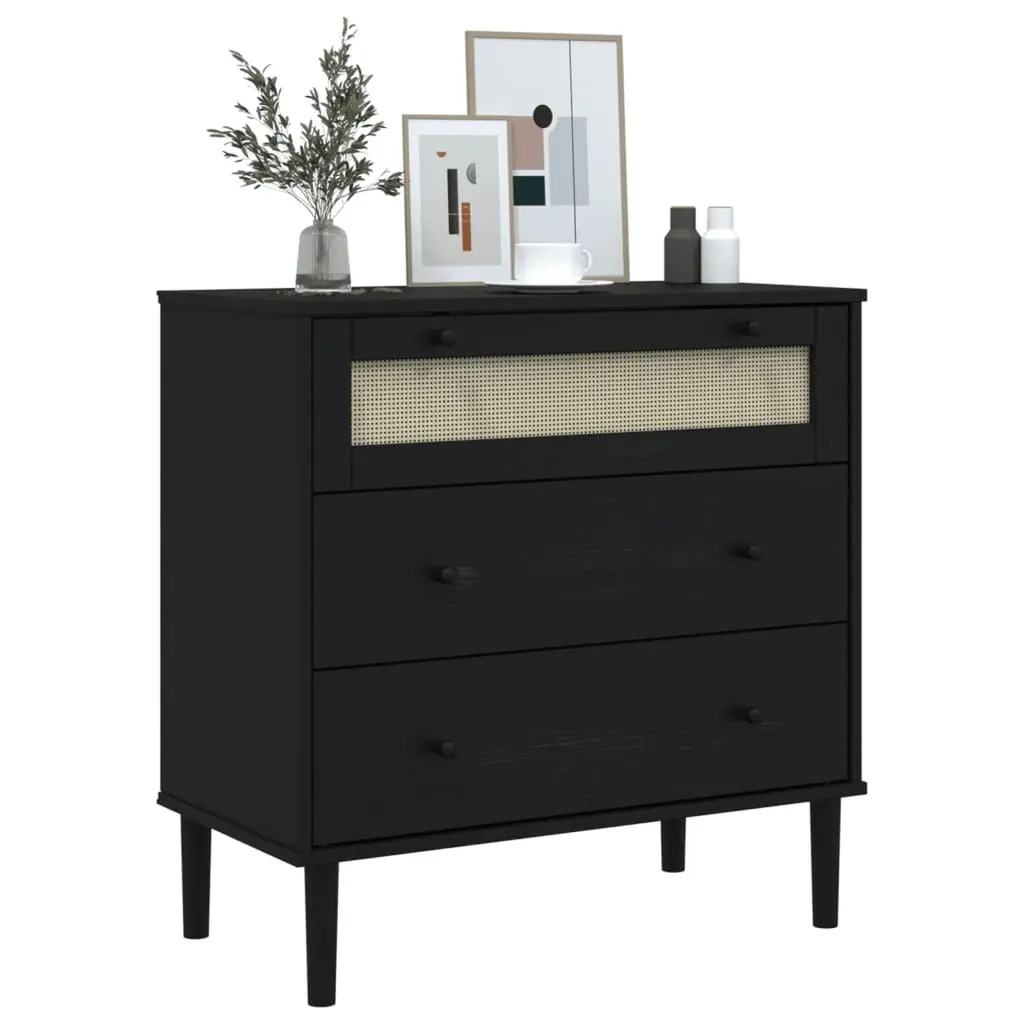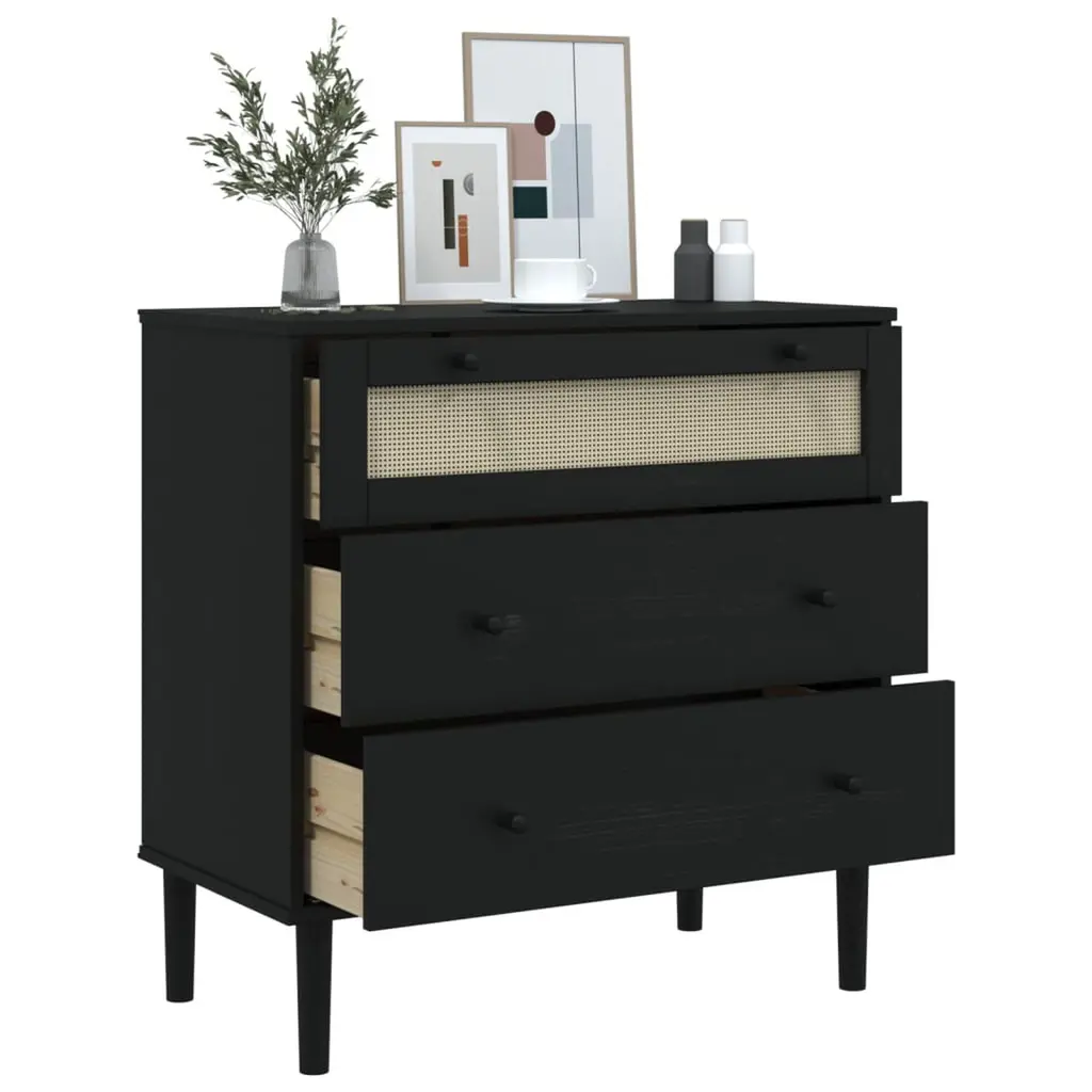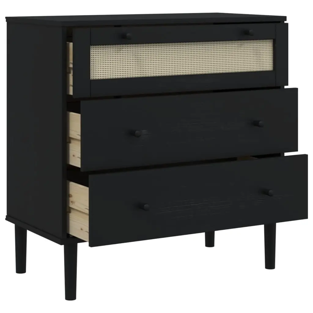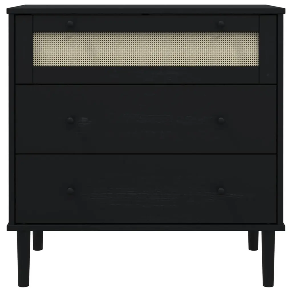 This Drawer Cabinet stands a neat 31.5 in tall, sporting a sleek black finish that adds elegance and functionality to any space. With three generous drawers, it’s designed to sort out your home or office storage needs while dressing up your decor with its mid-century modern style. The ample storage provides three roomy drawers for keeping everything neat and tidy, perfect for storing office supplies or household items. Mid-century modern design is as pleasing to the eye as it is practical, fitting in with various decor styles for your living room, hallway, or office. Made from solid pine wood and engineered wood for durability, giving you confidence in your purchase. The striking poly rattan texture on the top drawer adds a trendy element, combining natural looks with modern functionality. Its dimensions of 31.5 x 15.7 x 31.5 in make it a great medium choice for those needing storage without sacrificing style.