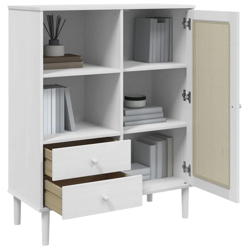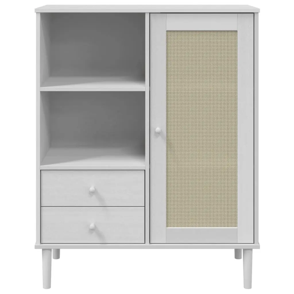 This stylish highboard brings a fresh vibe to your living space while offering loads of storage for your bits and bobs. It's got a lovely rattan look and is made from solid pine, making it both practical and pretty, perfect for showing off and storing your favorite stuff. Ample Storage: This highboard has five solid storage compartments, great for keeping your stuff in order. Whether you want to display decor in the living room or keep everyday items handy, you'll love the space it gives you. The mix of drawers and shelves makes organizing a breeze.Contemporary Design: With its sleek lines and neutral white shade, this piece will fit in beautifully with various styles. The rattan look surface adds a nice touch of texture, making it a stunning addition to your home. This highboard is not just furniture; it's a statement.Durable Construction: Built from solid pine, this highboard is made to last. The poly rattan on the doors not only boosts durability but also keeps things stylish and easy to clean, making it perfect for indoor use.Functional Dimensions: With a height of 44.1 in, width of 35.4 in, and depth of 15.7 in, this highboard has a strong presence without overwhelming your room. Its dimensions are perfect for corners or against walls, making the most of your space.Easy Assembly: Putting this highboard together is a breeze with the included instructions, making it user-friendly for everyone. Enjoy a quick setup and watch your space transform with this lovely storage piece.