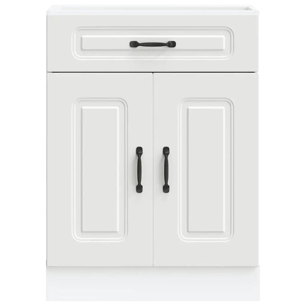 This kitchen base cabinet is all about looking good and getting the job done. It's got a sleek white finish, smooth lines, and a minimalist design that fits into any kitchen vibe effortlessly, whether you need it for utensils or to pop a sink in. Ample Storage: The cabinet has loads of room with a drawer and two doors to keep your kitchen items neat and easy to reach. Perfect for pots, pans, and other kitchen tools, helping you stay organized.Adjustable Feet: With adjustable feet, you can set its height to keep it stable on uneven floors, making sure it stays put while you cook.Modern Design: The trendy white finish with black handles gives it a stylish look that fits all sorts of kitchen styles. It’s not just practical, but it adds to your kitchen’s flair.Durable Material: Made from quality engineered wood, this cabinet can handle moisture and heat, making it a solid storage option for years. Its smooth surface makes cleaning a breeze.Versatile Use: Great for various kitchen storage needs, it can keep everything from cookware to small appliances organized, adapting to your changing needs while looking sharp.