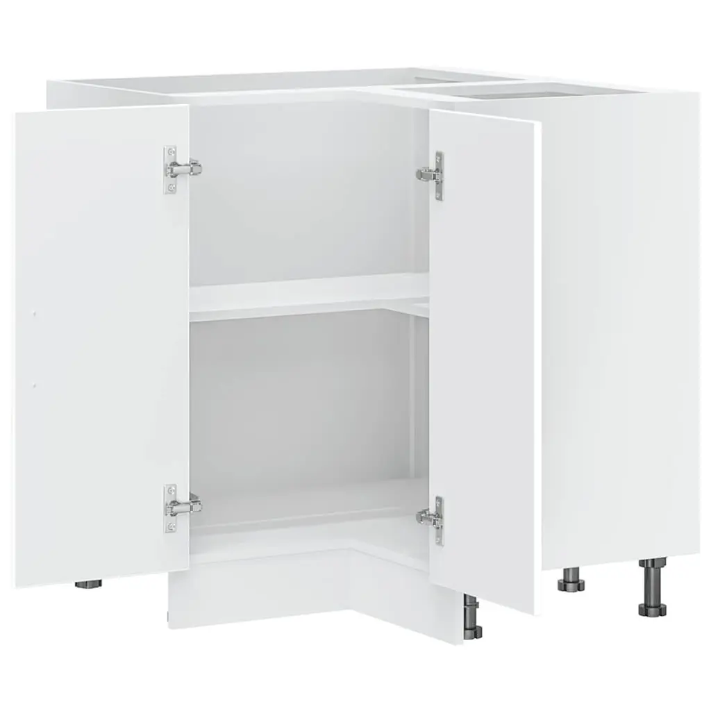This kitchen corner base cabinet is spot on for your cooking area, blending functionality and style. With its modern look and shiny white finish, it lifts the vibe of any kitchen while giving you plenty of room for your gadgets and utensils. Ample Storage: This cabinet has three roomy compartments, so you can keep all your kitchen essentials neat and close at hand.Adjustable Feet: The height-adjustable feet work with any uneven flooring, so it’s nice and steady.High-Gloss Finish: The shiny coat adds a modern touch, reflecting light and making your kitchen feel bigger.Durable Build: Made from engineered wood, this cabinet handles moisture well and offers a solid storage option.Two Hinge Doors: The cabinet has two standard doors that open easily for quick access to your stuff.