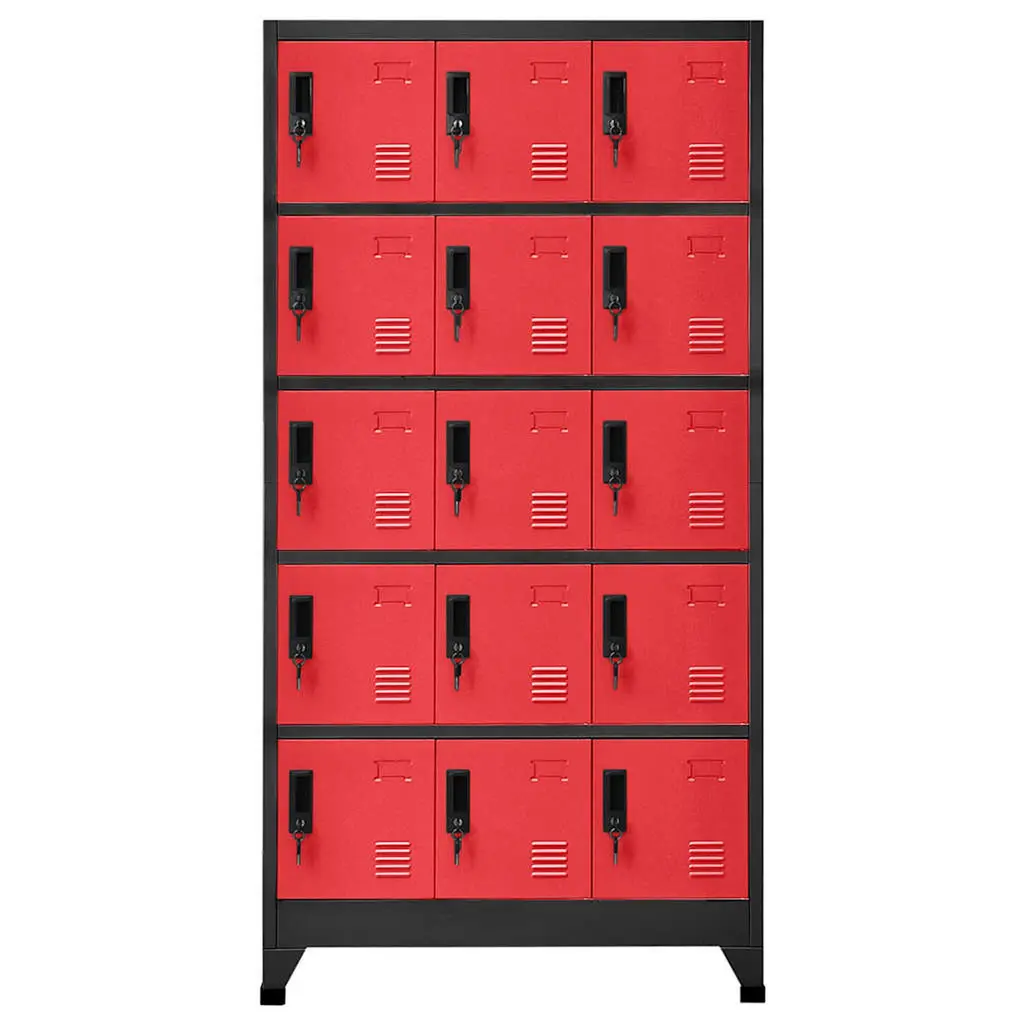 This locker cabinet turns any office or school space into a tidy and productive area. With its modern rectangular design, the sleek anthracite and red color scheme not only offers plenty of storage but also enhances the look of any room it’s in, making it a must-have for those who want style and functionality. Ample Storage: With 15 roomy compartments, this locker cabinet keeps your essential items organized and easy to access. It's designed to fit various storage needs, whether it's for documents, personal gear, or supplies. Durable Construction: Made from tough steel, this cabinet is built to last and is a breeze to clean. Its solid structure ensures it's reliable, perfect for busy places like offices and schools. Secure Locking System: Each locker comes with a cam lock for extra security. You can relax knowing your stuff is safe in a hectic environment where privacy matters. Stylish Design: The anthracite and red combination makes a striking visual impact while blending into modern styles. Its smooth surface and powder-coated finish offer a sleek look that enhances any workspace vibe. Recommended Uses: Perfect for both offices and schools, this spacious storage solution fits various users, from admin staff needing organized document storage to students wanting privacy for their belongings during school hours.