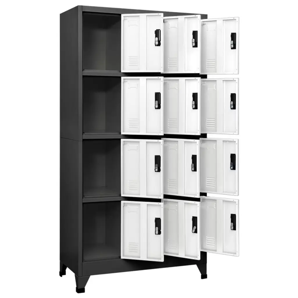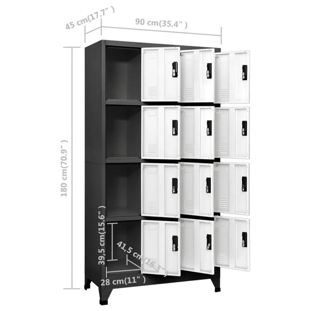 This locker cabinet is designed to offer great storage while looking stylish too. With a sleek modern look, it combines anthracite grey and white finishes, fitting right in with contemporary decor trends and making it easy to organize your office or home. Specifications:Color: Anthracite Material: SteelFinish: Powder-Coated Indoor/Outdoor: Indoor OnlyNumber of Doors: 12Cover Included: NoRoom: OfficeCapacity: Good for clothes and personal items.Maximum Weight: 396.8 lbsDimensions: 17.7 x 35.4 x 70.9 in (W x L x H)Leg Height: 11.0 inWeight: 97.0 lbsLadder: NoBrand: vidaXLDelivery Contains: 1 locker cabinet, 24 keys (2 for each door)Assembly Required: YesSKU: 339816EAN: 8720290000000.000000000