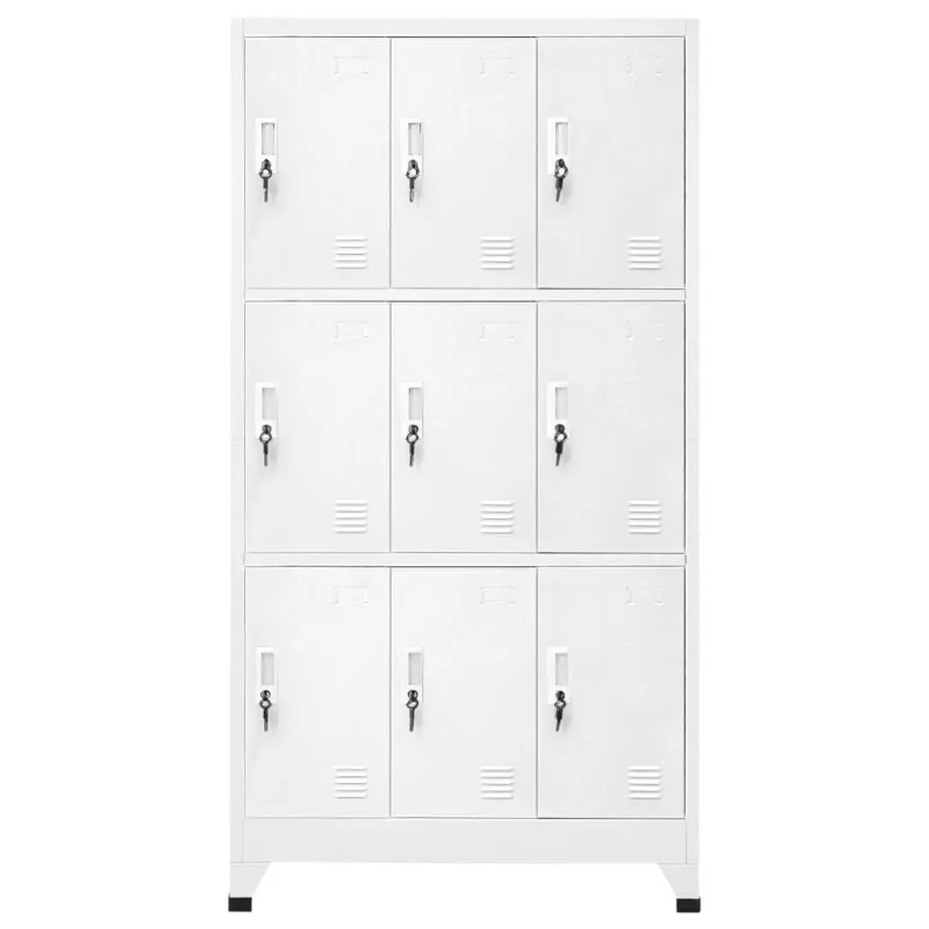 This Steel Locker Cabinet with 9 lockable doors stands tall at 70.9 in, making it a must-have for any office or utility room. The sleek black finish not only provides a modern look but also ensures that it matches a variety of décor styles while offering plenty of storage for various items. Ample Storage: This cabinet gives you loads of space to keep all your essentials safe, from office files to cleaning supplies. It’s perfect for anyone who wants a smart way to keep items sorted and easy to find. Secure Locking Mechanism: Each of the nine compartments has a solid locking system, so you can rest easy knowing your stuff is securely stored. This is especially handy when you need to keep things private in shared spaces or workplaces. Contemporary Design: The modern look of this locker cabinet makes it a flexible addition to any room. Its sleek metal design not only looks good but also fits well with contemporary furniture, making it a stylish and practical piece in your setup. Durable Construction: Built from high-quality steel, this cabinet is made to last and withstand wear and tear. Its powder-coated finish makes cleaning a breeze, so it stays looking neat and professional in any setting. Efficient Dimensions: Measuring 35.4 in wide, 17.7 in deep, and standing 70.9 in tall, this cabinet strikes a great balance between storage capacity and space efficiency, making it ideal for different environments.
