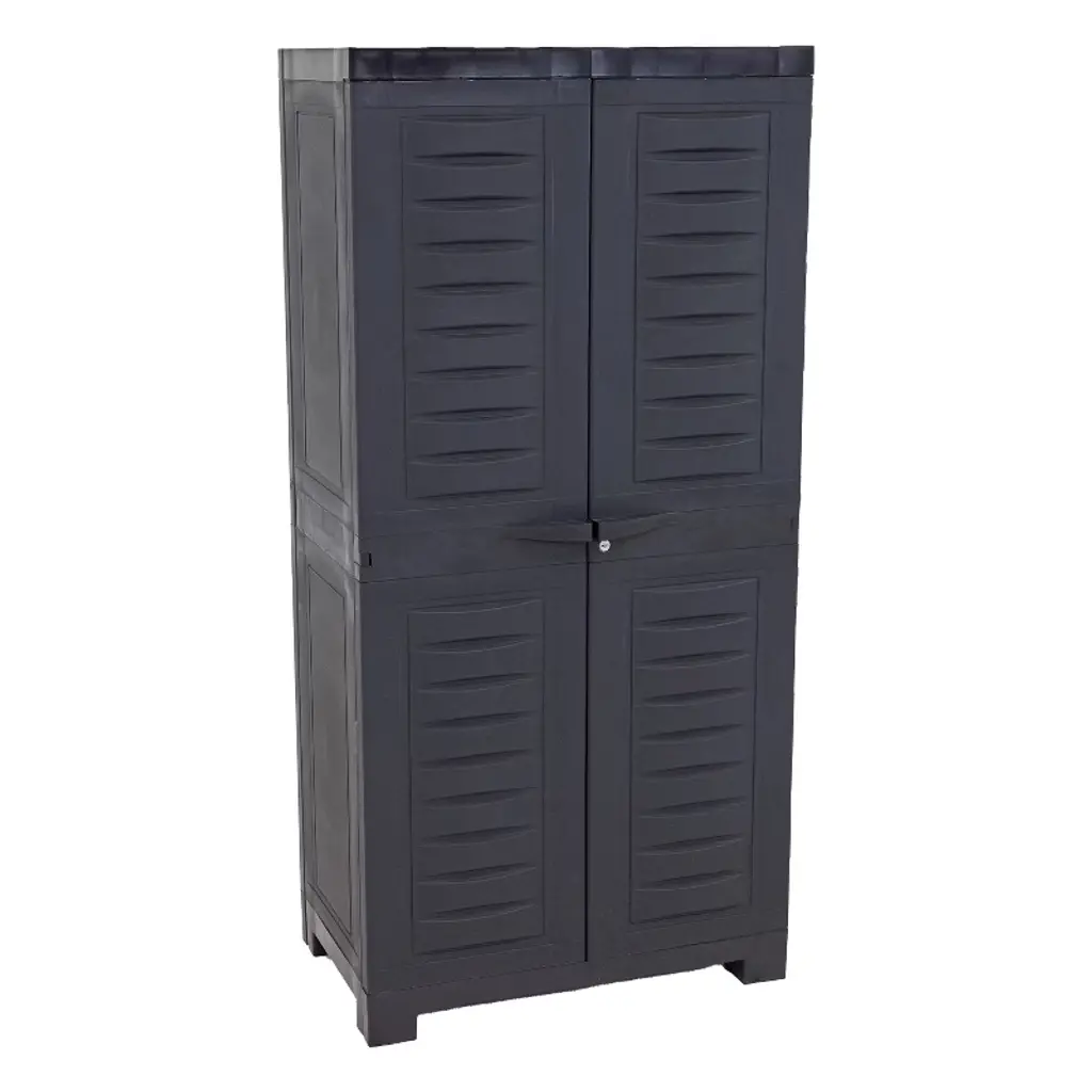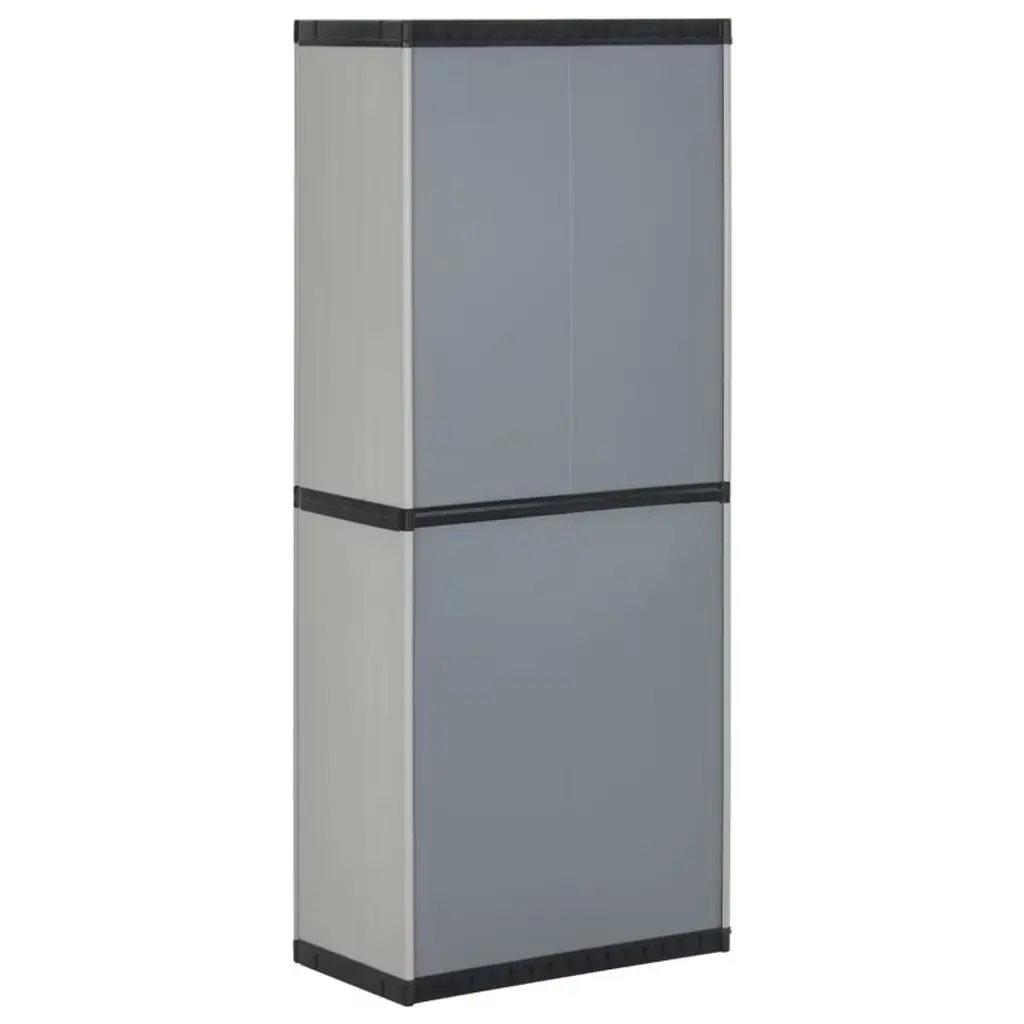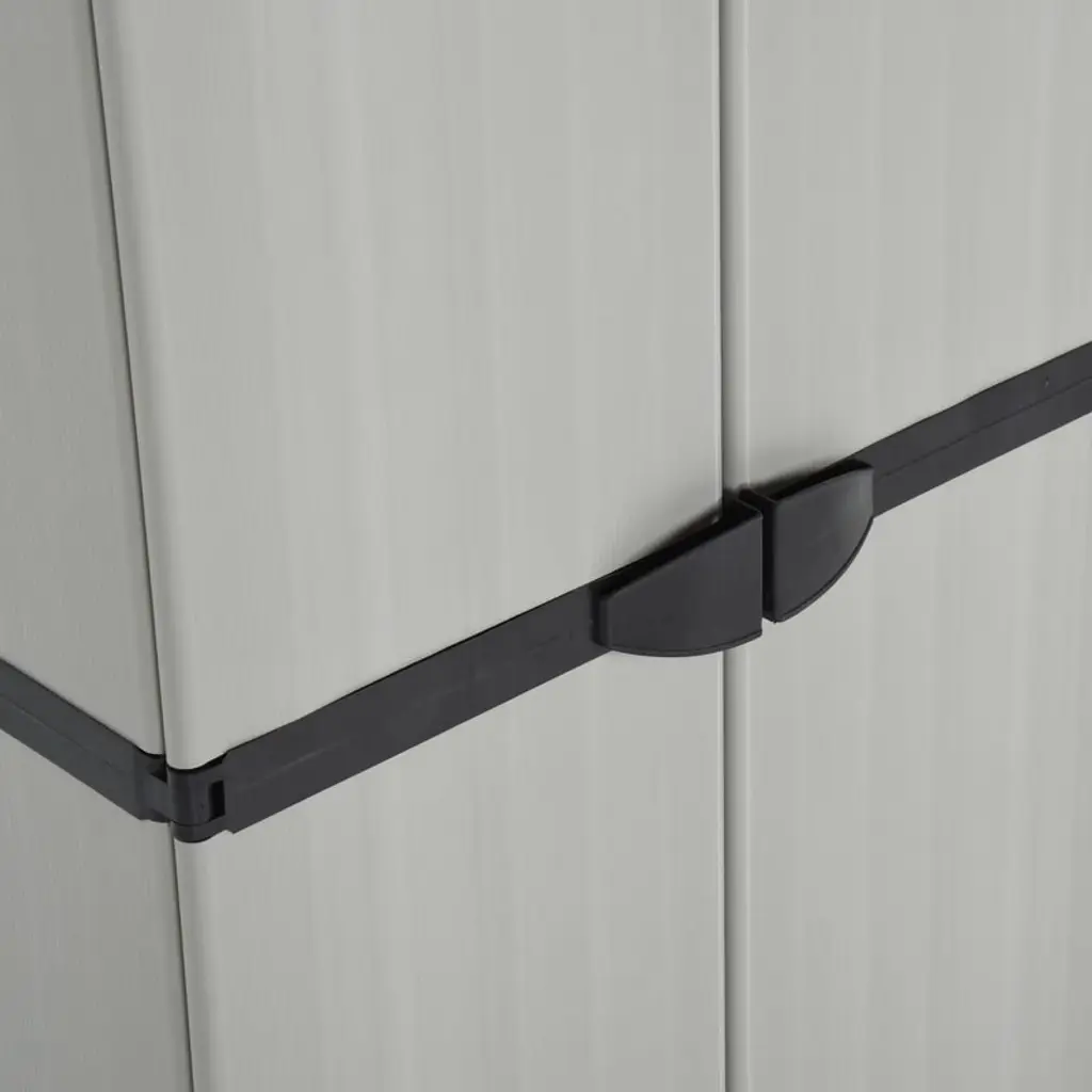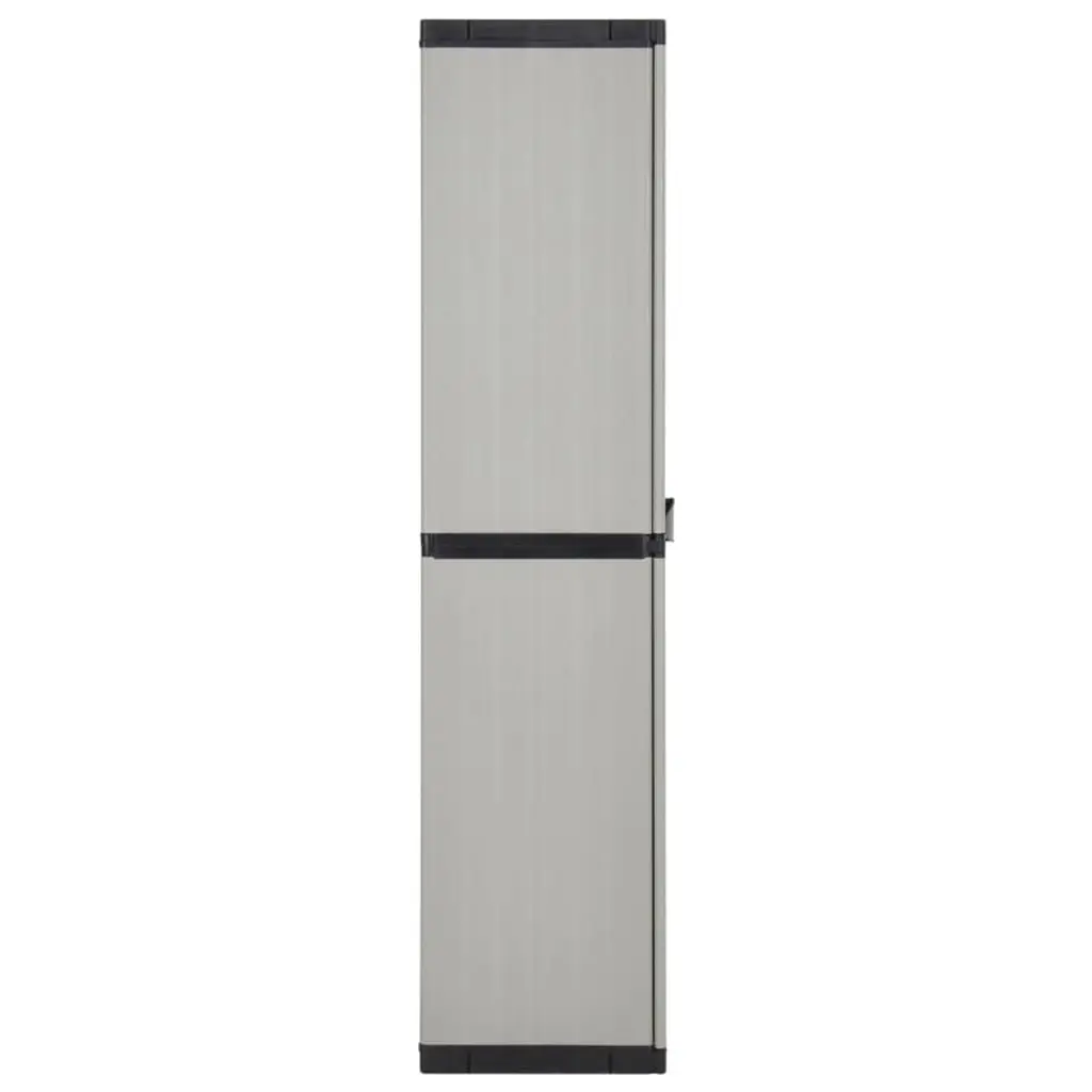 This garden storage cabinet is designed to blend seamlessly into any outdoor or indoor space with its timeless gray and black color scheme and modern, minimalist styling. Perfect for use in the garden, patio, balcony, garage, or utility room, it offers a practical storage solution for keeping your essentials organized and protected.Durable Construction• Made from sturdy PVC and PP (polypropylene) for long-lasting durability• Weather-resistant and easy to clean, ideal for outdoor use• Matte finish with subtle vertical grooves for a modern lookSpacious & Secure Storage• Features 3 adjustable shelves to accommodate items of various sizes• Each shelf supports up to 44.1 lb• Lockable doors (padlock not included) for added security• Each shelf includes a security lock to keep it in placeCompact & Functional Design• Slim footprint makes the most of limited space• Double doors provide easy access to contents• Dimensions: 26.8" W x 15.7" D x 66.1" H• Net weight: 24.3 lbAssembly & Safety• Assembly required (easy-to-follow instructions included)• For safety, use with a wall attachment device (not included) to prevent tippingIdeal Uses• Store gardening tools, outdoor cushions, cleaning supplies, or household essentials• Suitable for patios, balconies, garages, sheds, or laundry roomsSKU: 340983