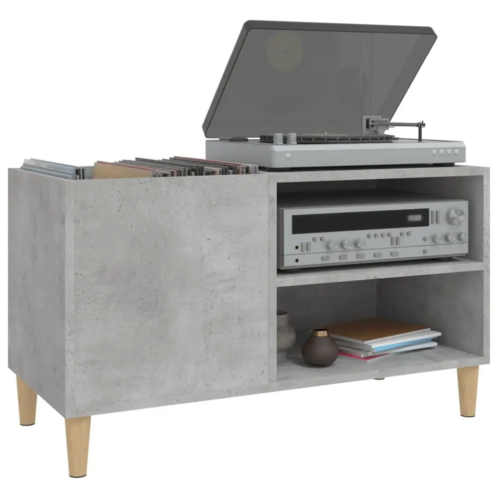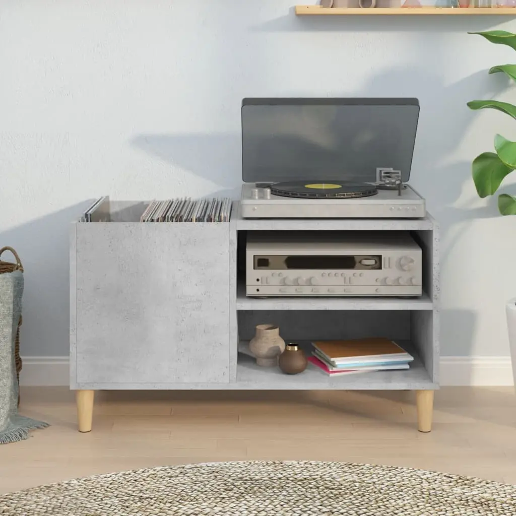 This modern record player storage cabinet is the perfect mix of practicality and style, designed to be an elegant home for your vinyl collection while jazzing up your living space. With a slick matte concrete gray finish and solid build, this cabinet works as a great storage solution and looks good anywhere, whether in the living room or office. Ample Storage: With multiple shelves, this cabinet gives you loads of space for your LP records, letting you keep everything organized and displayed easily. You won’t have to worry about cluttering your space, making it perfect for any music fan who wants quick access to their fave albums.Sturdy Construction: Built from top-quality engineered and solid eucalyptus wood, this cabinet is tough and durable. The strong wood legs add stability, making sure your records stay safe while looking good.Sleek Design: The modern matte gray finish is not just stylish but also super versatile. It fits in well with all sorts of interior styles, from minimalist to quirky, giving your home a lovely vibe.Versatile Use: This cabinet is more than just a record holder; it can also be used as a sideboard or display unit for your favorite decor items or gadgets. Its smart design makes it a multifunctional piece, good for lots of setups in your home.Easy Maintenance: With a smooth surface that’s easy to clean, keeping this unit looking sharp is a breeze. Just give it a quick wipe with a damp cloth to keep its appearance fresh, ensuring it enhances your decor for ages.