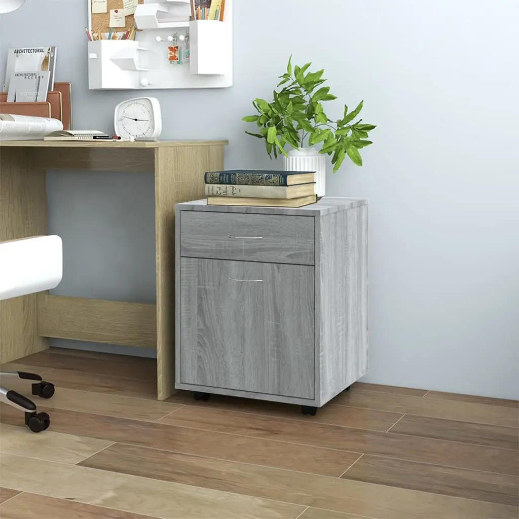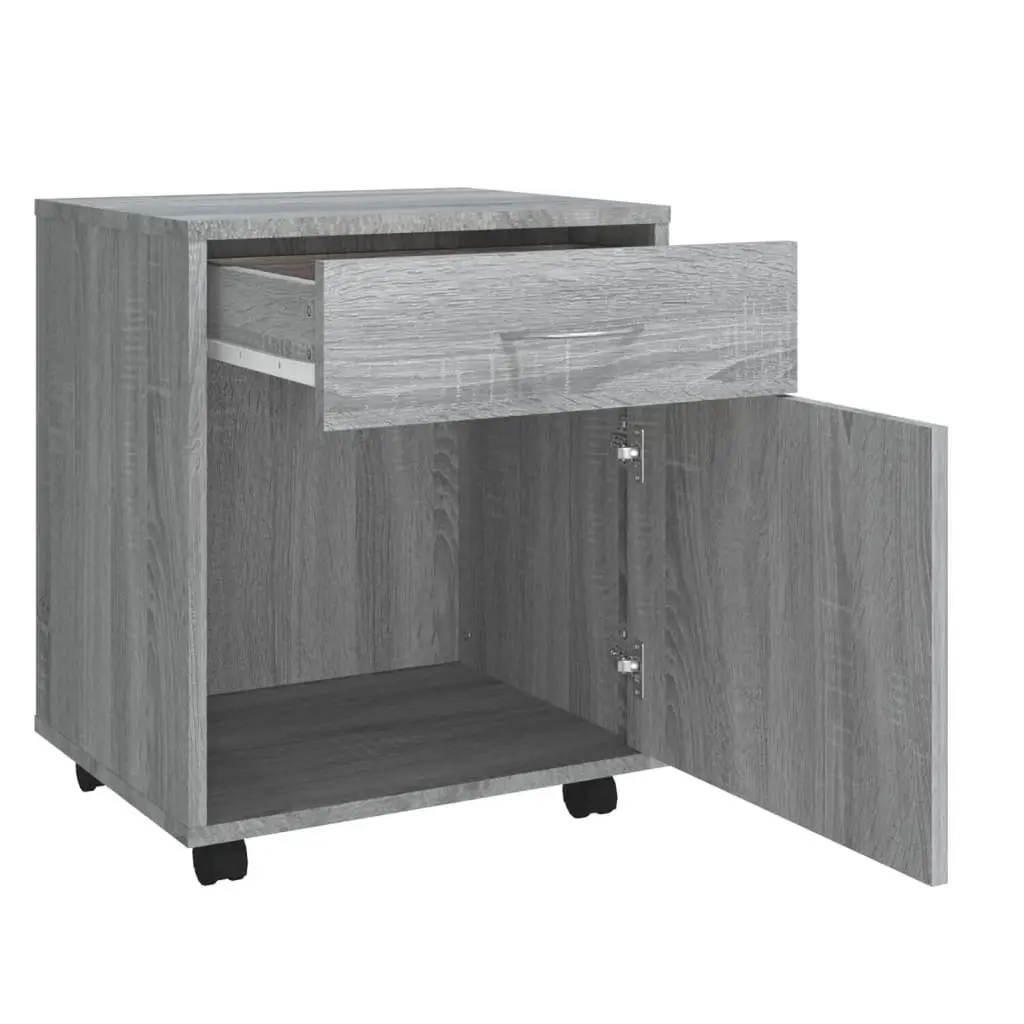 This Grey Sonoma Rolling Storage Cabinet is all about great looks and practicality. It gives you heaps of storage while blending smoothly into any modern setup. With its sleek matte finish and versatile style, it’s perfect for both your office and living room—ideal for professionals who want organized spaces without losing out on style. Space-Saving Design: The compact rolling cabinet is sized just right for smaller areas at 17.7 in long, 15.0 in wide, and 21.3 in tall, while still offering plenty of storage for your office supplies or personal items.Mobility: With its four lockable wheels, you can shift it about with ease and secure it in place whenever you need, making it a convenient add-on to your storage options.Stylish Appearance: Its modern grey sonoma finish matches both contemporary and minimalistic decor, adding a touch of style to your workspace or home.Durable Construction: Made from engineered wood, this cabinet is water-resistant and easy to clean, keeping it looking sharp for ages.Efficient Storage: With a pull drawer and a spacious compartment, it gives you loads of room for keeping things tidy and easy to access.