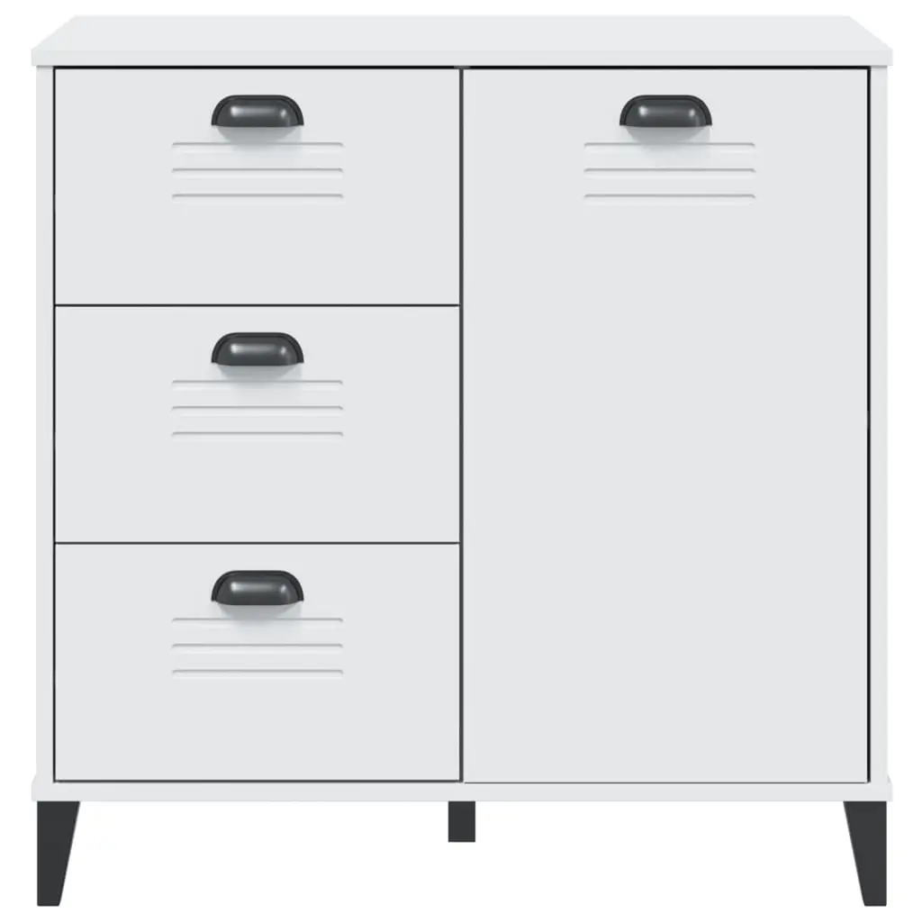 This Industrial Style White Sideboard combines practicality with modern looks, perfect for sprucing up your space while providing handy storage options. With its sleek white finish, it fits beautifully in hallways, dining areas, or living rooms, making it an excellent choice for contemporary settings. Spacious Design: With three drawers and a cupboard, this sideboard has tons of room to keep your kitchen gear, linens, or personal items neat and out of sight.Durable Build: Constructed from quality engineered wood, this sideboard is made to last, making it a reliable piece in your home.Chic Industrial Look: Its modern industrial style fits perfectly with all sorts of home decor, turning heads and getting compliments.Easy Accessibility: With a hinge door and easy-grip handles, this sideboard makes reaching your stuff a piece of cake - super simple for everyday use.Effortless Care: The smooth surface is really easy to clean with just a damp cloth, so it’ll stay looking fresh for a long time.