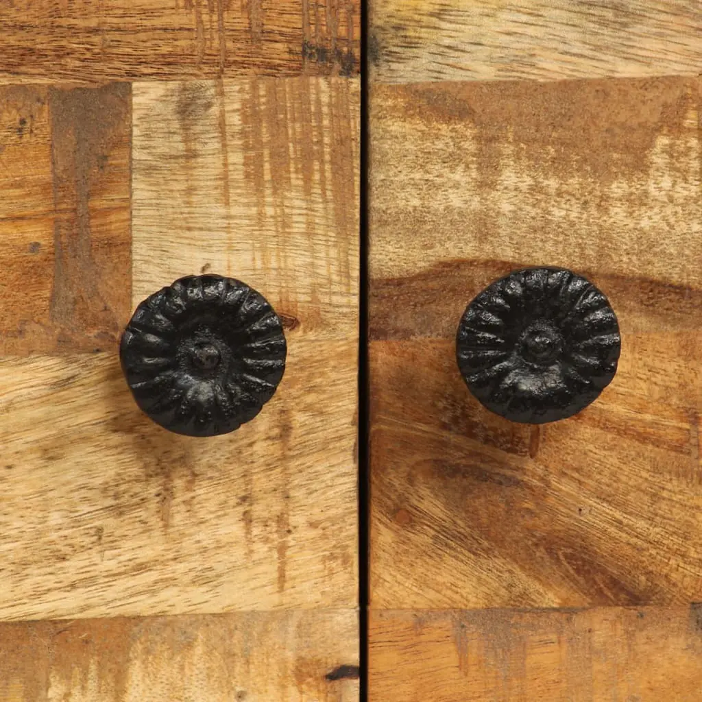 This Rustic Solid Mango Wood TV Cabinet is a lovely addition to any living room, mixing function with natural charm. Its warm brown tones and polished black touches make it a striking piece, perfect for showing off your TV and media gear while keeping a cozy, farmhouse feel. Ample Storage: This TV cabinet has tons of space with its shelves and two solid wood doors for storing all sorts of media items, DVDs, and gaming consoles. Its smart design keeps everything organized while showing off your entertainment setup nicely. More storage means less clutter and more room to relax. Stylish Design: With its rustic charm and lovely motifs, this cabinet is not just useful – it’s also a piece of art. The polished finish adds a touch of sophistication, making it a good fit for both modern and traditional decor. It’s designed to catch the eye while seamlessly matching your home. Durability: Built from solid mango wood, this cabinet is made to last. Mango wood is known for its toughness and strength, meaning this piece will stick around for ages and provide a solid base for your TV. Rest easy knowing you’re investing in something durable. Versatile Use: This cabinet is good for lots of uses, from being an entertainment unit to showcasing plants or decor items. Its practicality means it works in different rooms, making it a flexible addition to your home. Use it in your living area, dining room, or dedicated entertainment space. Easy Maintenance: Just a bit of dusting and a wipe with a damp cloth keeps it looking fresh and new. Applying a bit of furniture polish occasionally helps keep the wood's glossy look, ensuring your cabinet stays in great shape while showing off its natural beauty.