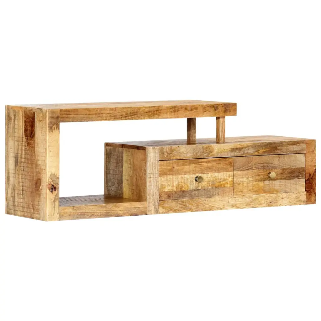 This Solid Mango Wood TV Cabinet is a top blend of style and functionality. It's got a rustic look and showcases the lovely natural grain of the wood, making it an appealing piece in any living room. The rich brown finish enhances its appearance and complements many decor styles, while its smart design provides ample space for your TV setup and gadgets like DVD players and game consoles. Ample Storage: With three spacious drawers and a large shelf, this TV cabinet easily holds your must-have entertainment gear. The roomy drawers keep smaller items tidy and out of view, so your room stays looking great. Rustic Style: Featuring a warm brown color and a natural wood texture, this cabinet creates a cozy feel reminiscent of charming farmhouse decor. Its timeless design helps it blend seamlessly into various interior styles, enhancing the beauty of any space. Durability: Built from solid mango wood, known for its strength and longevity, this cabinet is designed to last while keeping its good looks. The sturdy frame supports your TV securely, making it a smart choice for your home. Easy Maintenance: The polished and lacquered finishes not only look great but also make cleaning a breeze. A quick wipe with a cloth keeps it pristine and dust-free. Suitable for Living Room: This TV cabinet's made for indoor use, ideally placed in your living room, adding both function and a nice vibe to the space where you gather with family and friends.