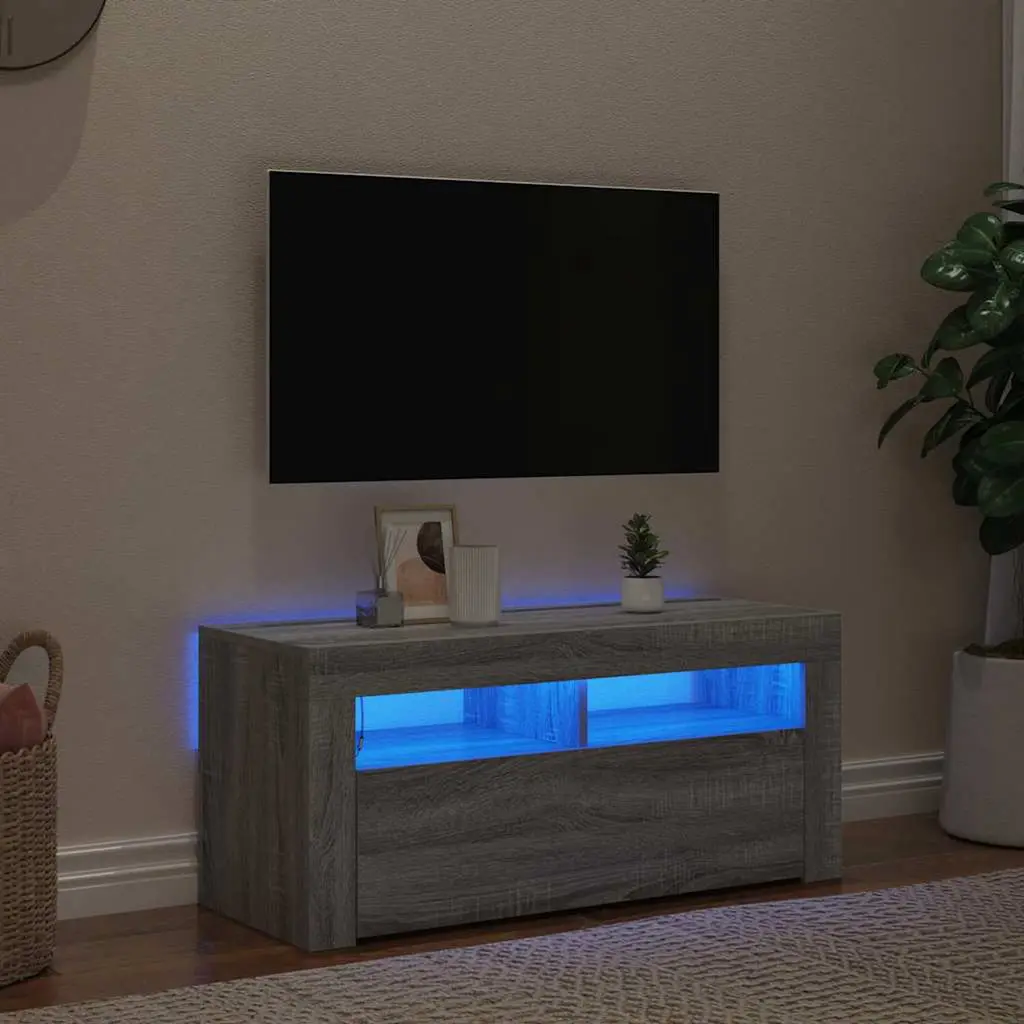 This modern TV cabinet is a stylish centerpiece for your living area while offering handy storage options. With its sleek gray sonoma finish, it fits in nicely with different styles, boosting the vibe of your home theater or lounge with its elegant look and smart features. Ample Storage: This cabinet boasts generous compartments, keeping your multimedia stuff tidy and your living space neat.Built-In LED Lighting: With RGB LED lights, this cabinet sets the mood for any occasion, enhancing your view whether you’re hosting or just chilling in.Matte Finish: The matte surface gives a sophisticated look and reduces glare, perfect for displaying your TV and decor.Easy Assembly: Straightforward instructions mean you'll have this unit ready in no time, giving you hassle-free stylish storage.Versatile Use: Great for living rooms or home theaters, this cabinet fits seamlessly into any space, boosting your interior's functionality and aesthetics. The product comes with a USB connector, but you won't find the certified 5V USB power source in the box.