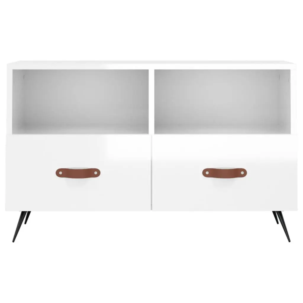 This TV cabinet stands out with its sleek high gloss white finish, effortlessly fitting into any contemporary living room. With an industrial touch, it's not just for storing your gadgets; it also adds flair to your space, giving you a spot to show off decor or your favorite plants. Ample Storage: This TV cabinet features two spacious drawers and adjustable shelves, giving you plenty of space for your media devices, gaming consoles, and decor items. Keep everything organized and tidy to reduce clutter.Durable Design: Made with high-quality engineered wood, it looks great and is built to last. The shiny finish is easy to clean and keeps it looking fresh.Stability: Robust iron hairpin legs provide excellent stability, so you can easily support all sorts of electronics.Versatile Design: Its sleek look fits in nicely with any decor, whether you’re in a modern apartment or a traditional home.Ideal Dimensions: Sized at 31.5 inches long, 14.2 inches wide, and 19.7 inches high, it fits standard TVs perfectly without taking up too much space.