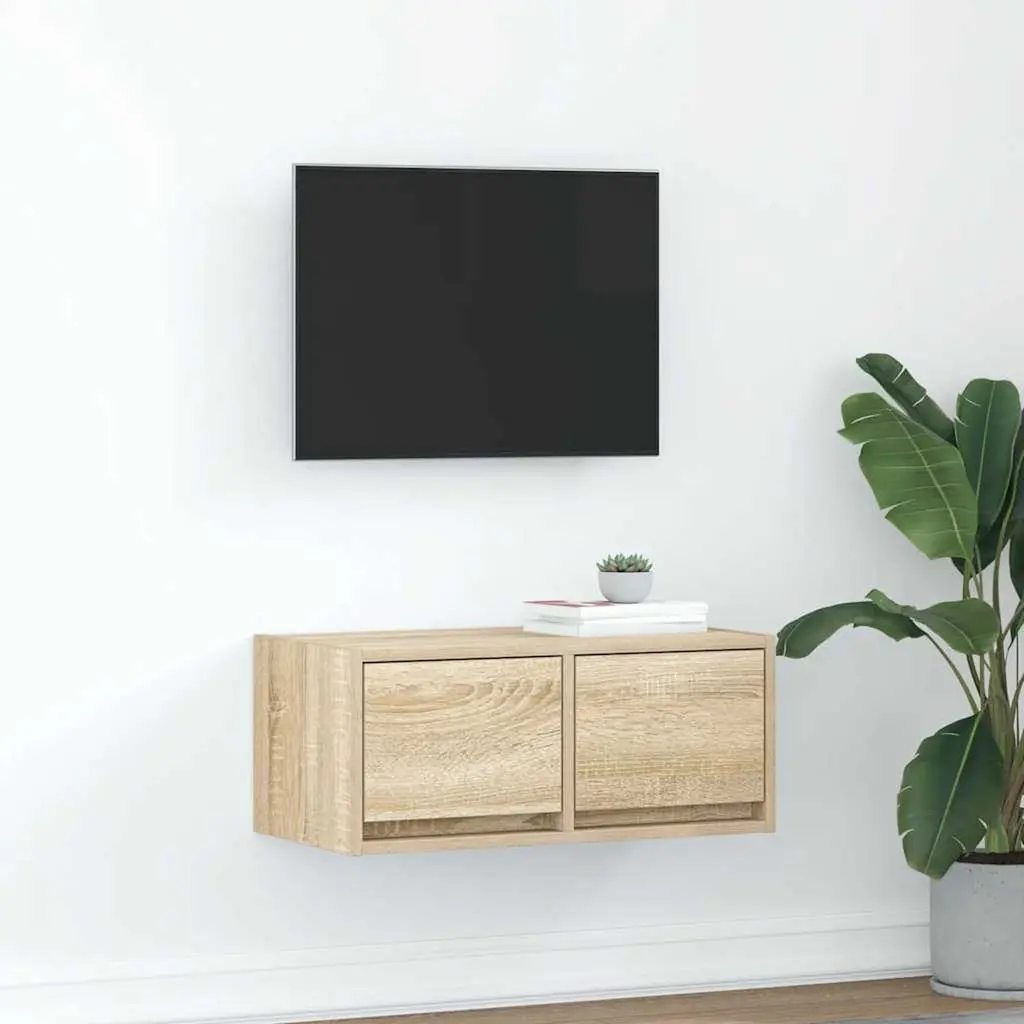 This Sonoma Oak Wall-Mounted TV Cabinet does an awesome job of blending practicality with style, perfect for your living room or bedroom. The sleek design and smooth finish create a great vibe, making it a perfect fit for all kinds of decor while neatly holding your TV and accessories. Ample Storage: With two drawers, you've got loads of room for your media stuff and cables, keeping everything neat and easy to grab.Wall-Mounted Design: Perfect for tight spaces, this design elevates your TV setup and gives your room a tidy look.Modern Aesthetic: The Sonoma oak finish is warm and trendy, blending seamlessly with your existing pieces, bringing style to any space.Easy Assembly: Putting this cabinet together is a breeze with clear instructions and hardware included, even if you're not a DIY whiz.Versatile Use: Great for the living room, bedroom, or other indoor spots. This unit serves as a handy entertainment center while showcasing your TV and decor.