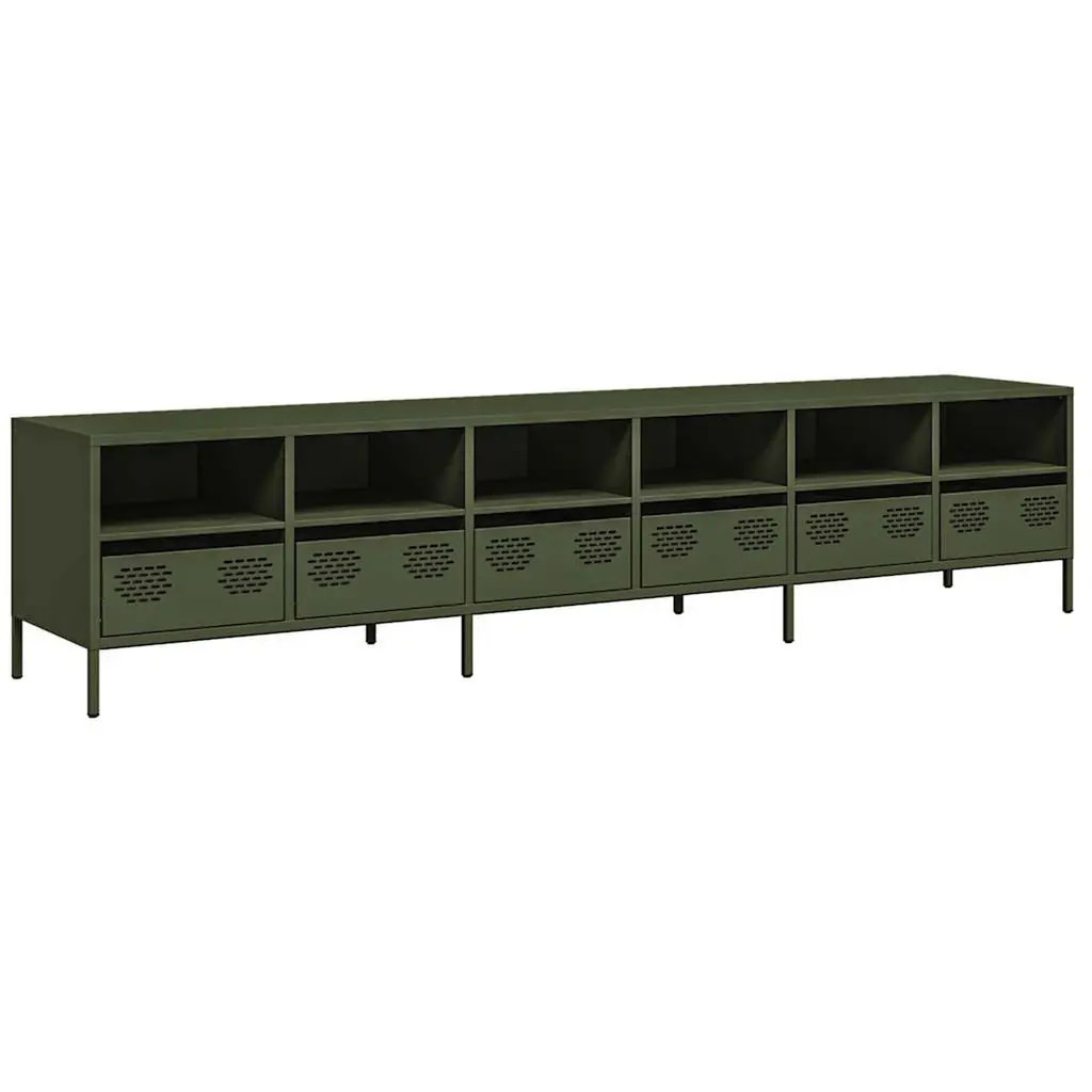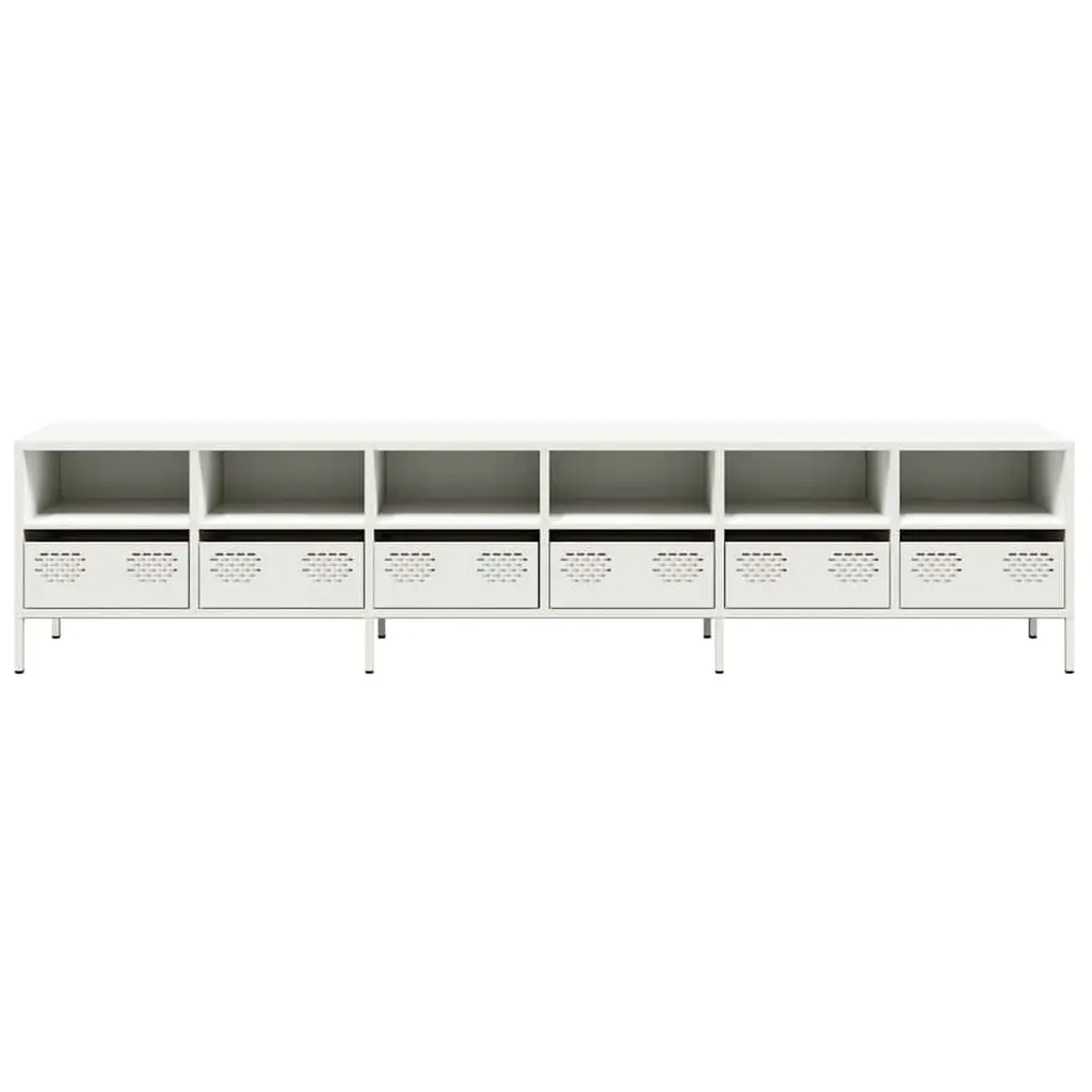 This modern TV cabinet makes a bold statement in any living room or bedroom, showcasing a stylish, minimalist design with its sleek white finish that fits in with all sorts of decor. With dimensions of 79.5 in long, 15.4 in wide, and 17.1 in high, it provides a large surface for your TV and plenty of storage space for media devices, decor, or everyday bits and bobs. This cabinet features six standard drawers made from sturdy steel, great for storing remote controls, games, and other media bits, keeping your space neat and organized.The built-in shelves provide a lovely spot to display decorative items or cherished collectibles, showing off your style while keeping things tidy.Constructed with a strong metal frame, this cabinet has a powder-coated finish for durability and resistance to wear and tear, making it perfect for everyday use.With a length of 79.5 in, it's well-suited for big-screen TVs and offers flexible placement, whether against a wall or as a stylish room divider.Designed strictly for indoor use, it fits right into your living room or bedroom, adding to the vibe with its clean yet stylish look.