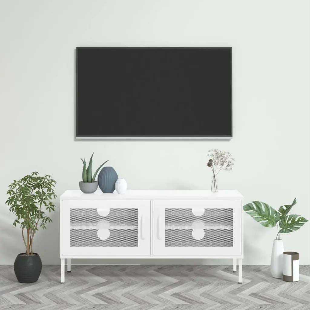This TV cabinet is a smart storage solution that combines style and practicality for modern living. With its powder-coated white steel design, it has a clean and minimal vibe, making it a lovely addition to any living room, bedroom, or entertainment corner, while keeping your media items neat and easy to grab. Stylish Appearance: The sleek white finish and metal build give a polished look that fits a bunch of decor styles, from modern to industrial.Ample Storage Space: With a shelf and two mesh doors, this cabinet offers loads of space for various media devices while keeping a neat look.Durability: Built from high-quality steel, this cabinet’s made to cope with daily use, supporting a weight of up to 220 lbs for all your electronics and bits.Adjustable Levelers: Each leg of the cabinet comes with levelers to adjust the height on uneven floors, keeping it steady no matter what.Thoughtful Cable Management: Built-in cable management keeps cords neatly hidden away, making for a tidy look behind all your electronics in the cabinet.