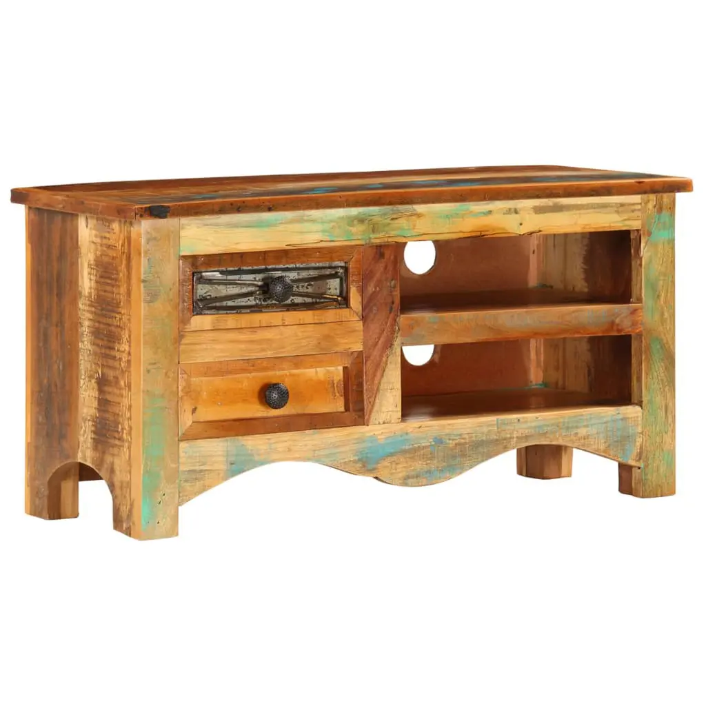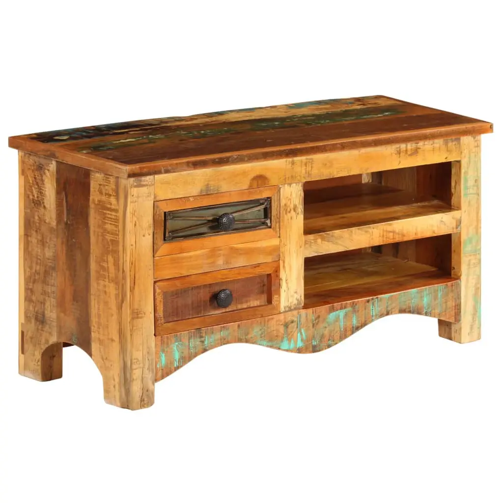 This TV cabinet is a beautiful mix of style and function that's sure to spice up your living room or home theater. Made from solid reclaimed wood, this multicolor piece isn’t just a solid storage option for your multimedia gear; it also works as a standout feature, effortlessly adding rustic charm to any decor. Ample Storage: This cabinet has tons of space inside with two traditional drawers and two shelves for keeping multimedia gadgets, books, or decor neat. Each drawer runs smoothly, making it easy to grab what you need. The variety of storage options helps you keep your space tidy and lets you show off your favorite things.Industrial Design: With its raw, factory-inspired look, this cabinet brings a unique vibe to any room. The polished finish adds rustic charm, making it a great fit for both vintage and contemporary interiors. This design is not just practical; it also serves as a decorative piece.Handmade Craftsmanship: Each cabinet is made with genuine care, showcasing the natural beauty of reclaimed wood. The quirks and variations that come with reclaimed materials add to its character, making sure each piece is one of a kind. This craftsmanship makes this cabinet functional yet a standout art piece.Versatile Functionality: Ideal for a living room or home theater, this TV cabinet fits various interior styles. Whether you're gearing up for a movie night or displaying decorative books and accessories, this piece adapts to your needs and enhances your space. It's perfect for adults wanting to merge utility with style.Size and Dimensions: Measuring 31.5 in long, 11.8 in wide, and 15.7 in high, this cabinet's compact yet roomy enough for your essentials. Its size makes it great for snug spaces without skimping on storage. Plus, it’s sturdy yet light enough to move around as needed.