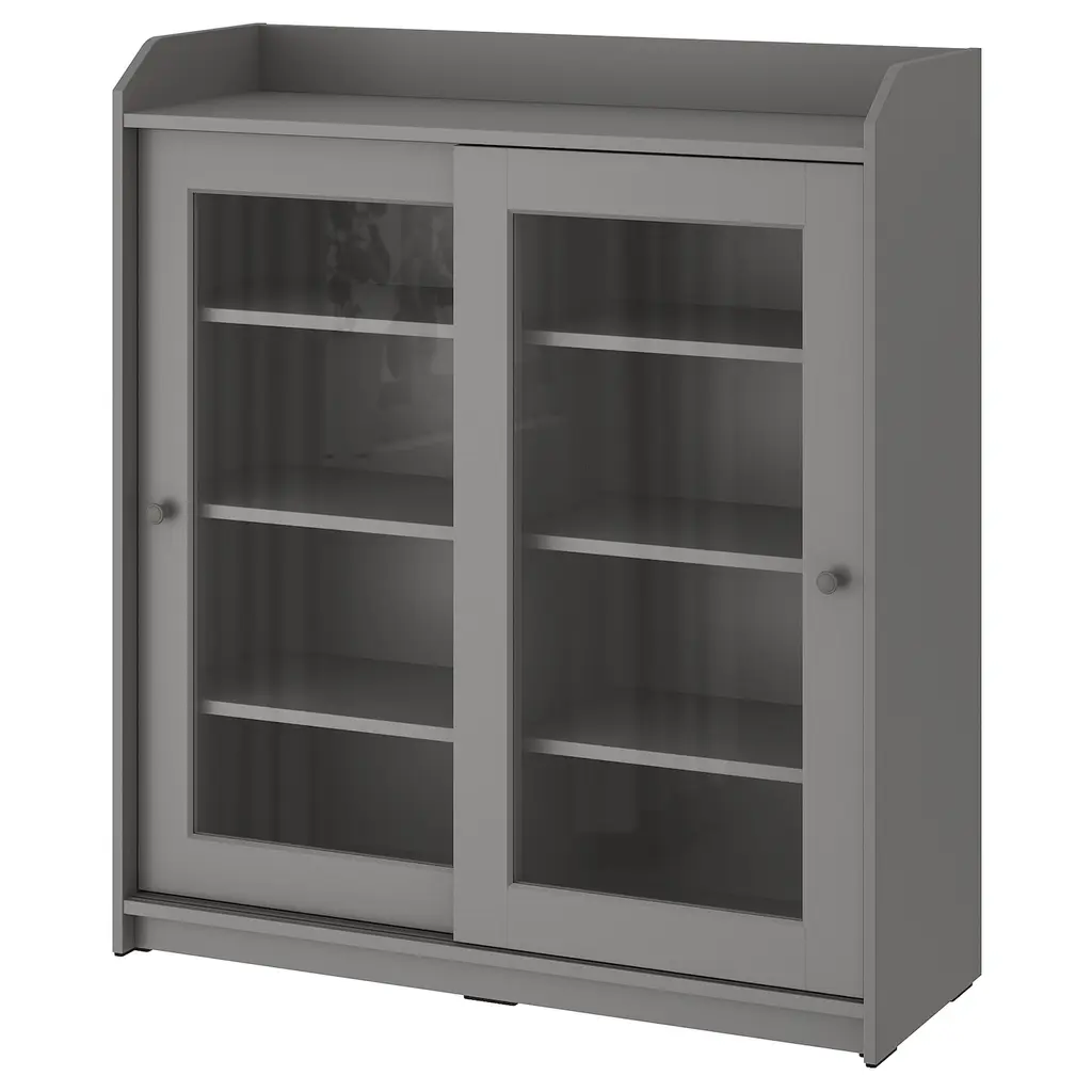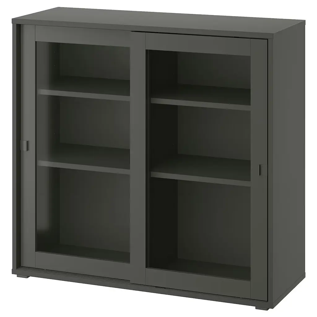 VIHALS Cabinet with sliding doors - dark gray 37 3/8x18 1/2x35 3/8 ". Use throughout the home, as a standalone or with other VIHALS furniture. The sliding doors do not take up any space when opened. Closed storage protects your things from dirt and dust. Handles included.
